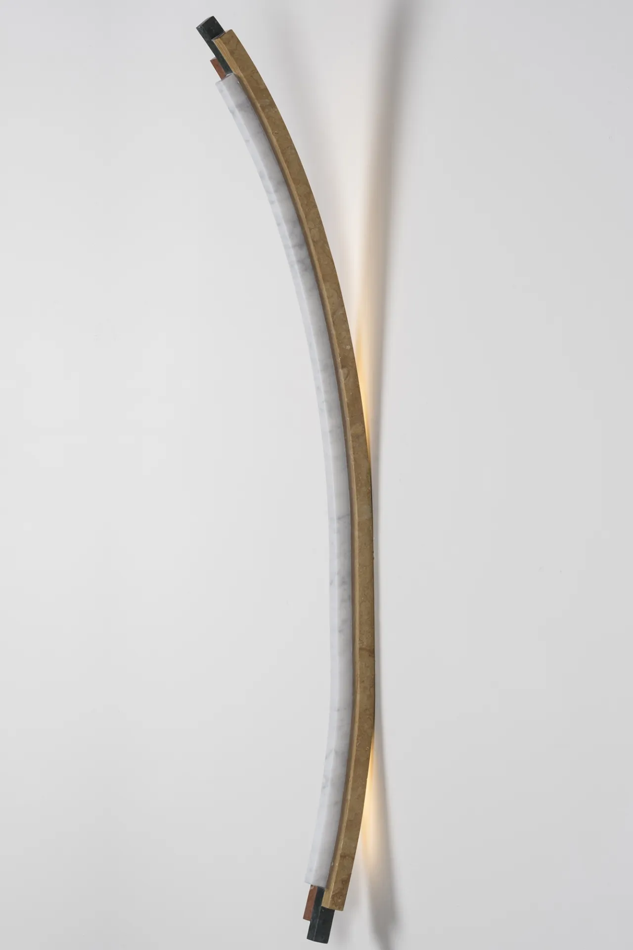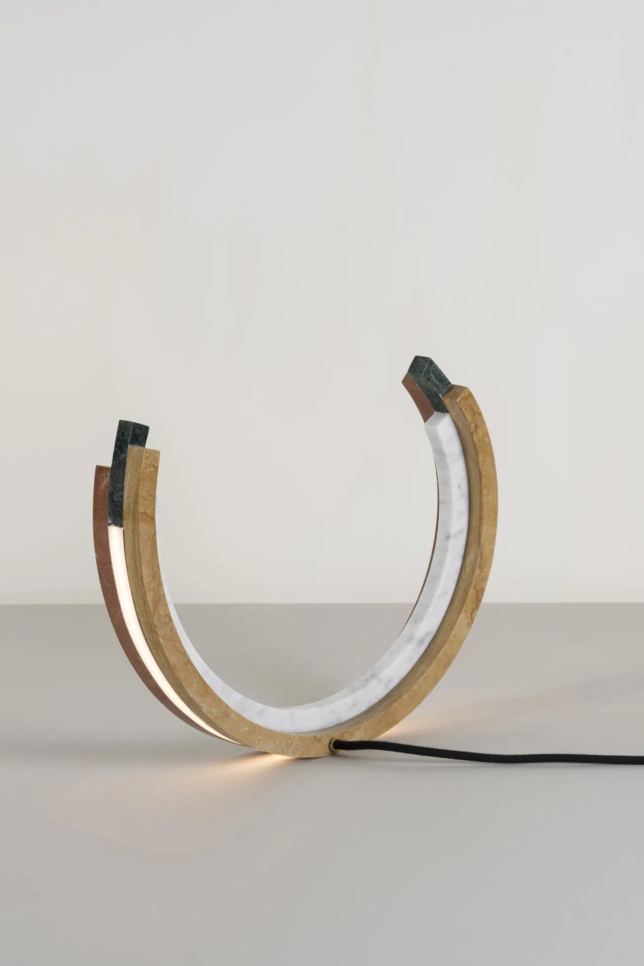 The collection features floor and table lamps, pendant and wall lights, and a large coffee table, all entirely made from marble beams of different forms, curvatures and types (White Carrara, Verde Alpi, Giallo Reale and Rosso Alicante marble).Each and every element of this lighting piece was designed to conceal the light source, so as to create an ethereal effect of bright colors that are lit from the inside.