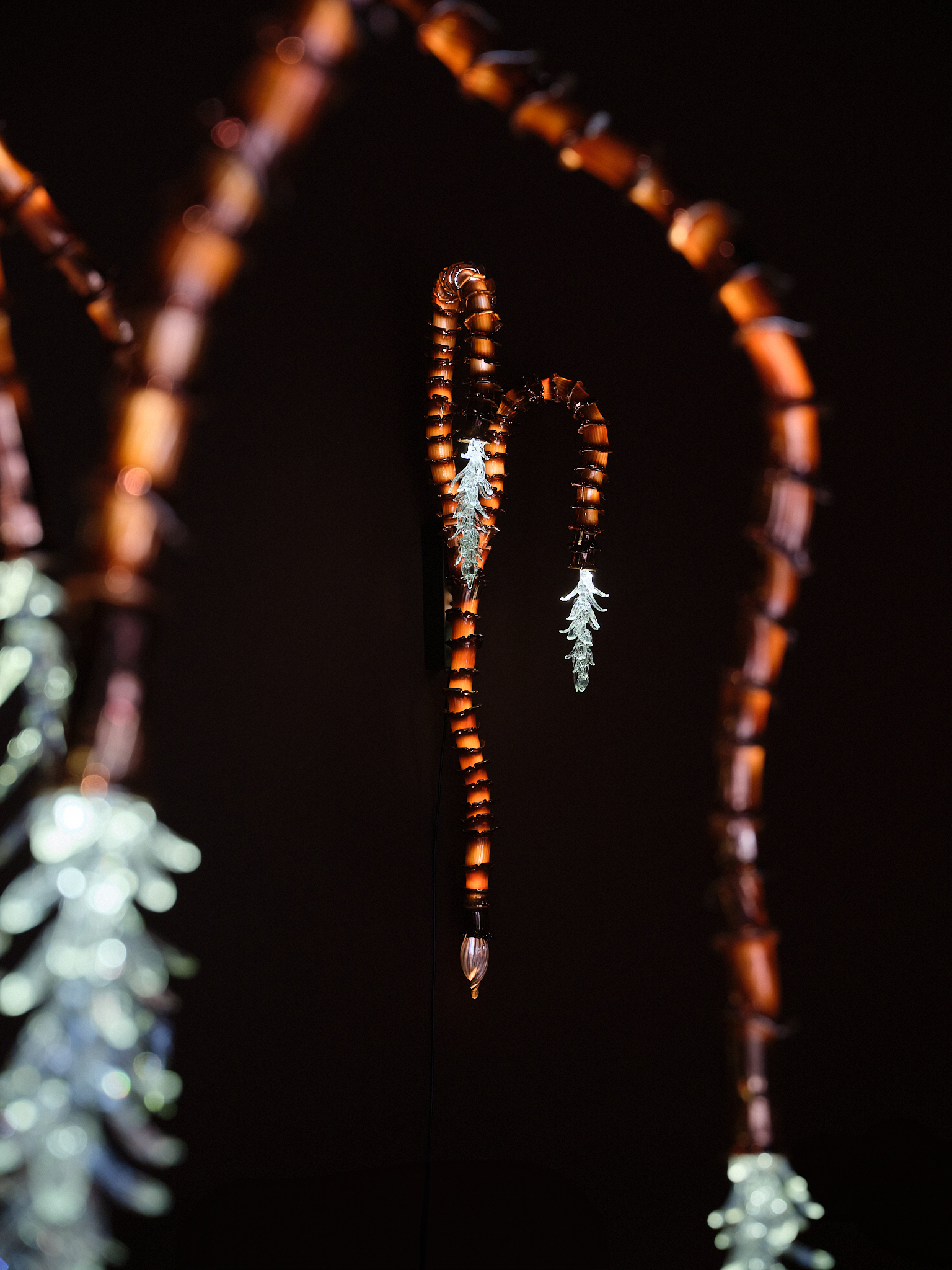 At the heart of ‘Amber Echoes’ is Pellizzari’s evocative ‘Rye Ergot’, a series of Murano glass sculptures inspired by the enigmatic rye plant, long associated with folklore and mysticism, know for its hallucinogenic proprerties, this plant has played a role in historical narratives of visions and spiritual awakenings. Through this selection of delicate, ethereal glass pieces, Pellizzari explores the intersections between art, transcendence, and altered states of consciusness. The sculptures, floating and suspended from above, evoke dreamlike visions, transporting visitors on a sensory journey that challenges conventions and invites reflection on the fragility of the human mind and the transformative power of art.
