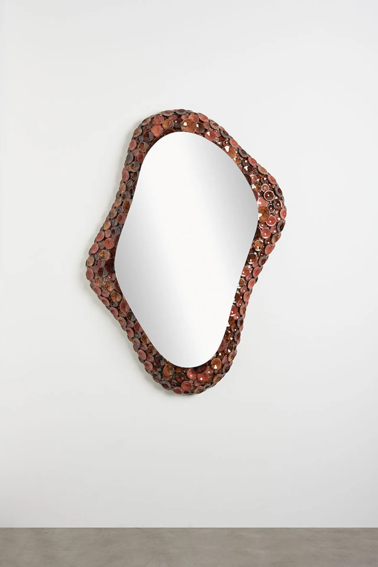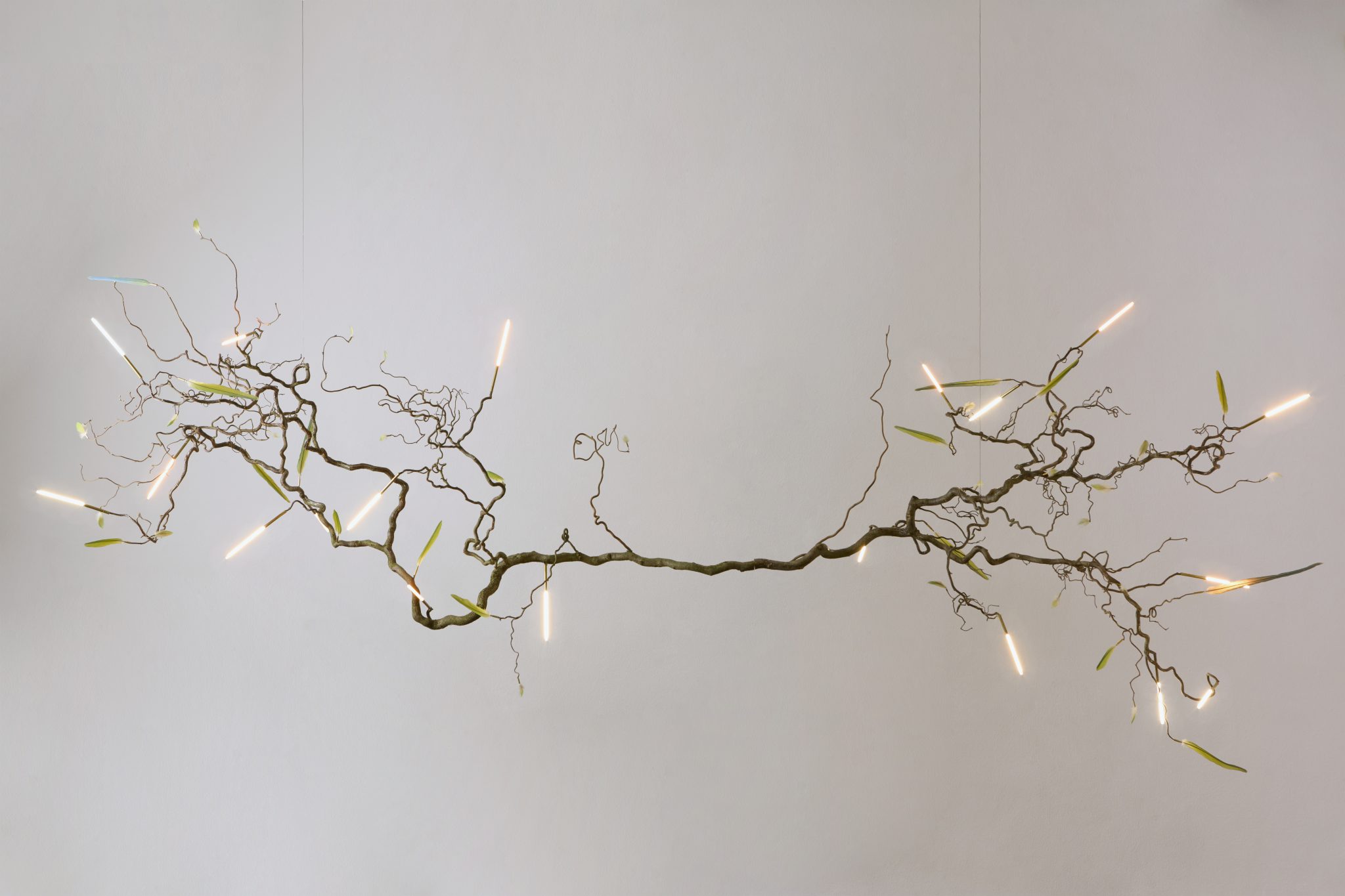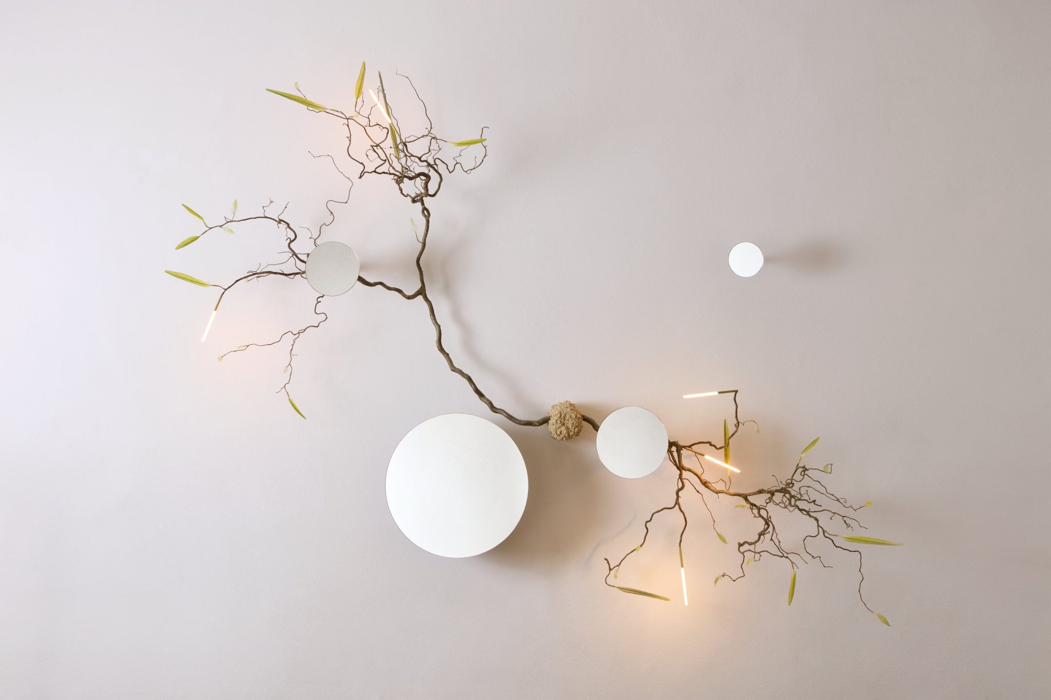 Maximilian Marchesani’s research stands in a special position. Fascinated by the search for harmony between technology and the organic world, his artworks evoke a continuous exchange between human disposition and global phenomena. For this special showcase, Marchesani presents a set of new light creations that softly warm the venue’s atmosphere, blending organic materials with technological elements. With the collection ‘Unproduced’, presented here for the first time, the artist reflects on his concerns about industrial disruption and the alteration of ecosystems. “I dream of a point of balance that seeks to bring together the irreparably contaminated natural world and the artificial world, which we can no longer imagine giving up.”, explains Marchesani. As part of the collection, the artist presents a mirror and four ceiling lamps, his signature pieces.