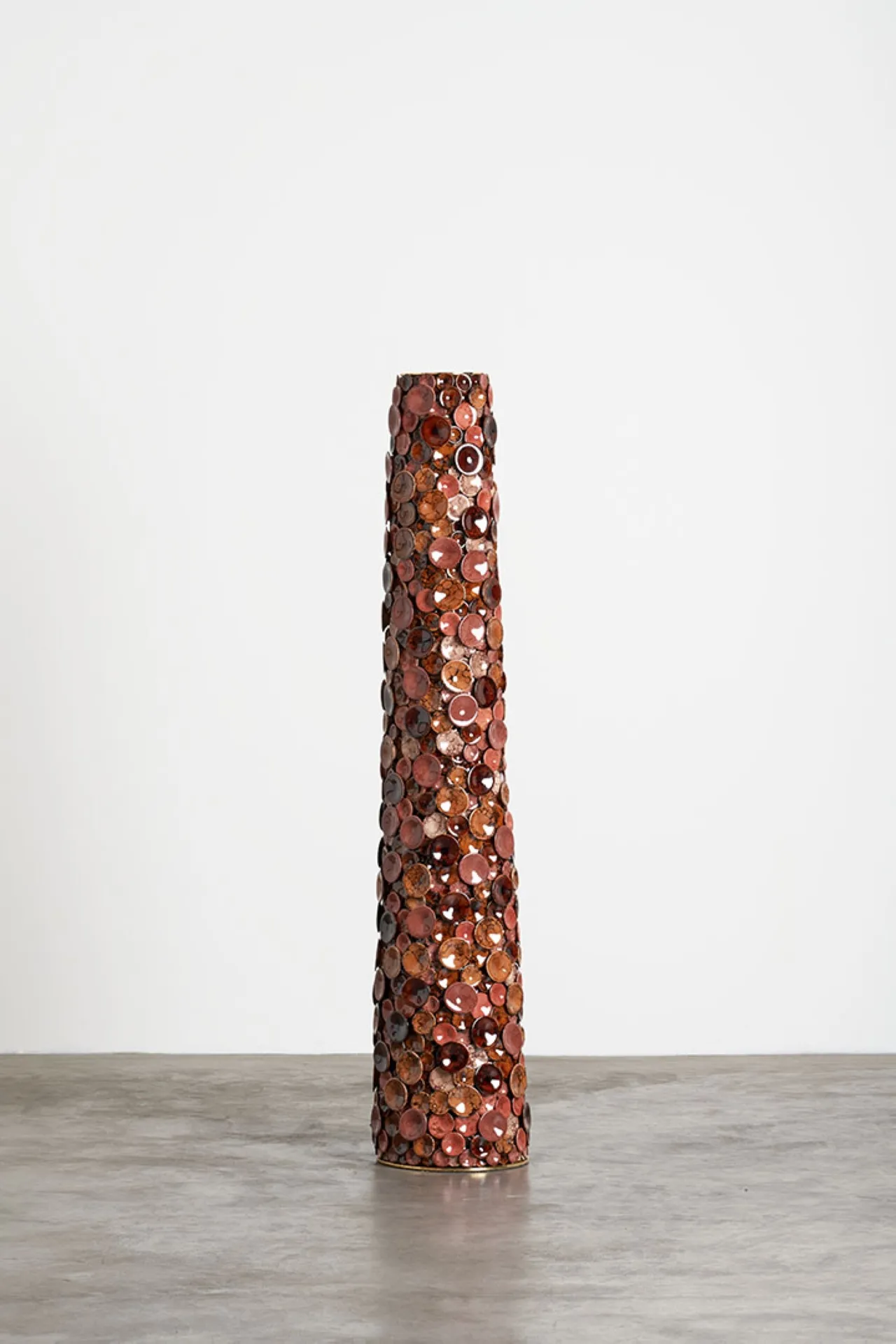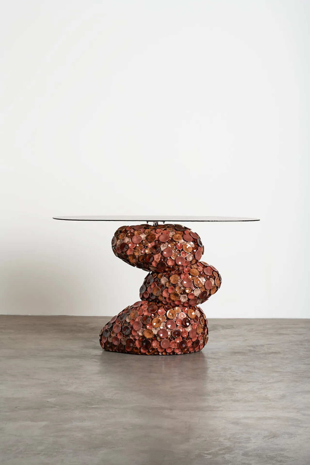 Abstract organic forms are adorned with an undulating skin of thousand of mounted ceramic disks, ranging in shades from deep brown emerald, mirroring the hues of the underbrush and lichen. The handcrafted approach, combined with a complex ceramic glazing process, brings these unique pieces to life, imbuing them with raw yet refined sensibility. The design processi s rooted in extensive research into natural elements, collecting stones, tree trunks, leaves, fungi, and lichens to construct a fictional terrestrial ecosystem. These organic materials are then digitized using a 3D scanner, then assembled, upscaled, and modelled to form a collection of functional sculptures, including a floor lamp, console, wall mirror, two dining tables, coffee table, and two side tables.