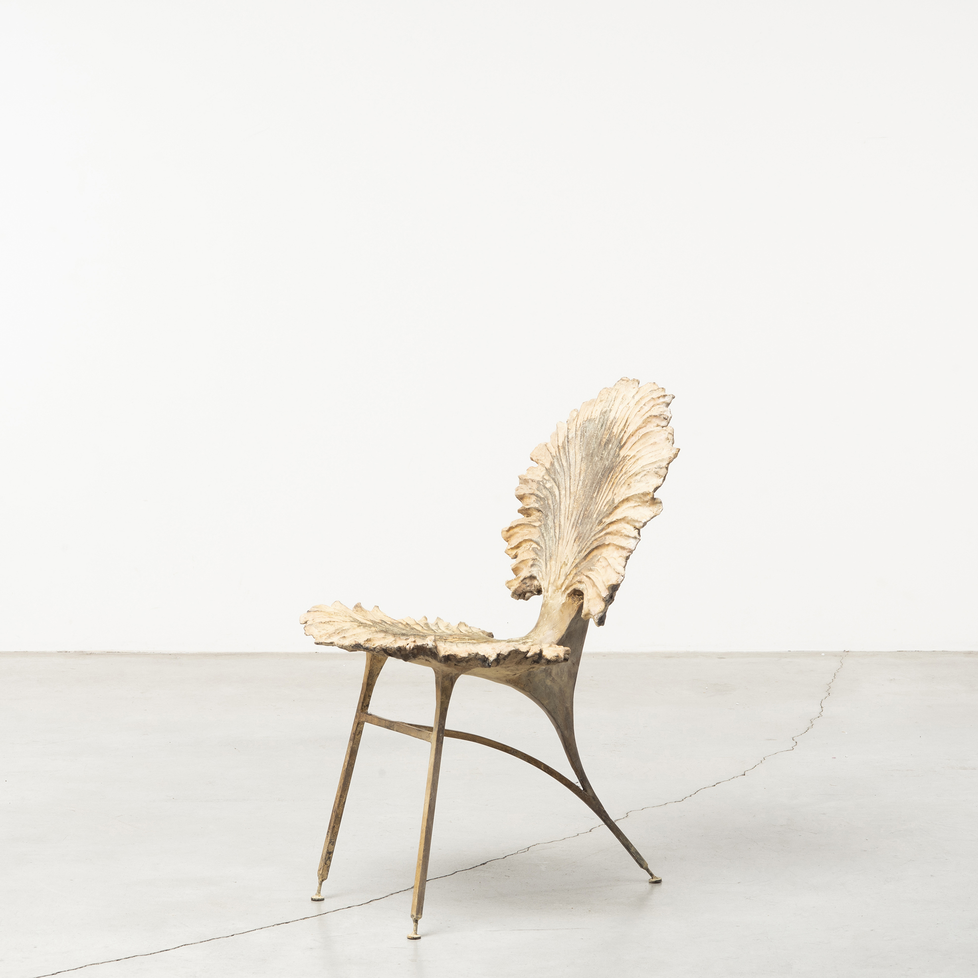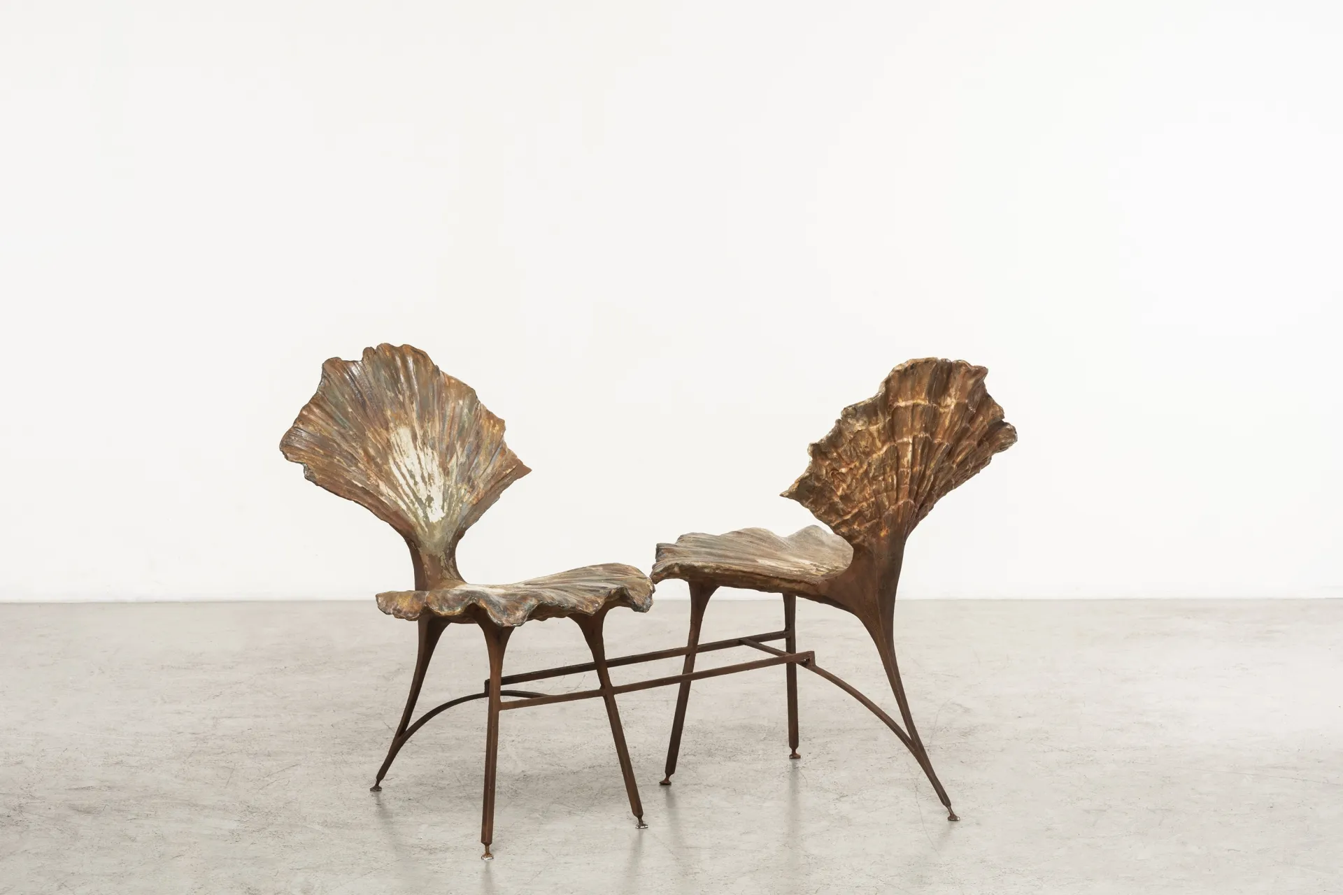 Etienne Marc’s ‘Still Life’ sculptural furniture completes the artistic landscape, presenting works suspended between function and transformation, evoking vegetal metamorphoses—timeless forms frozen in motion. Building on research initiated two years ago for Milan Design Week 2023, Marc’s latest approach shifts toward structural clarity and raw materials, moving away from Art Deco and Venetian grotto influences. Metals are sourced from ruins—shaped by time and decay—allowing imperfections like oxidation and fractures to define the design. Surfaces feature oil painting and bronze leaf, inspired by the patinas of Vi la Médici during Balthus’ time. The collection includes a low table, vase, stools, console, and, for the first time, a series of mirrors with acid-treated glass, embedding botanical imprints. “Mimicking nature requires spontaneity and mistakes; there’s logic in organic construction,” says Marc. Each piece balances sculpture and function, exploring the tension between nature and design.