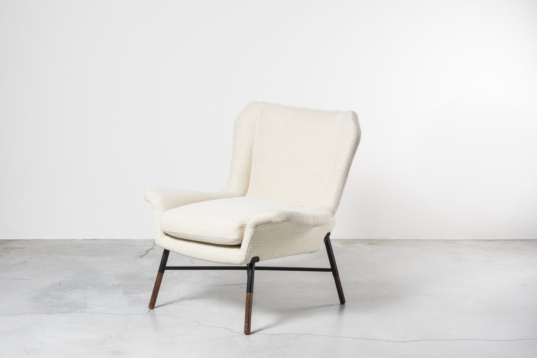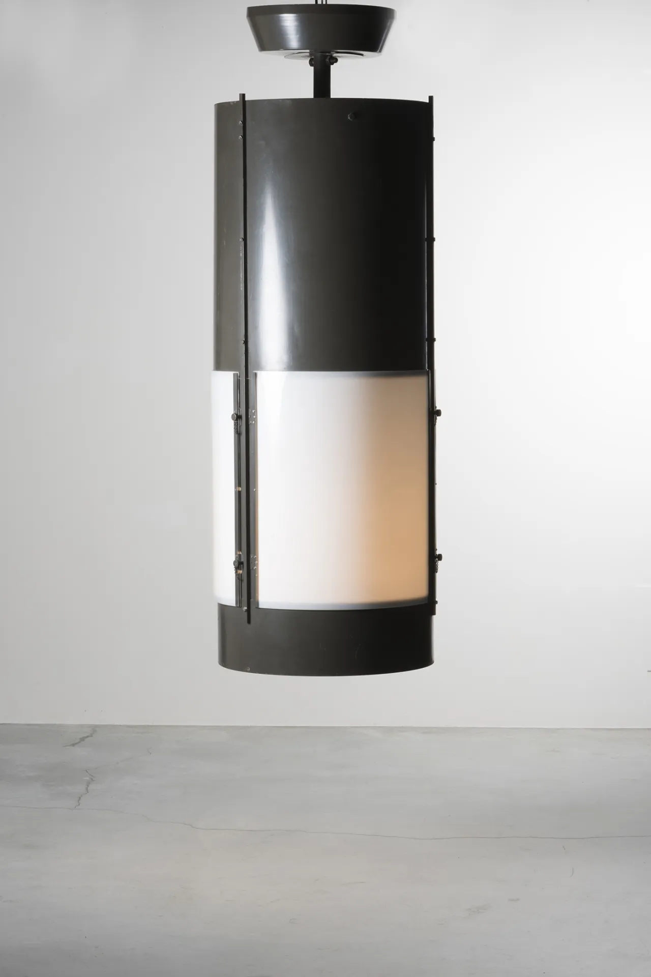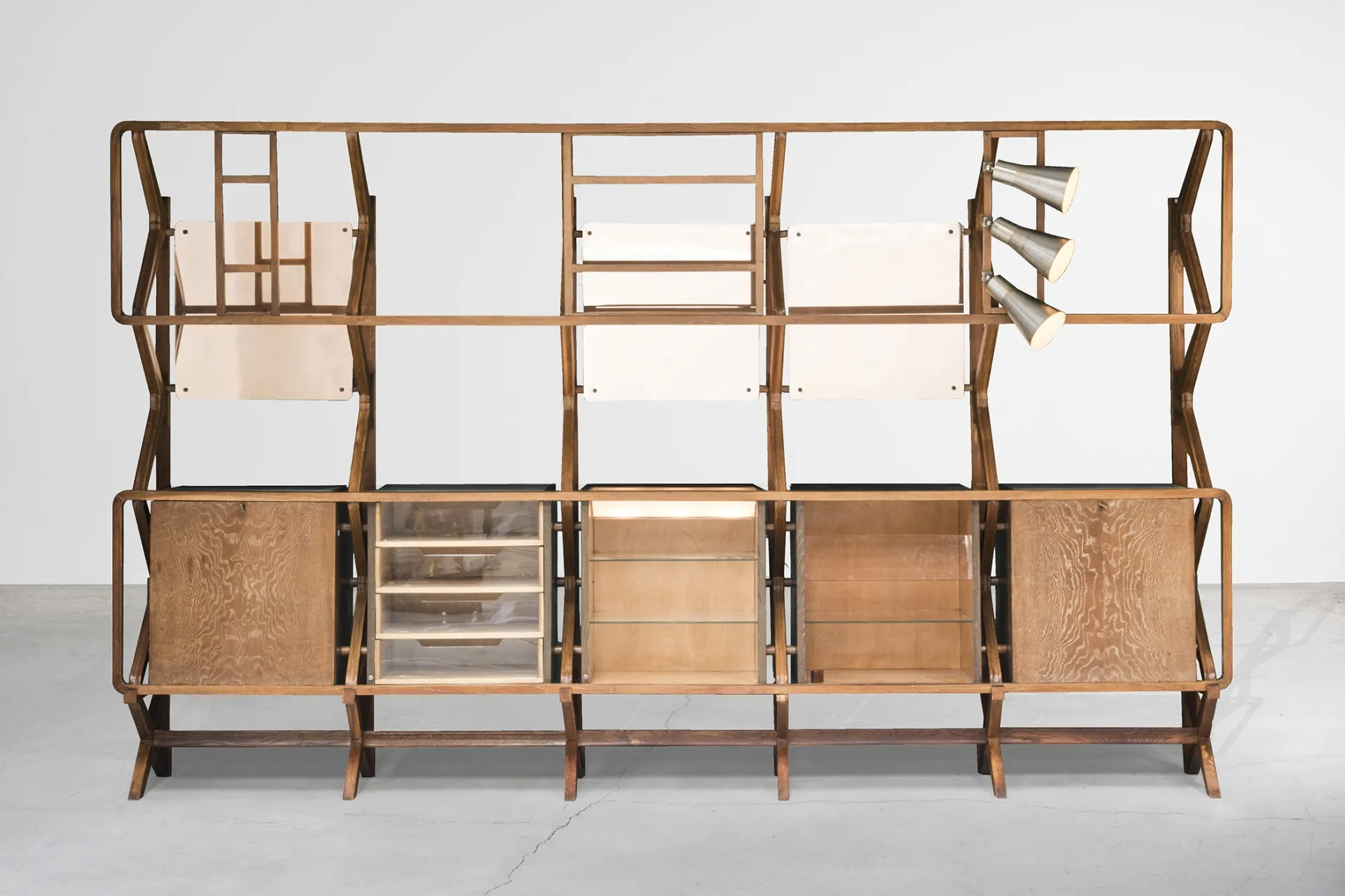 Far from being a mere complement, this piece is a symbol of the design approach and poetics of BBPR, where the functional parts of the piece become simultaneously expressive, fluid and elegant. The setting is enhanced by a selection of contemporary projects: two low tables from the Atollo series by Massimiliano Locatelli, the Crossette floor lamp and the Parachute suspension from the Fontana Amorosa collection by Michael Anastassiades, and the Petra carpet designed by the Colombian atelier Hechizoo of Jorge Lizarazo.