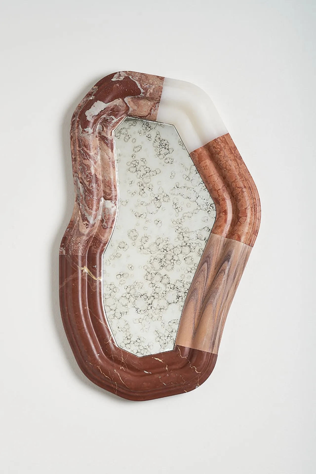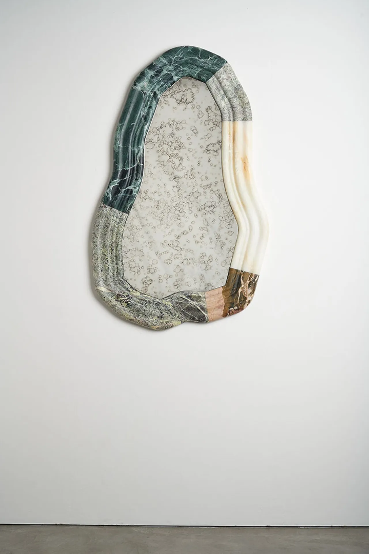 sea foam, gives depth and movement, recalling the perpetual play of waves on the shore—a tribute to the Faraglioni of Capri, timeless symbols of beauty and power. The exhibition continues with the refined console from the same collection, enhanced by the presence of two marble mirrors from the ‘Grottesche’ collection, which amplify the perception of space and the emotional atmosphere.