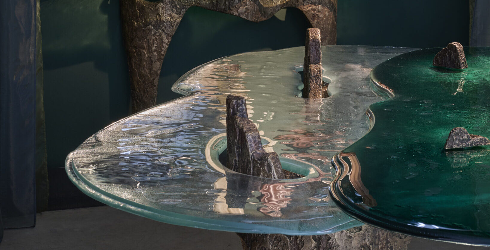 At the Nilufar Depot, a play of transparencies and depth welcomes visitors, guiding them through a unique sensory journey. At the center of the space, the true protagonists are the console and the imposing Faraglioni table, emblematic examples of Etereo’s craftsmanship and material research. The table’s sturdy bronze legs evoke the iconic rock formations, supporting glass tops that, once melted, are shaped to acquire a fluid consistency. The texture, inspired by