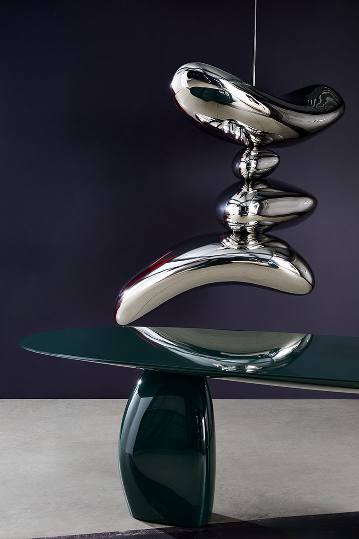 Composed of four highly polished stainless steel volumes, this mobile sculpture rotates freely in a celestial dance, reflecting and refracting light as it hovers in space. The Torii desk in a deep green polished, symbolizes a threshold between the earthly and the divine, a grand gesture for one’s thought and creation. Its rich hue finds harmony in the sculpted Waterfall sofa, upholstered in a dark green palette that evokes depth, serenity, and quiet sophistication. Together, these pieces form an evocative landscape, an office reimagined as an artistic sanctuary, where every element is imbued with movement, meaning, and myth. “As above, so below; as within, so without.” — A principle echoed in Hermetic philosophy, often linked to Greek mystical thought. In this poetic fusion of function and art, Gaon invites us to inhabit a space where mythology, movement, and materiality converge—transforming the everyday into a realm where boundaries dissolve, and creation becomes infinite.