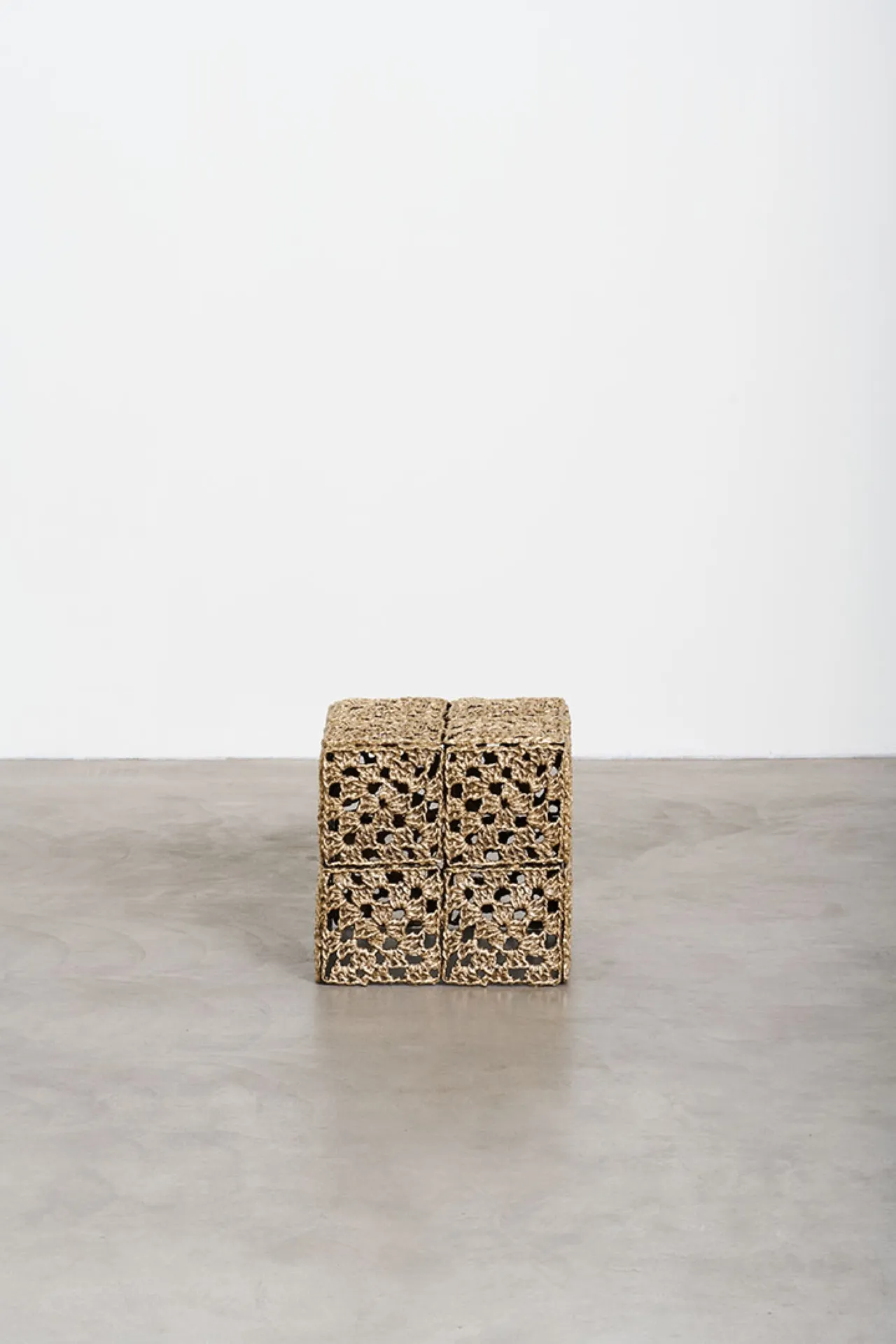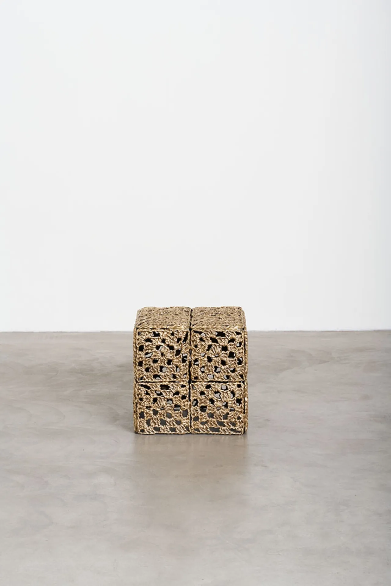 The ‘Golfo’ low tables, inspired by the Gulf of Naples, are another highlight of the collection. These two pieces fit perfectly together to form a Yin and Yang shape, symbolizing the balance between two forms that are independent yet complete when united. The Poppea chaise longue draws inspiration from a fragment of a Pompeian fresco, while revisiting the traditional Roman triclinium in a modern context. In addition, the collection features two mirrors, ‘Narciso and Echo’. Inspired by the ancient myth, these two pieces reflect the interplay of ornamentation and restraint with their elaborate bronze crochet frames. Narciso, the more intricate of the two, features a full frame of bronze crochet that, as the myth recalls, flows like a raging river, embracing and entrapping the mirror’s edge. Echo, in contrast, is more restrained, subtly mirroring Narciso’s flowing shape at the opposite corner of the glass, evoking the fading presence of its mythological namesake. Finally, the Tapestry design featured in the exhibition continues Hicks’ exploration of scale and abstraction. By enlarging this simple motif, Hicks creates a new interpretation of texture and pattern, elevating the humble craft into something larger than life.