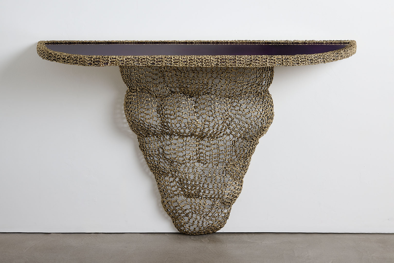 Among the standout pieces in the collection is the ‘Conchiglia di mare’ console, where bronze crochet pieces are meticulously arranged together to create a base that evokes an archaeological find such as a shell or artifact from the sea. The console’s top, made in linen and hand-painted in a deep mauve hue, is encased in resin, giving the object an atmospheric depth that evokes the sense of something both familiar and unknown—as if it has always existed but has now been reimagined.