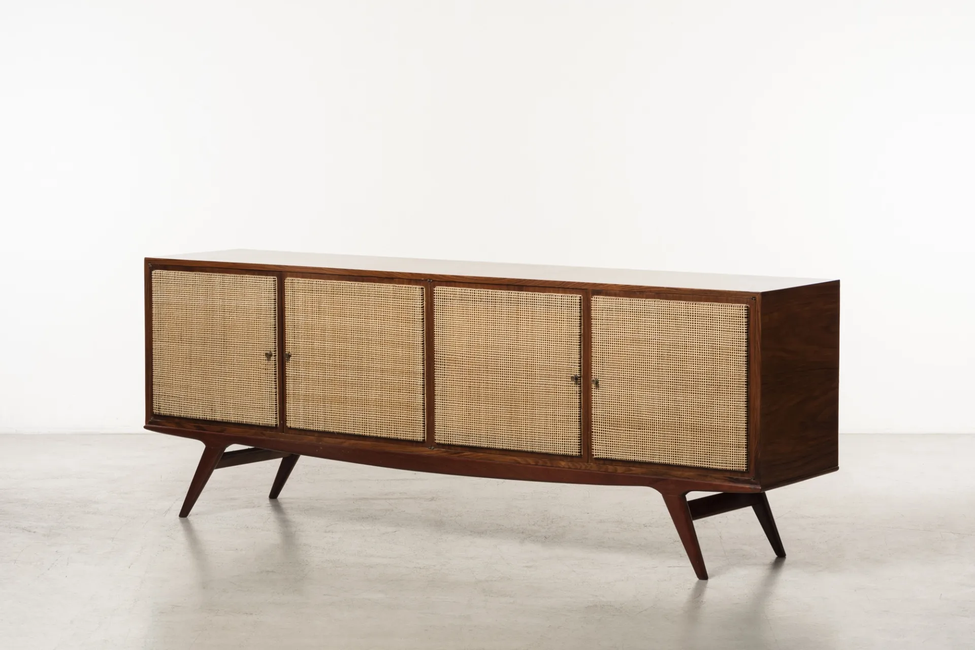 At the Nomad St Moritz fair, Nilufar Gallery creates a rare parallelism with iconic pieces of Brazilian design from the second half of the 1900s and contemporary works. Martin Eisler & Carlo Hauner‘s storage cabinet, a pair of armchairs model Concha by Joaquim Tenreiro and two armchairs by Percival Lafer are juxtaposed with the hand-knotted wool rug Chromosome-P by Caturegli Formica.