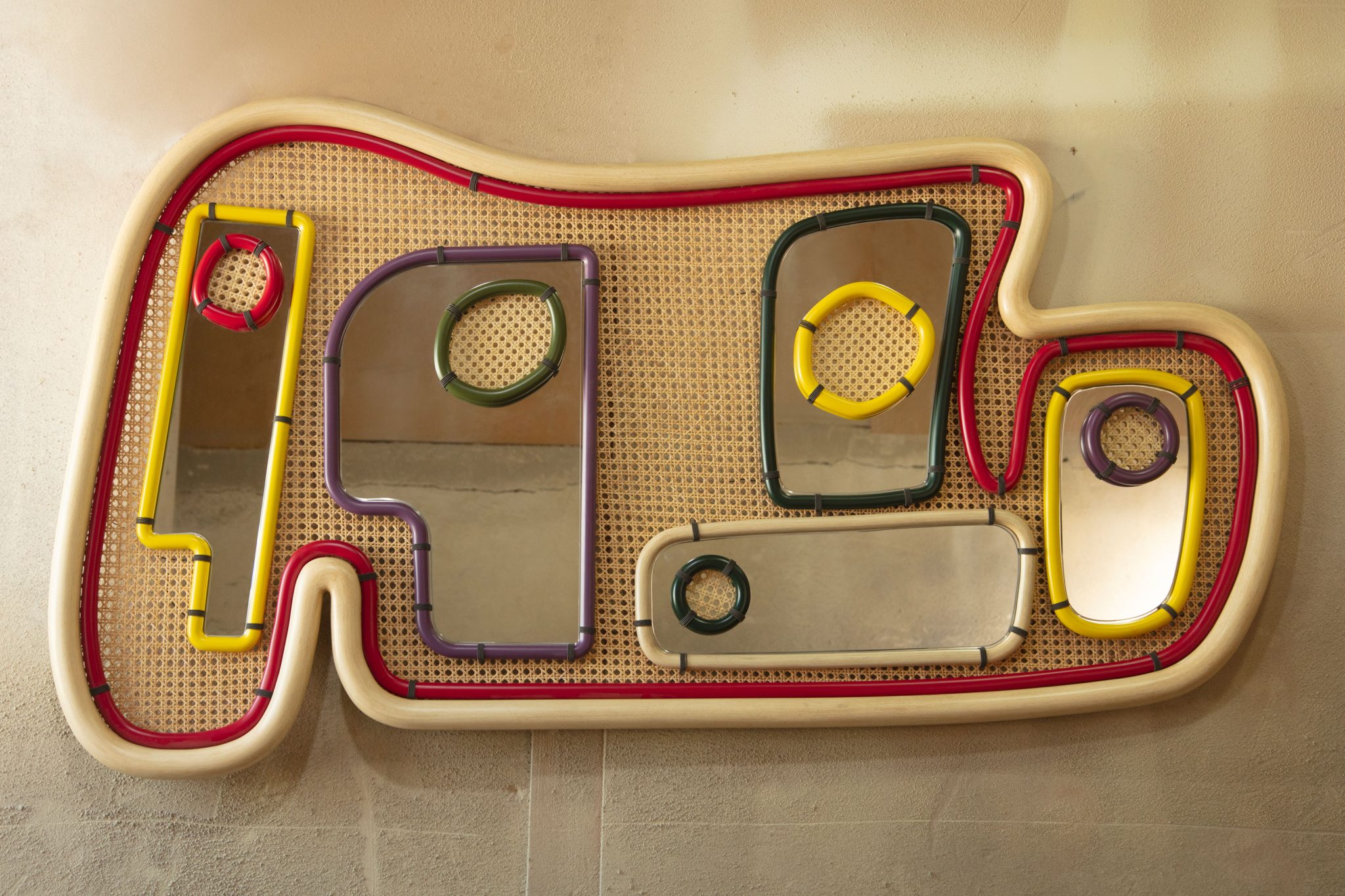“The installation at Nilufar Gallery is an invitation into the studio’s world: a world of wonders morphing natural elements into a fantastic and enchanted state of being. The flora modular bench and its especially customised fabric, reminiscent of psychedelic illustrations, gives the viewers all the physical ingredients needed to step into the perspectives on the wall, that on its side distorts reality while creating a new one. From the same bench, you can experience the physical dimension and an entirely different one” states El Mays.
