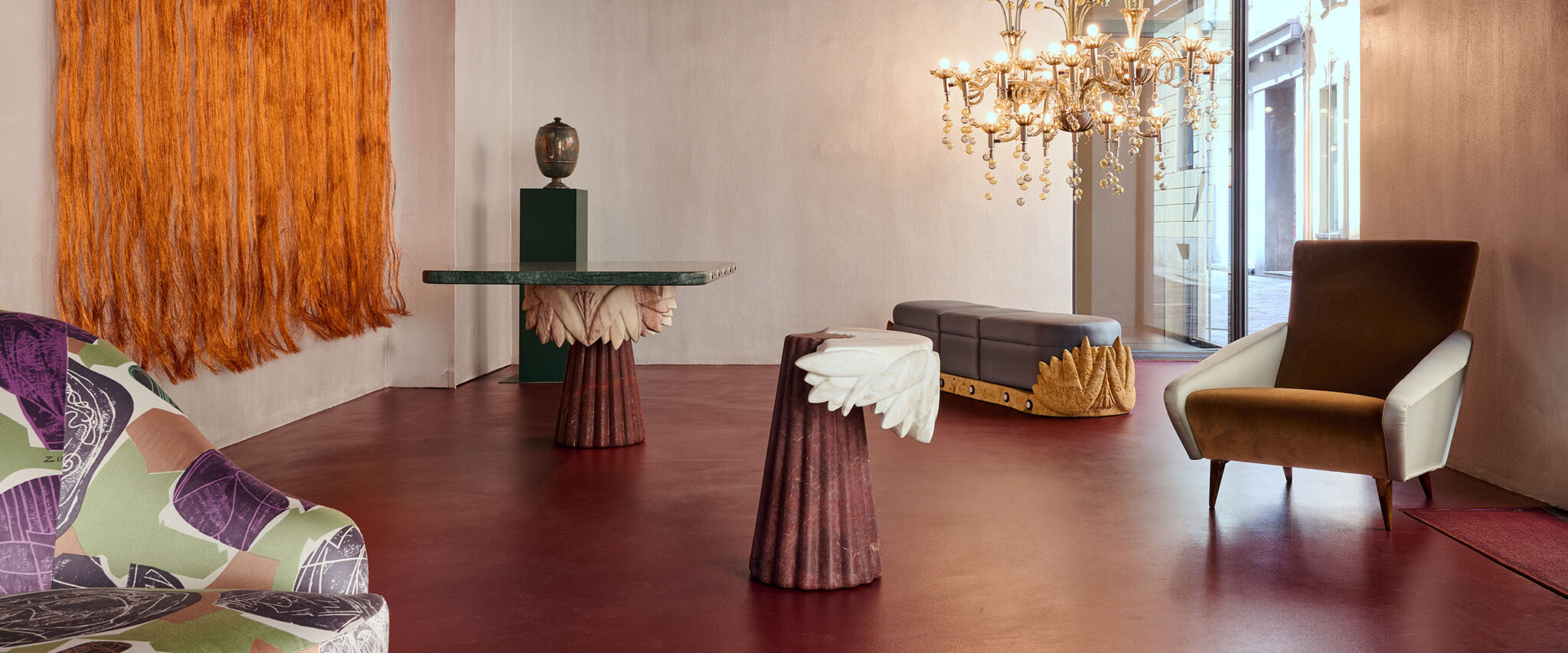 Sunlit Bloom is an imaginary garden where design, art and nature meet in a fusion of precious materials, abstract floral forms and architectural memories. A visual and tactile narrative in which each object on display is a rare flower: precious, elaborate and undeniably scenographic. The installation celebrates opulence as a conscious language, as an aesthetic choice capable of reflecting desire, identity and profound beauty. The rich decorativism becomes the art of refined excess, warming the golden atmosphere of a dreamlike landscape immersed in the urban dimension with golden reflections and oriental suggestions. A contemporary baroque where detail is sacred, matter is the protagonist, form becomes a spectacle. Gold, marble, glass, luxurious fabrics, worked metals: everything contributes to building an aesthetic of magnificence that is at the same time a symbol of balance, light and transformation. Sunlit Bloom is a tribute to the decorative power of design and its most sumptuous, theatrical, seductive soul.