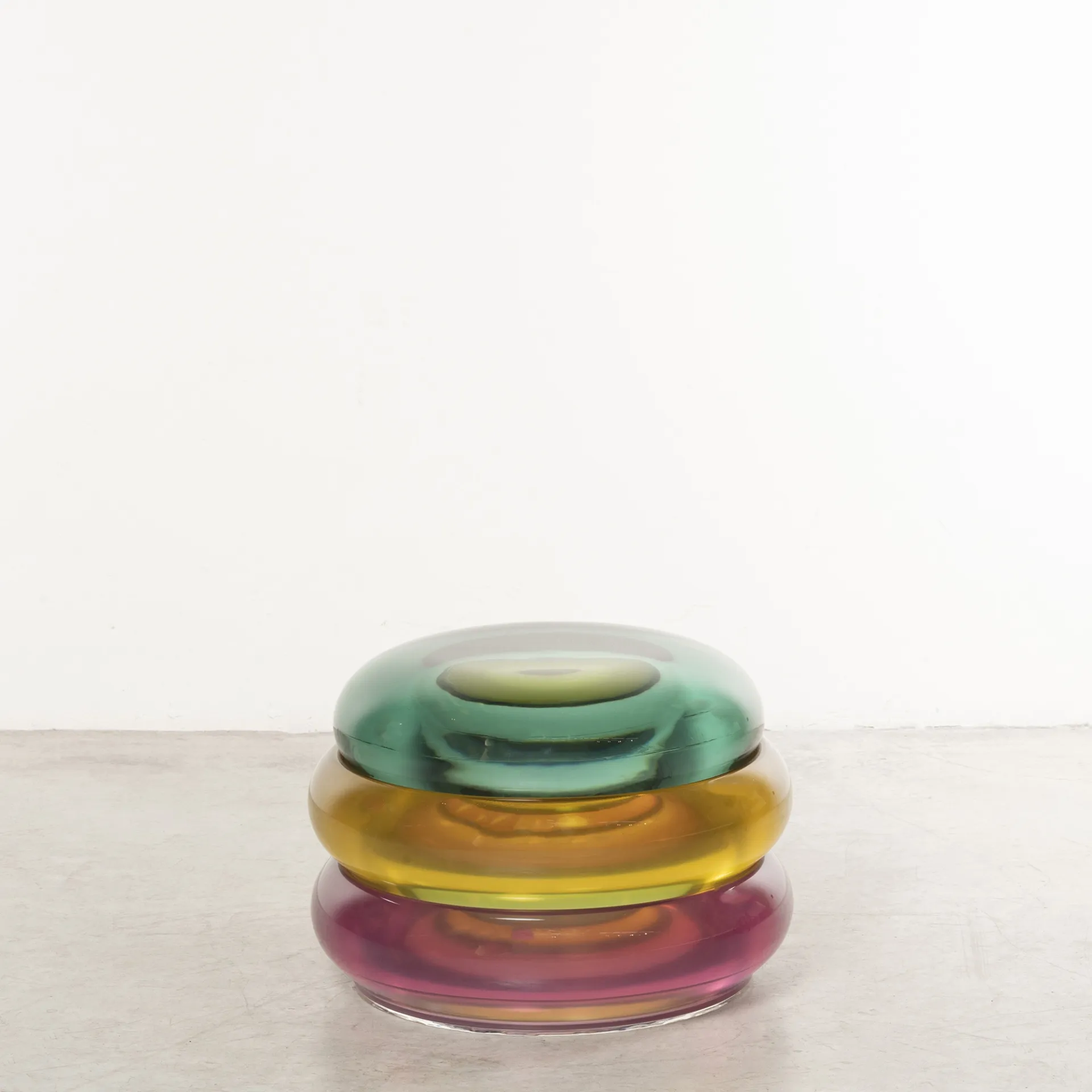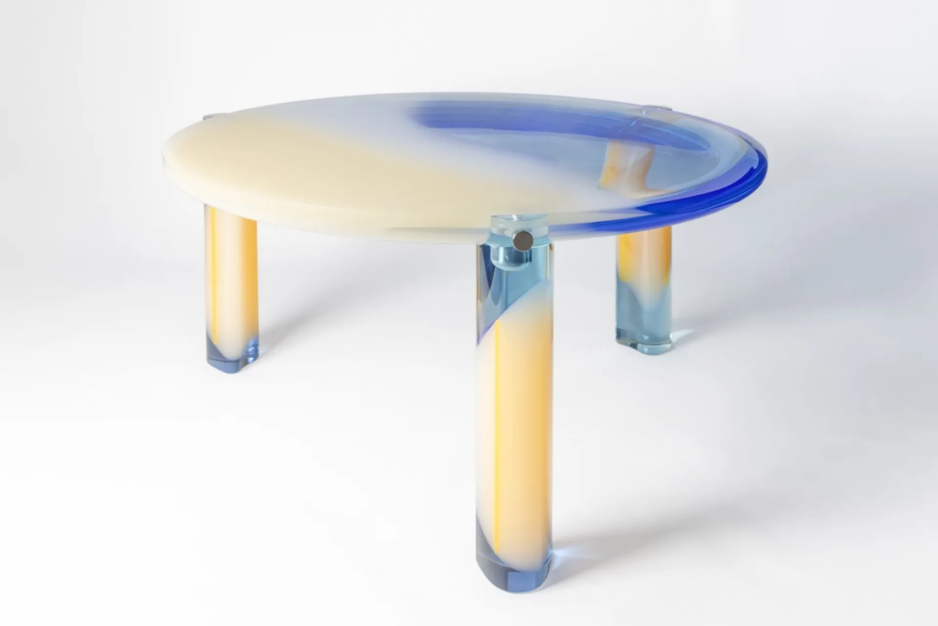For Milan Design Week, Draga & Aurel present a new exclusive project for Nilufar. Witty, hypnotic, and reflective, ‘Tinted Hues’ explores the potential of materials – epoxy resin and Lucite, first and foremost – and their ability to respond to light and color. In a sophisticated atmosphere, almost frozen in time and marked by a playful, light-hearted mood, you’ll encounter handmade collectors’ items featuring smooth forms and subtle hues. Combinations of pastel colors and opal inserts come together in evocative, almost spellbinding nuances. “In this new project for Nilufar, we had fun experimenting with materials and allowed ourselves to be swept away by the beauty of colors and their ability to convey serenity.” comment Draga & Aurel. New 2024 products made exclusively for Nilufar – the Glaze table, Dewdrops coffee table, and Puffed pouf – are being presented together with a selection of art design objects as part of the Candy Box and Space Couture collections, proposed in new colors.