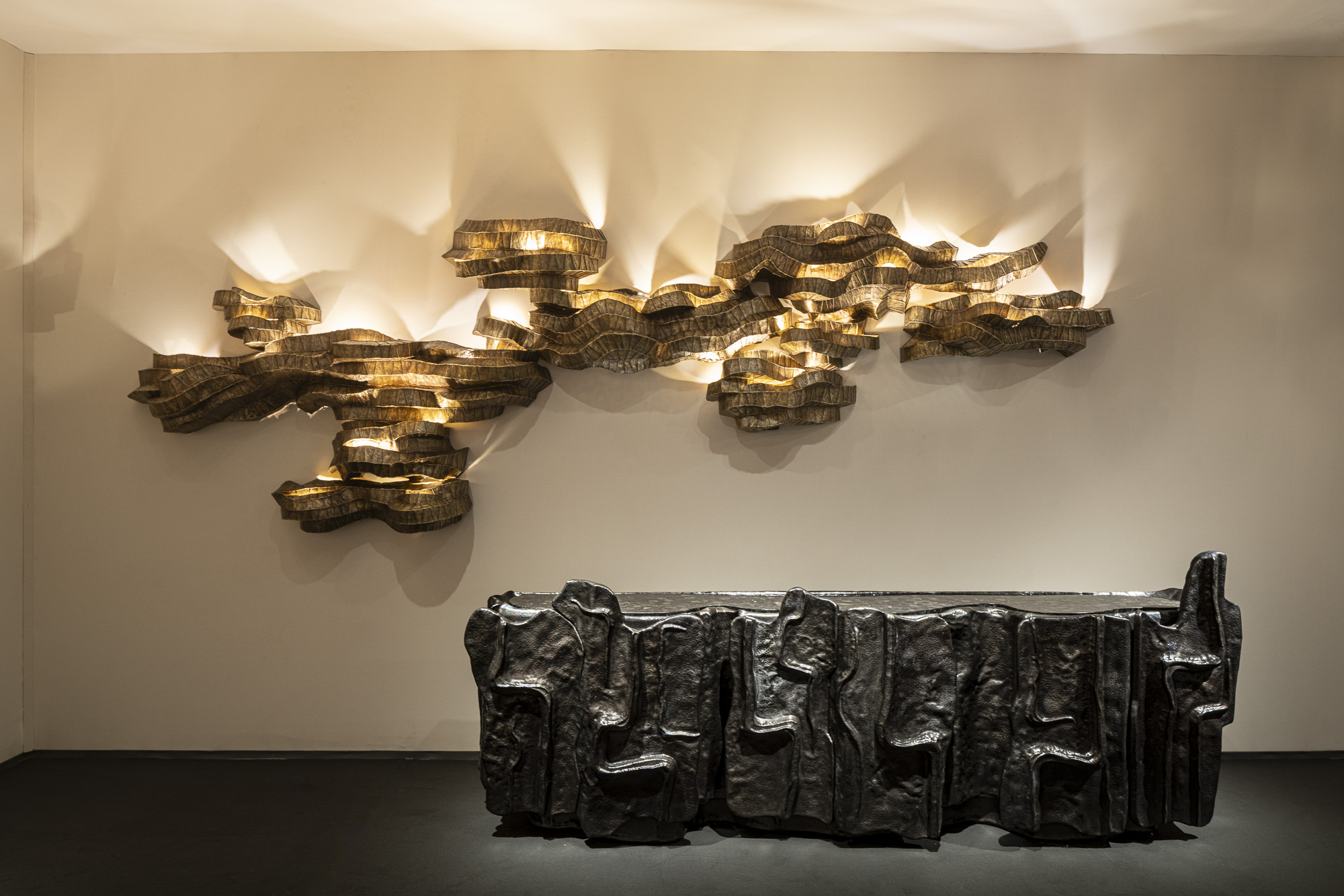 A highlight of the installation, the Thar wall sconces stretch across two walls in a 16-foot configuration. Their rippling surfaces, clad in hundreds of individually hand-cut and hammered brass segments, evoke the undulating dunes of India’s desert landscapes, as a meeting of material rigor and expressive form.