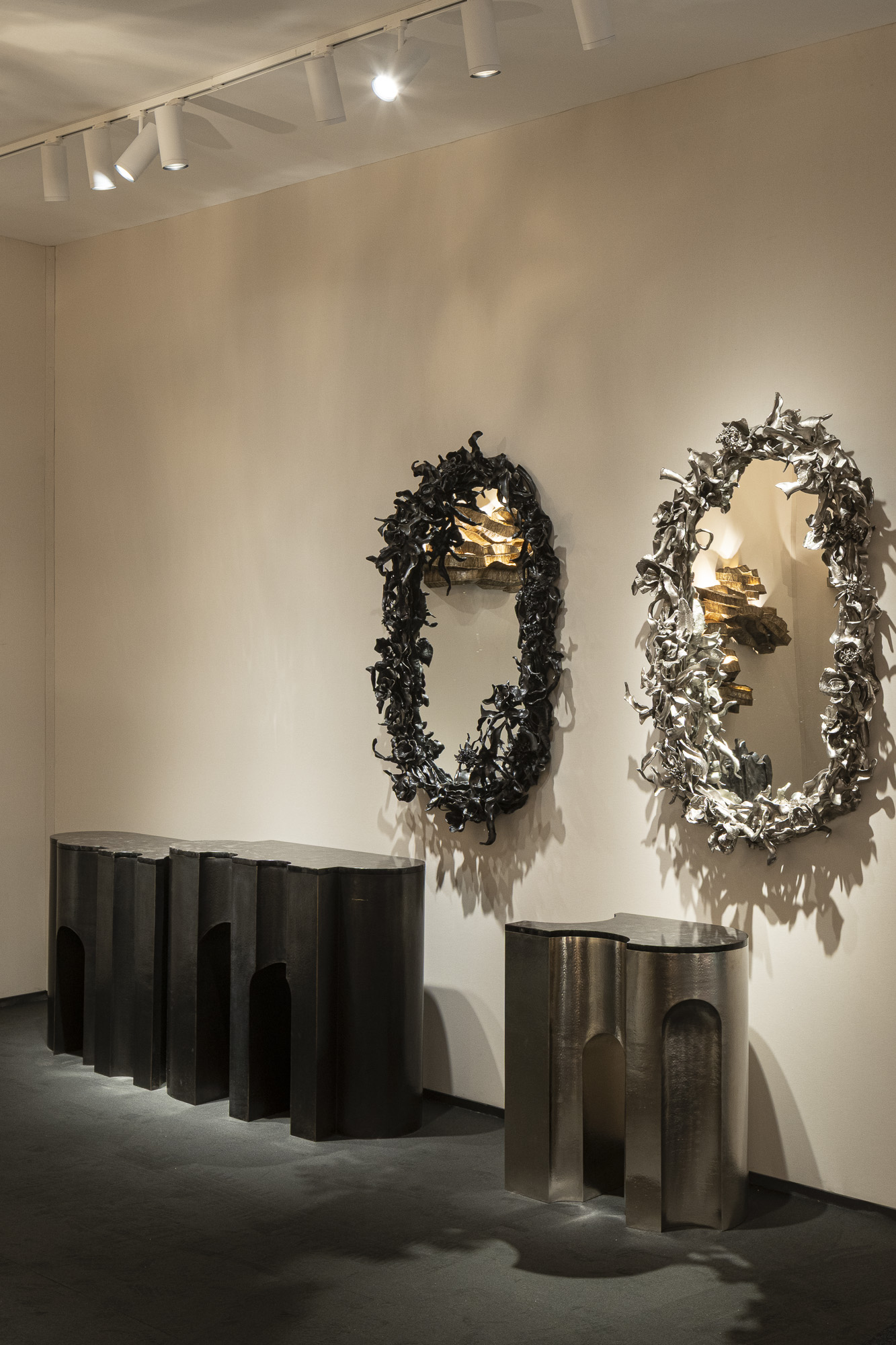 The collection spans lighting, mirrors, and monumental furniture. Central to the display is the Bagh series, inspired by the flora of India’s historic gardens. Delicately decorative and technically complex, these works are counterbalanced by a group of architectural forms, including the Palazzo and Grand Castello consoles, and the Mesa cabinet, each rendered in patinated or nickel-finished brass using advanced repoussé and hollowed joinery techniques.