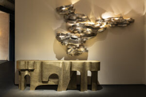 The collection spans lighting, mirrors, and monumental furniture. Central to the display is the Bagh series, inspired by the flora of India’s historic gardens. Delicately decorative and technically complex, these works are counterbalanced by a group of architectural forms, including the Palazzo and Grand Castello consoles, and the Mesa cabinet, each rendered in patinated or nickel-finished brass using advanced repoussé and hollowed joinery techniques.