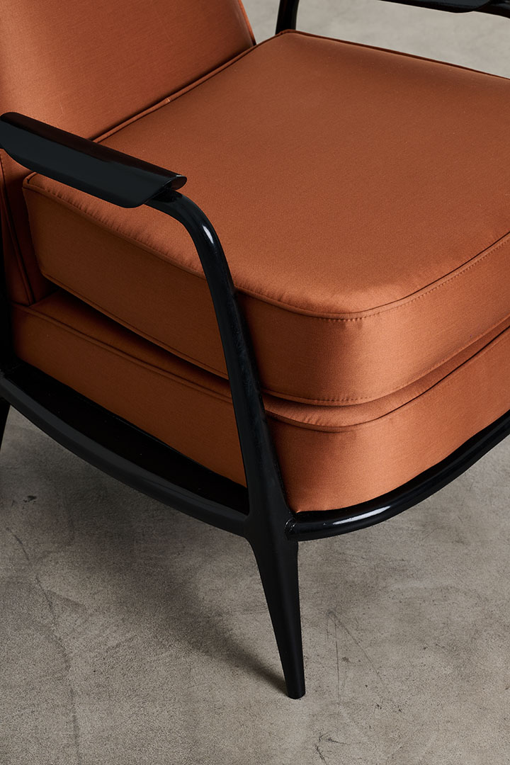 Designed in Brazil in the 1950s, this vintage armchair by Giuseppe Scapinelli showcases the distinctive modernist sensibility of its time. The legs and base are crafted in caviuna, a tropical hardwood valued for its warm, rich tones, while the frame is upholstered in a warm satin fabric in copper tones, creating a harmonious balance between sculptural structure and comfort. The design reflects a thoughtful fusion of natural materials and refined craftsmanship, resulting in an object that is both elegant and evocative.