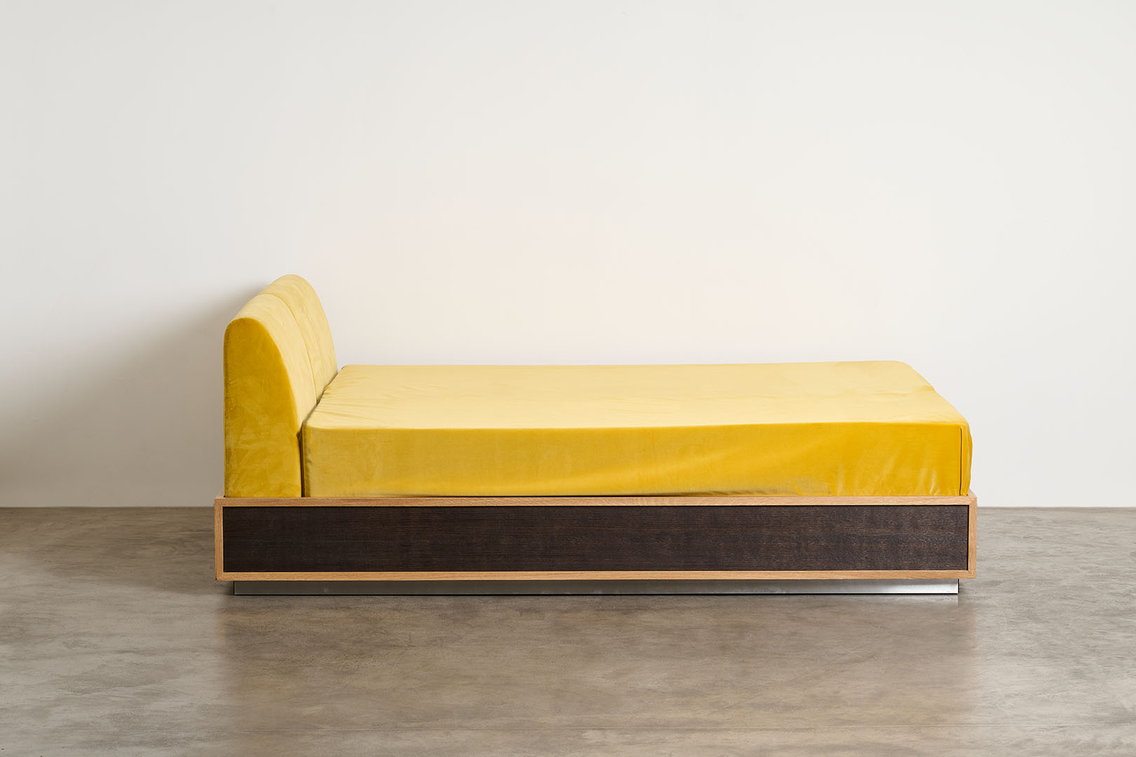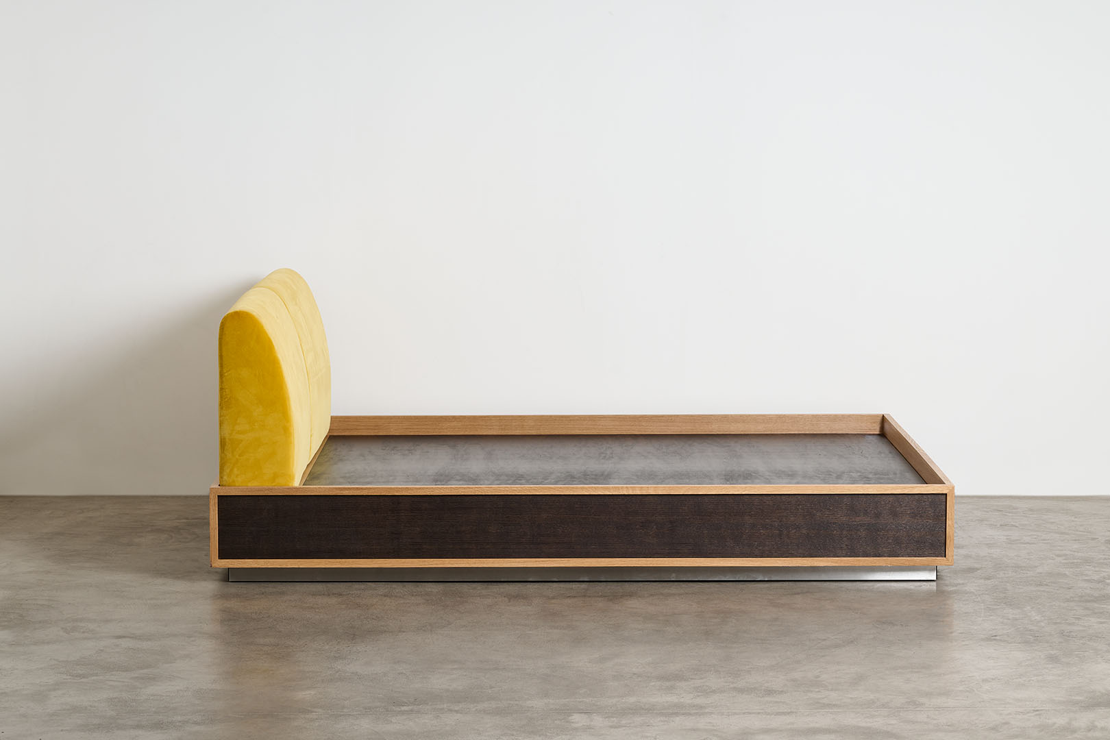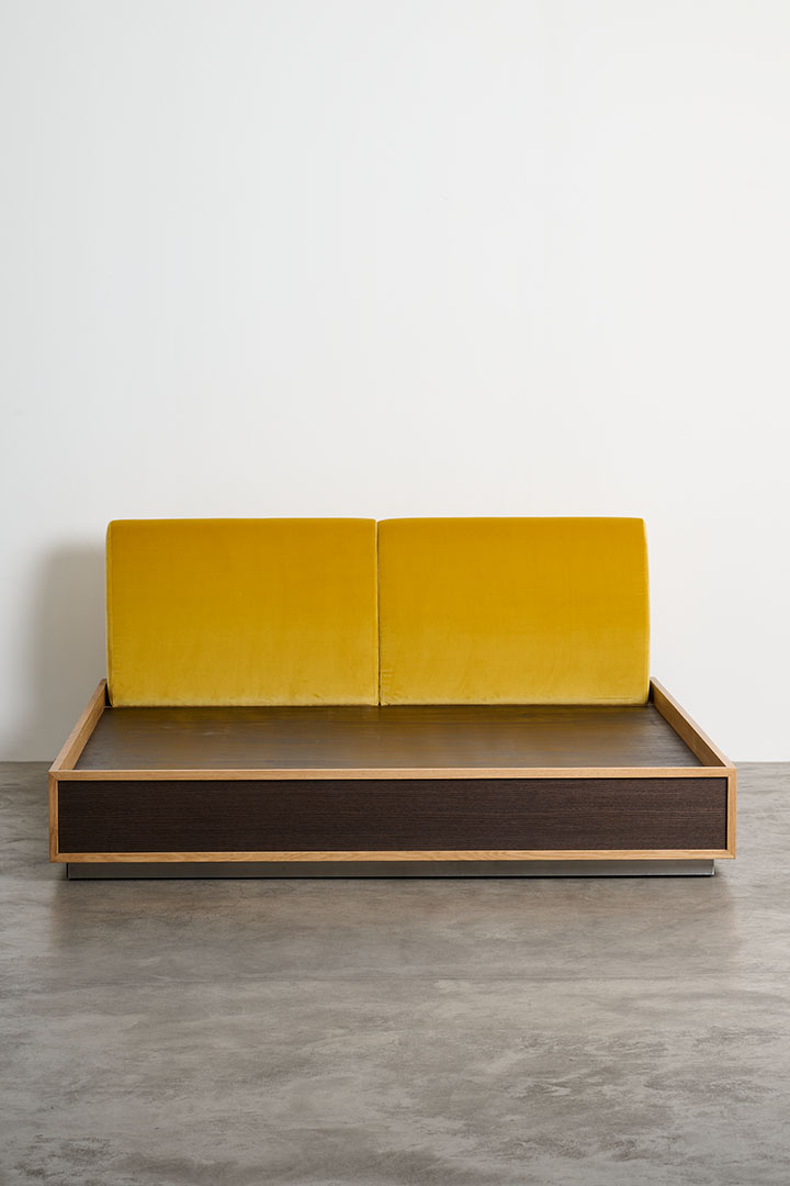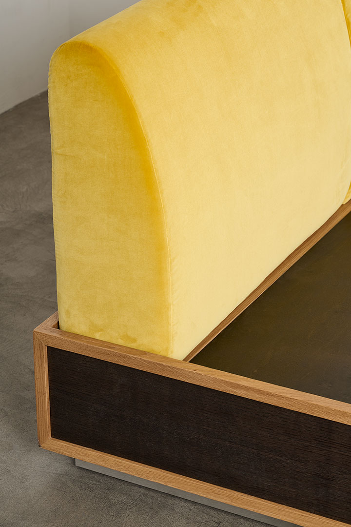 Conceived as part of a series that investigates the bedroom as a total environment, the Perch bed introduces a sharply rectilinear presence that defines the space with clarity and restraint. Its structured volume establishes a deliberate contrast between the soft upholstered surfaces and the somier in dark French oak, puncutuated by profiles in natural French oak, enhancing the dialogue between material density and lightness.