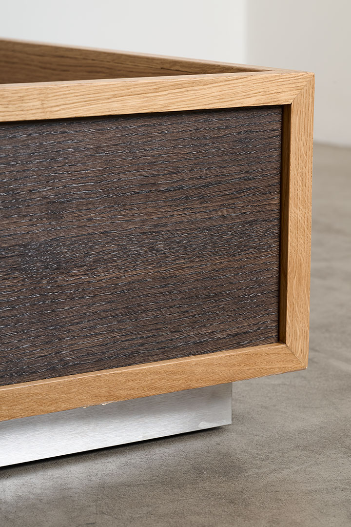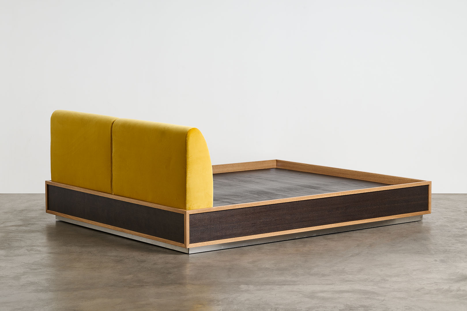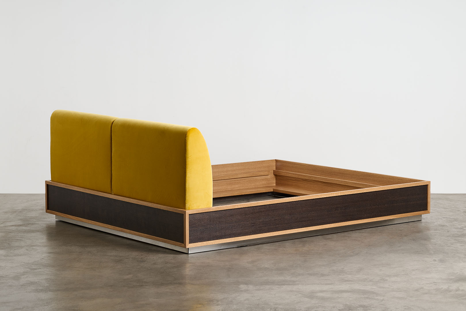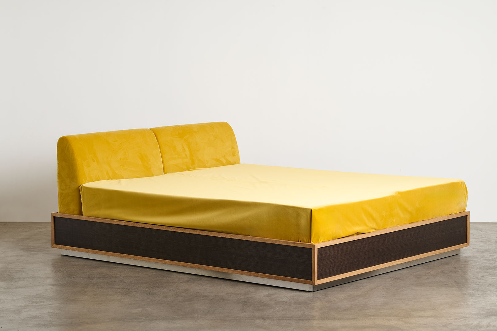 Conceived as part of a series that investigates the bedroom as a total environment, the Perch bed introduces a sharply rectilinear presence that defines the space with clarity and restraint. Its structured volume establishes a deliberate contrast between the soft upholstered surfaces and the somier in dark French oak, puncutuated by profiles in natural French oak, enhancing the dialogue between material density and lightness.