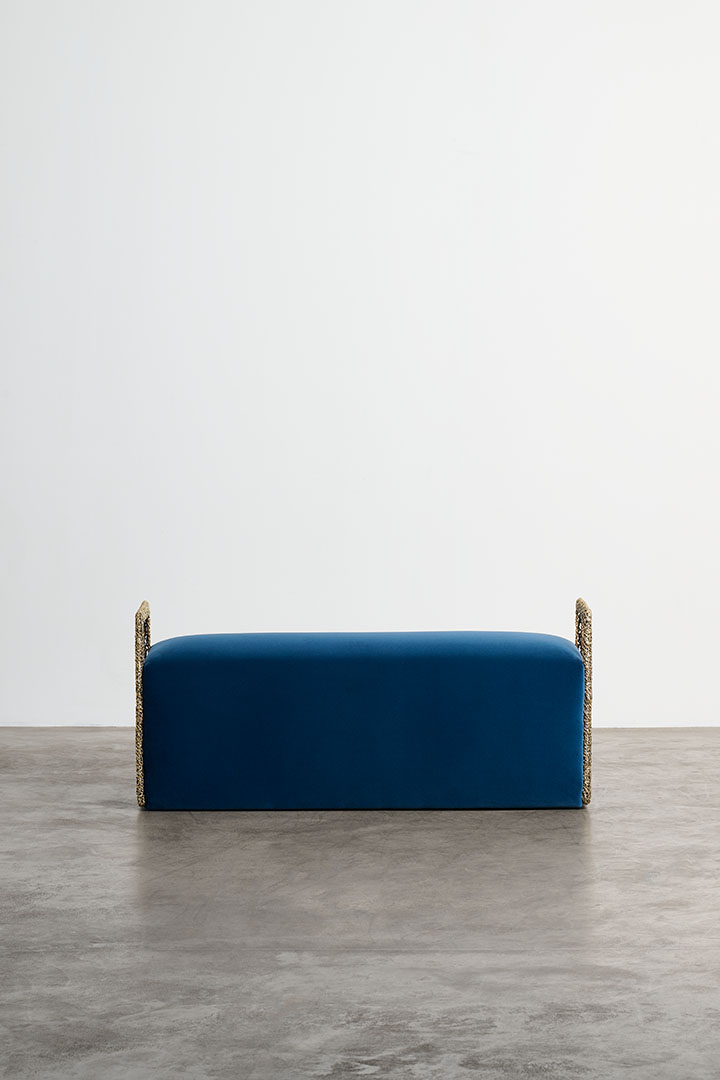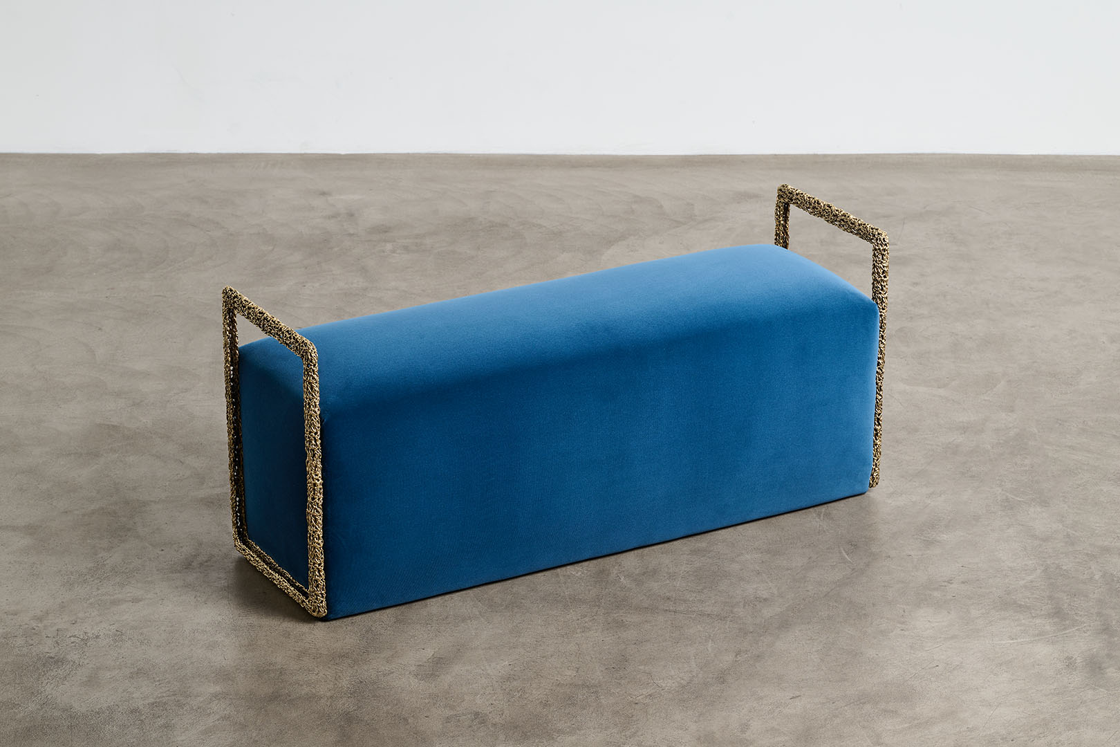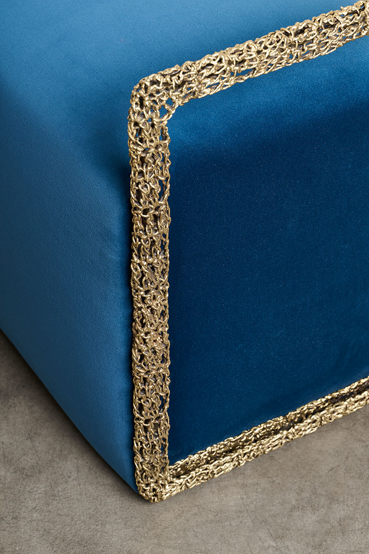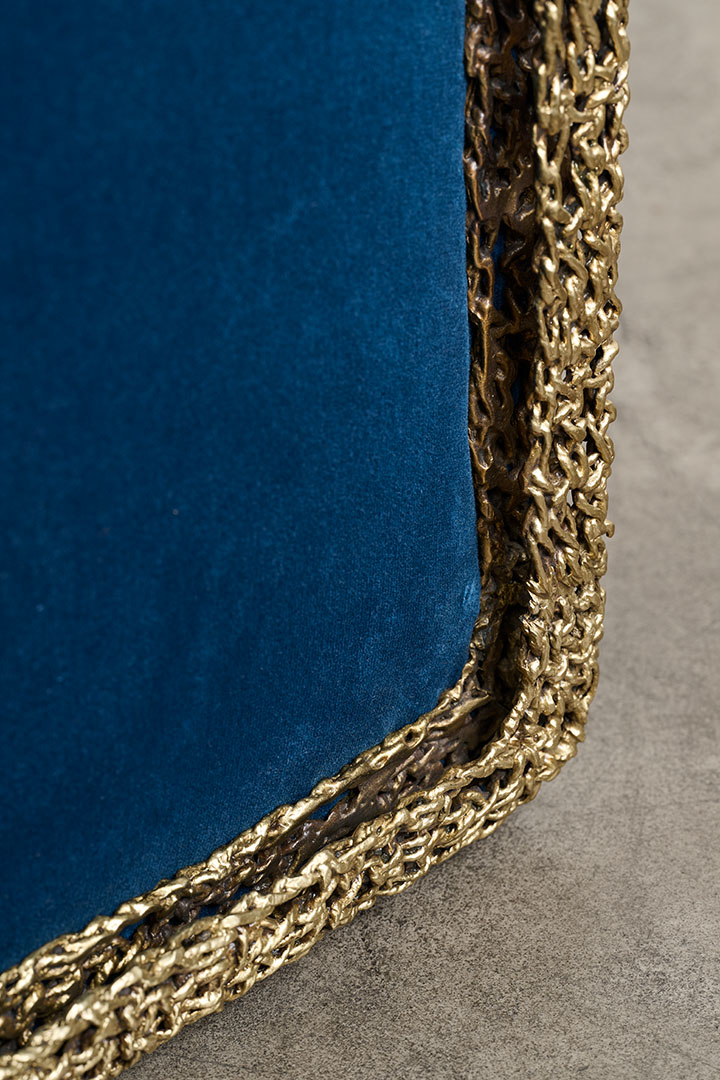 Designed by Allegra Hicks, Trame di Confine collection unfolds through sculptural forms and a refined dialogue of materials. Solid bronze meets the softness of crochet, while velvet upholstery introduces depth and a rich tactile contrast. Rooted in artisanal craftsmanship, the collection centers on the concept of perimeter. Bronze frames trace boundaries that protect without enclosing, becoming thresholds between visible and invisible. Soft volumes and tactile finishes create a sensory experience, elevating contemporary design into something intimate and embracing.
