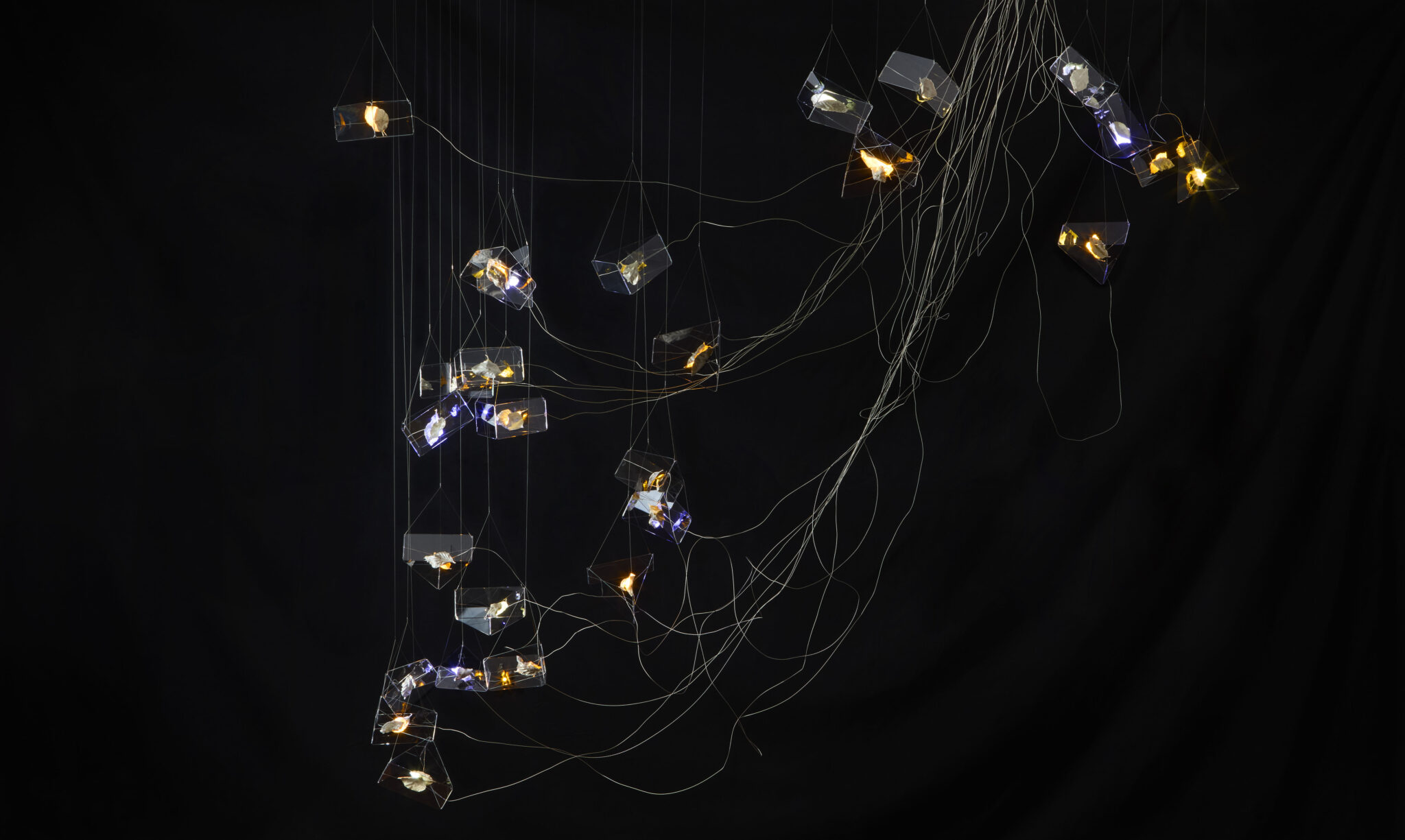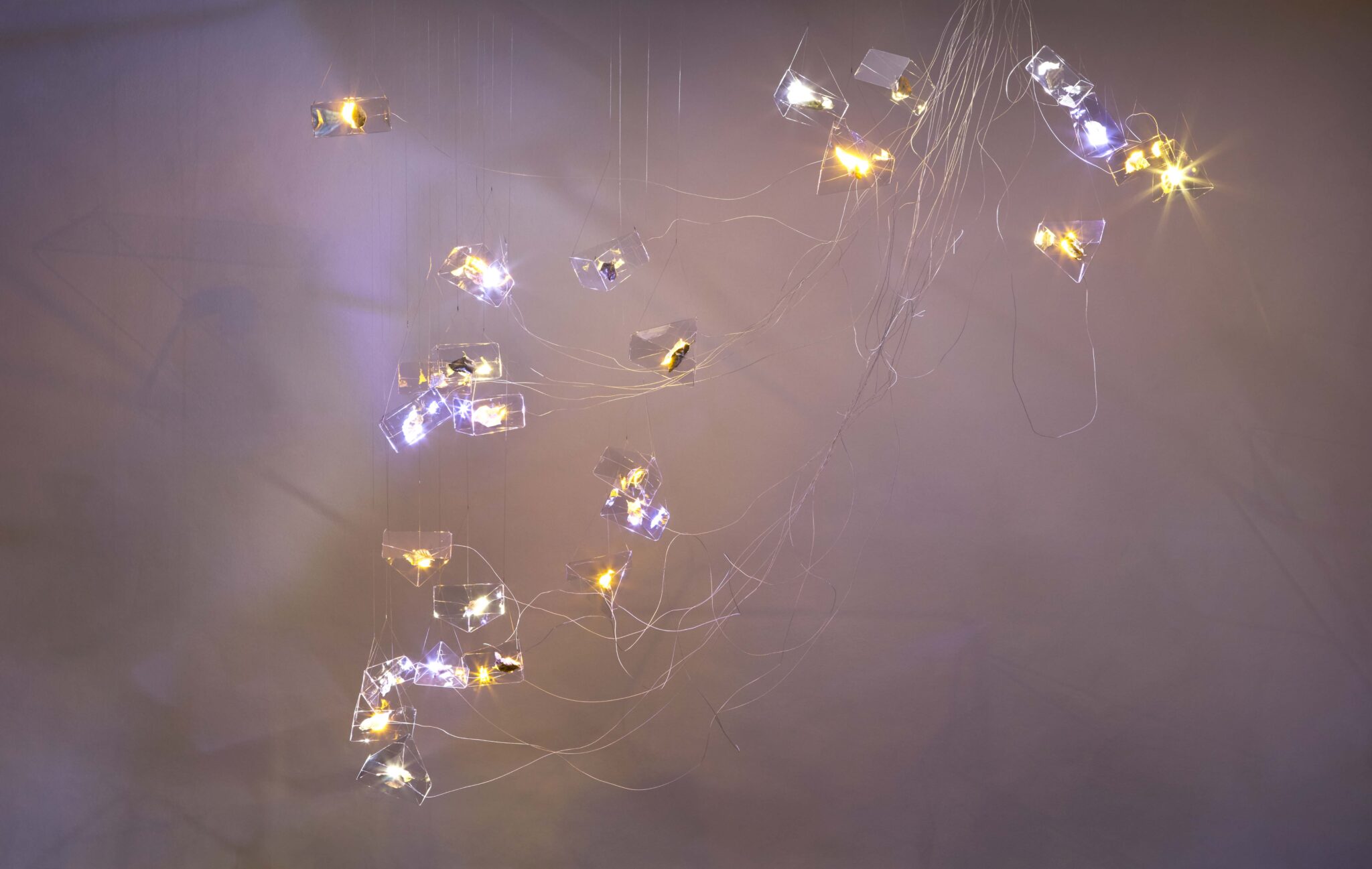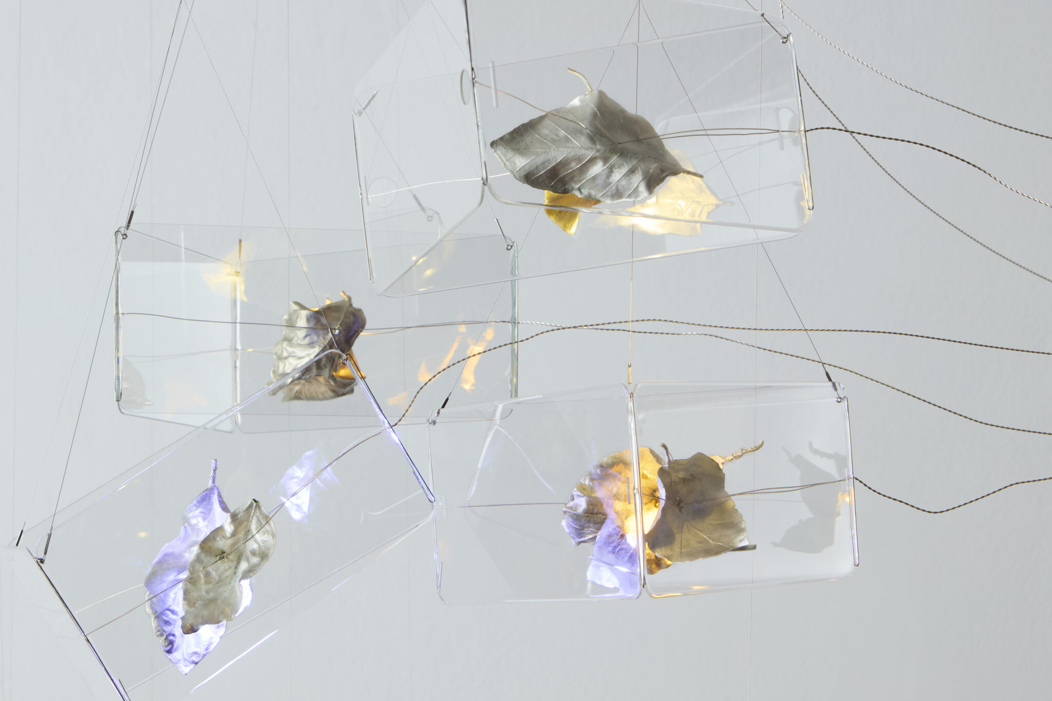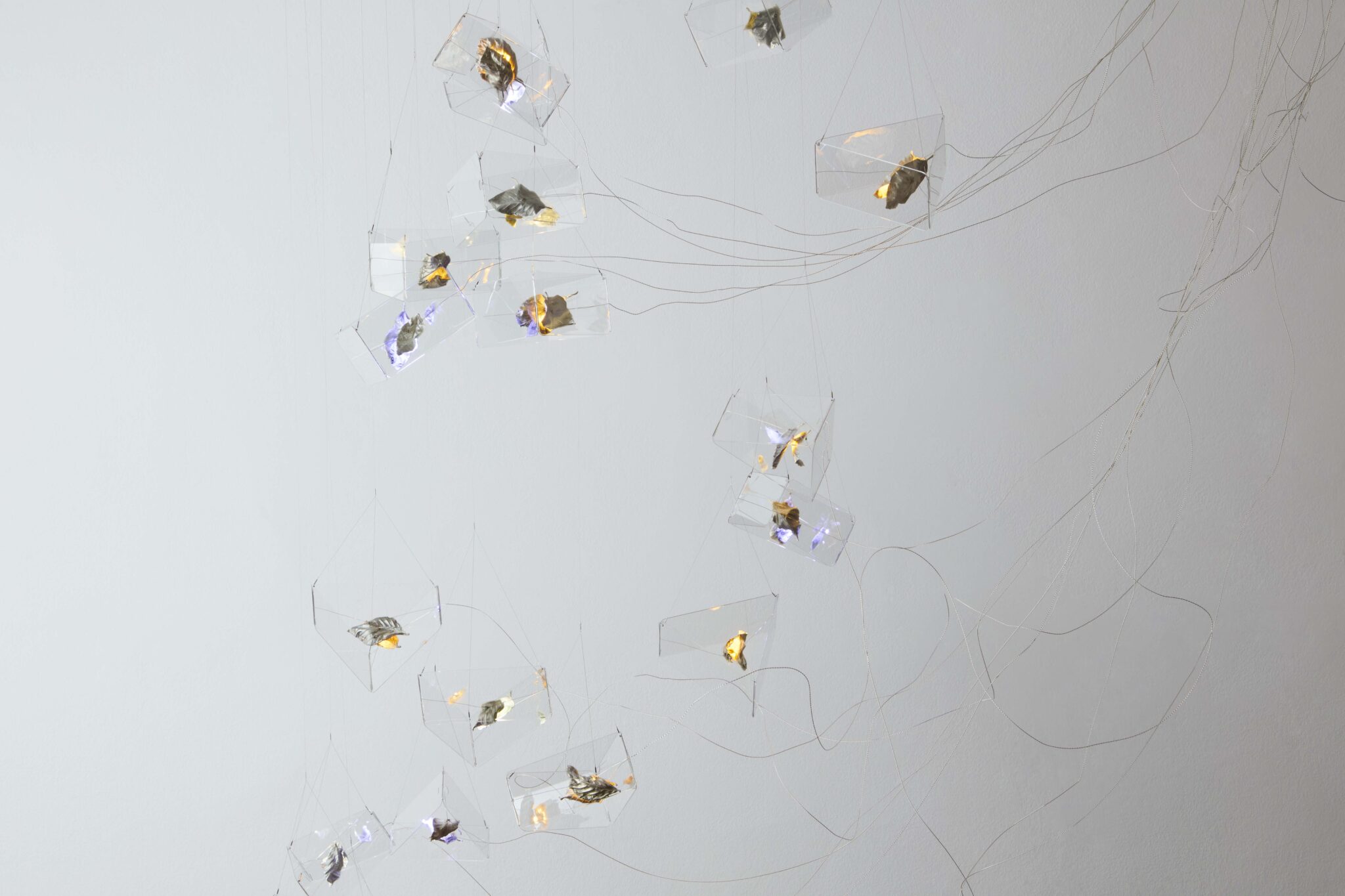 Carbon Cycles weaves glass, graphite, copper, silver, leaves, and kevlar into a story of carbon’s journey through life and energy. Smartphone screens, delaminated and purified, form translucent planes that hold delicate threads of copper and kevlar, stretching light into space. Real beech leaves, coated in recycled copper and silver, cradle LEDs like fragile fragments of memory. At the center, a graphite rosette marks presence and absence—black as coal, oil, and soot, the imprint of human excess. Carbon poisons and sustains; it fuels life, powers technology, and concentrates energy in the hands of a few, shaping our world in both subtle and violent ways. Triangular modules ascend like a tower of tension and light. Each leaf embodies nature’s cyclical wisdom: generating energy, falling, decomposing, and returning to the soil. Life thrives on these rhythms, consuming and releasing carbon in an unbroken flow. Through Carbon Cycles, Marchesani illuminates the delicate balance of carbon, energy, and existence—a meditation on creation, transformation, and regeneration, where our traces persist only when aligned with the flow of life.