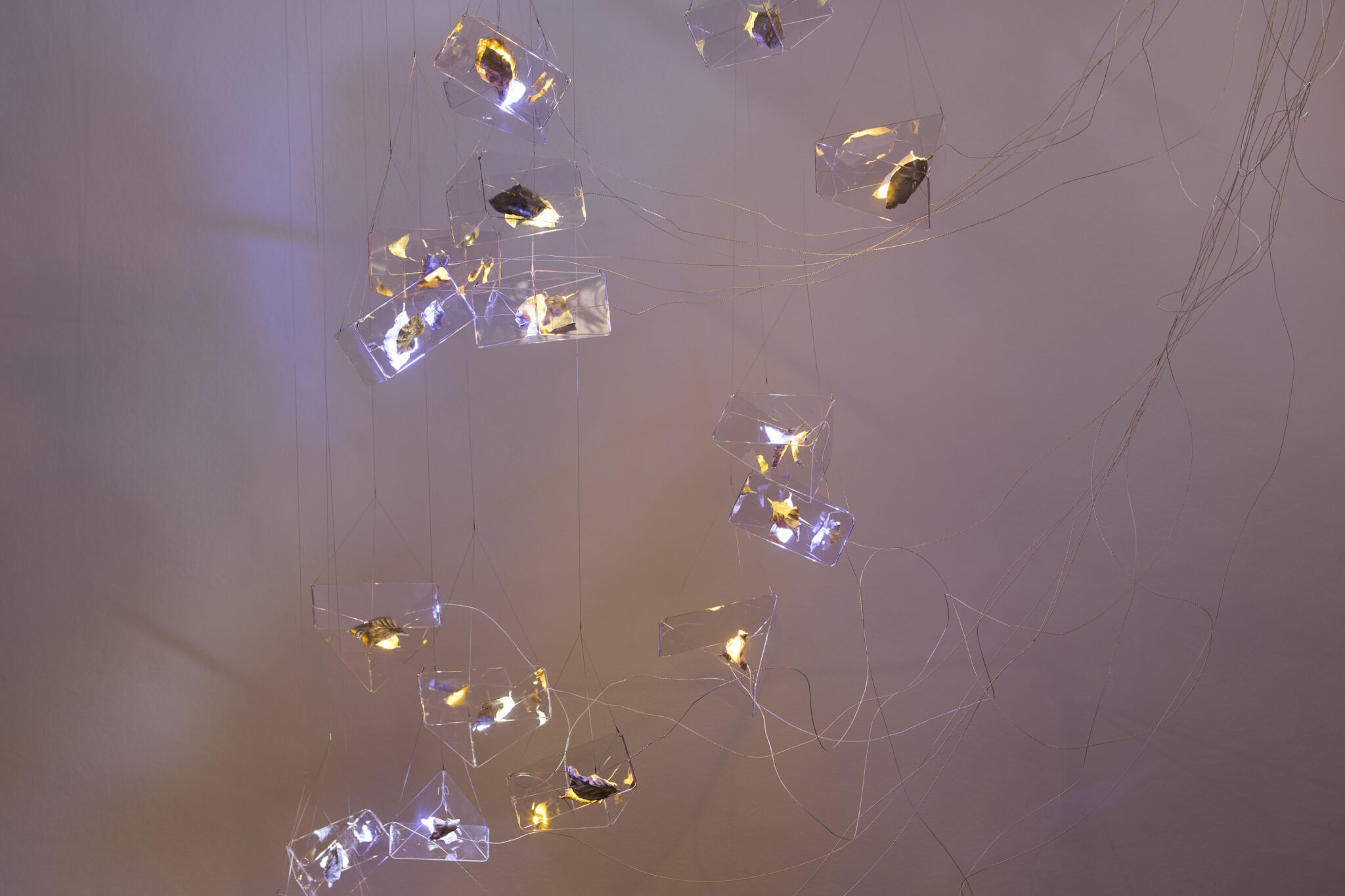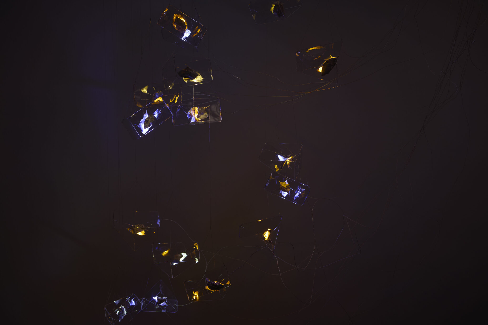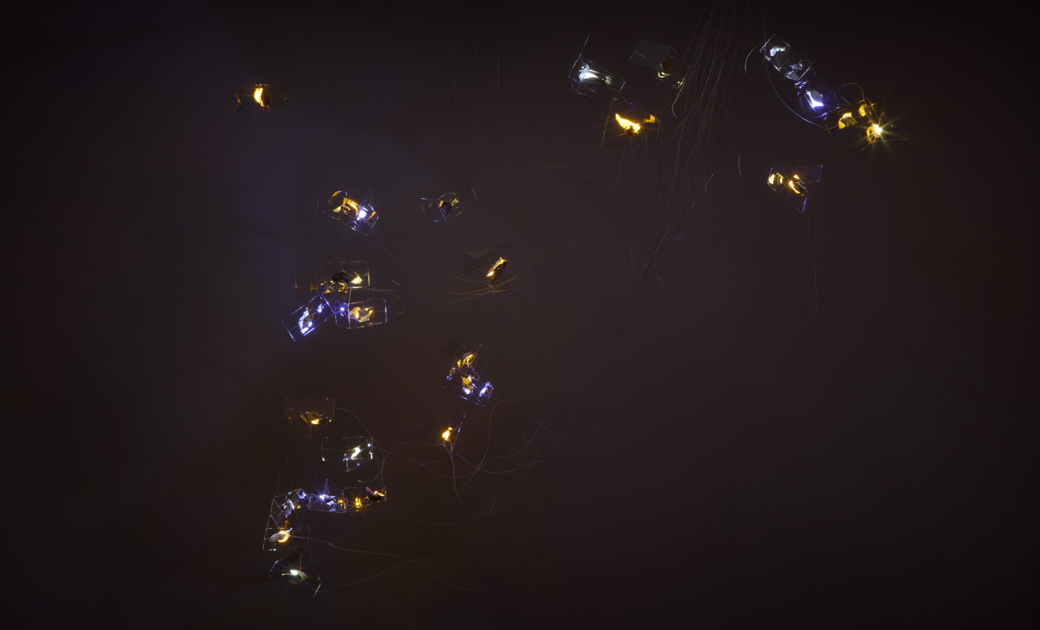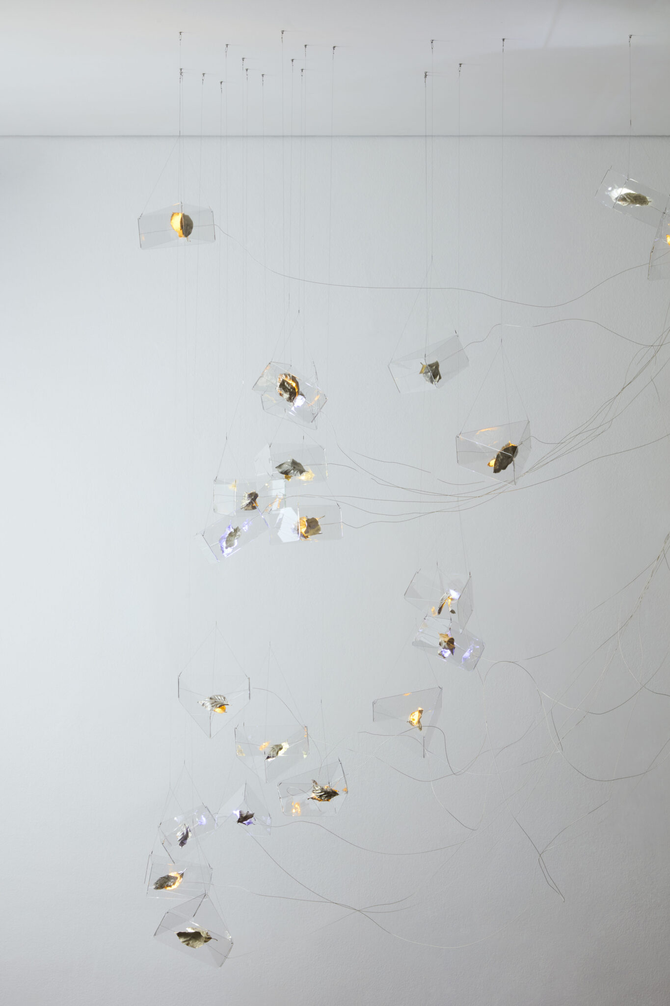 Carbon Cycles weaves glass, graphite, copper, silver, leaves, and kevlar into a story of carbon’s journey through life and energy. Smartphone screens, delaminated and purified, form translucent planes that hold delicate threads of copper and kevlar, stretching light into space. Real beech leaves, coated in recycled copper and silver, cradle LEDs like fragile fragments of memory. At the center, a graphite rosette marks presence and absence—black as coal, oil, and soot, the imprint of human excess. Carbon poisons and sustains; it fuels life, powers technology, and concentrates energy in the hands of a few, shaping our world in both subtle and violent ways. Triangular modules ascend like a tower of tension and light. Each leaf embodies nature’s cyclical wisdom: generating energy, falling, decomposing, and returning to the soil. Life thrives on these rhythms, consuming and releasing carbon in an unbroken flow. Through Carbon Cycles, Marchesani illuminates the delicate balance of carbon, energy, and existence—a meditation on creation, transformation, and regeneration, where our traces persist only when aligned with the flow of life.
