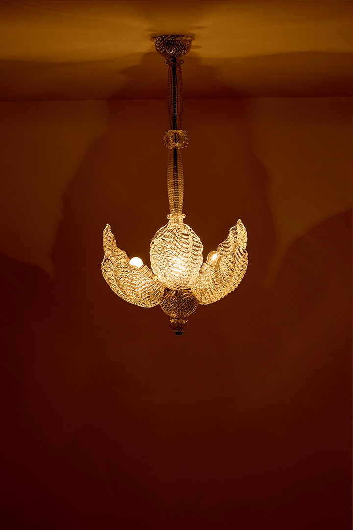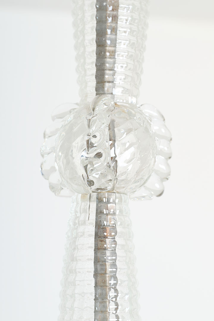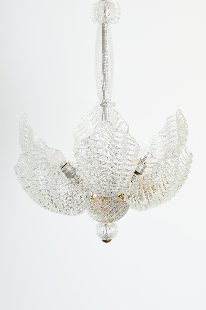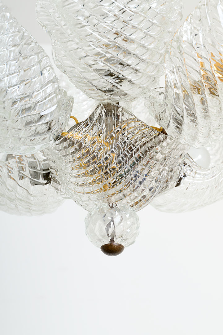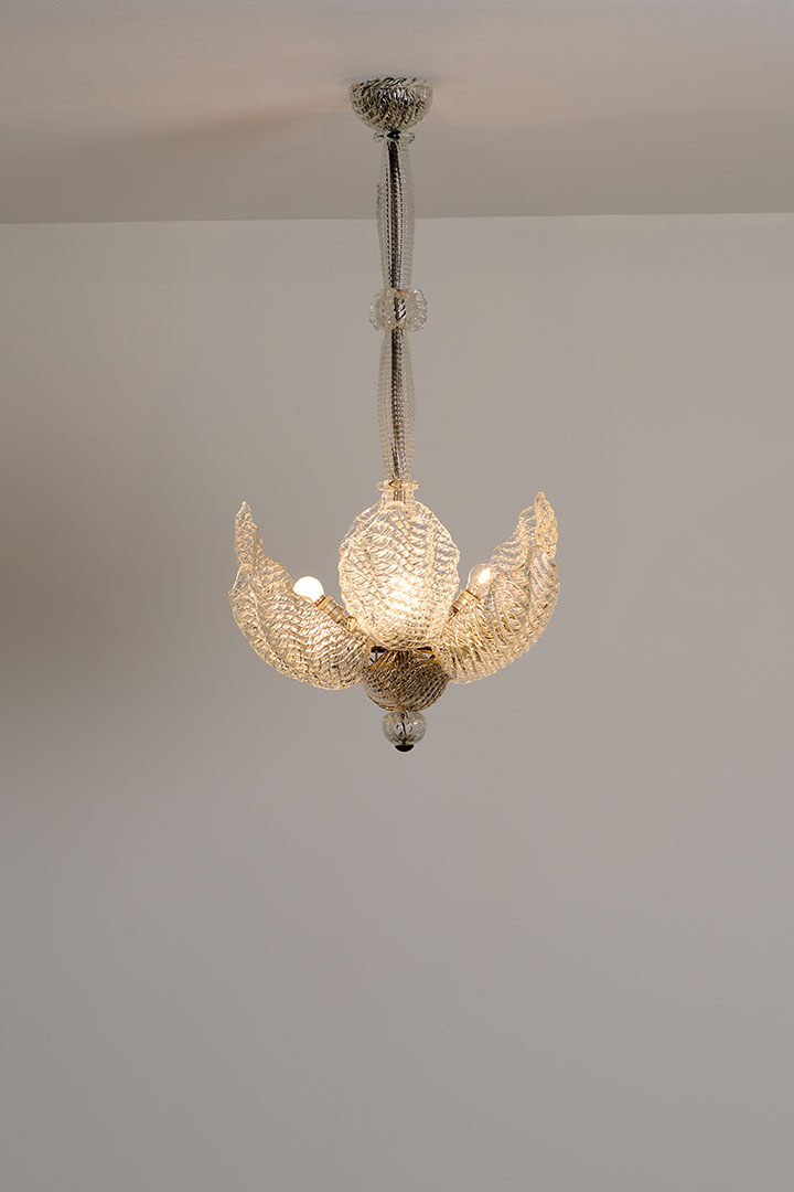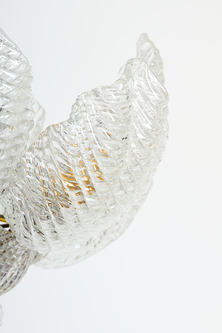 Designed by Flavio Poli and manufactured by Seguso in Italy in the late 1930s, this exquisite vintage ceiling lamp features eight shades delicately shaped like leaves. Both sculptural and ethereal, this piece reflects Poli’s sophisticated approach to form and clarity, embodying the refined artistry and timeless appeal of Venetian craftsmanship.