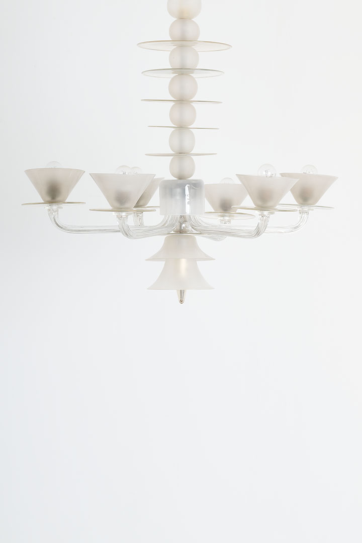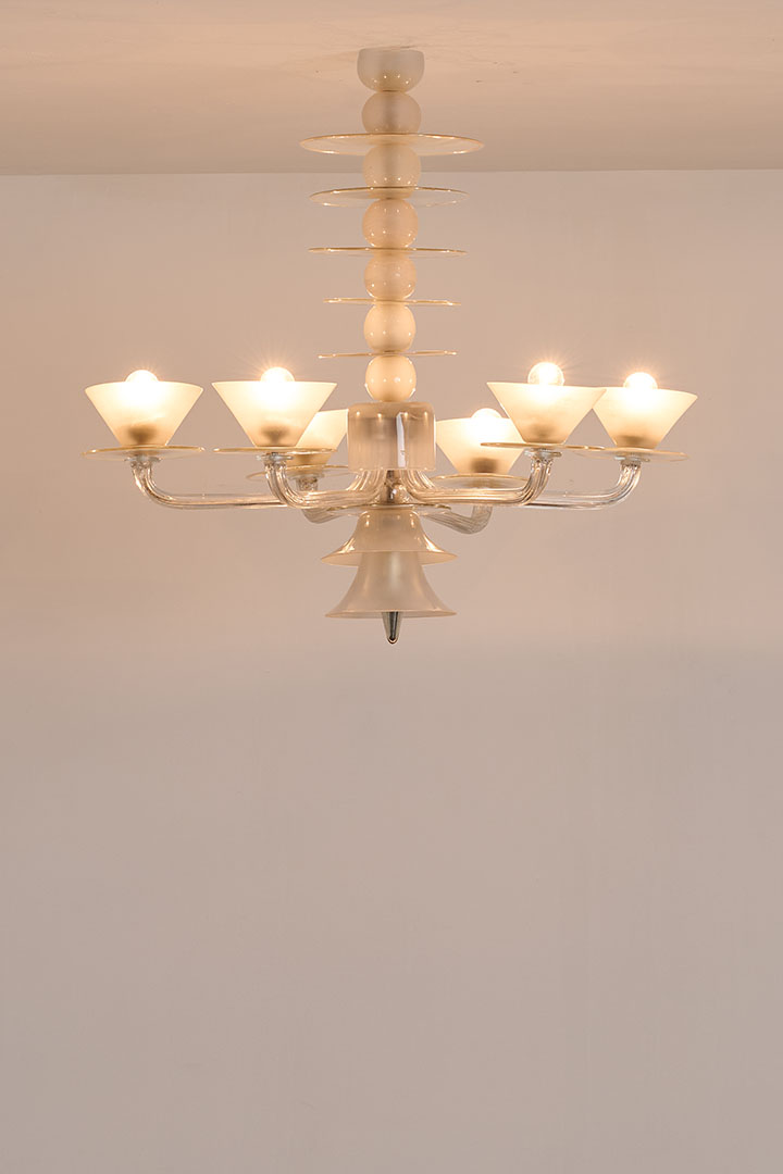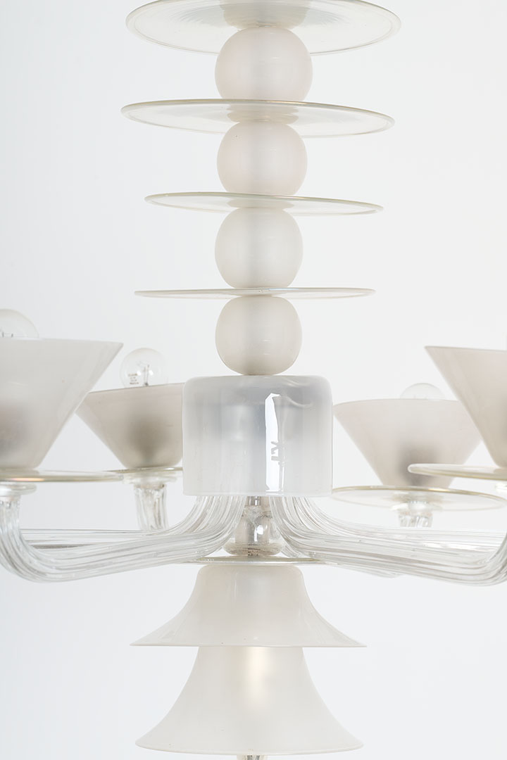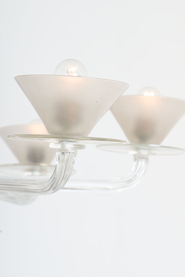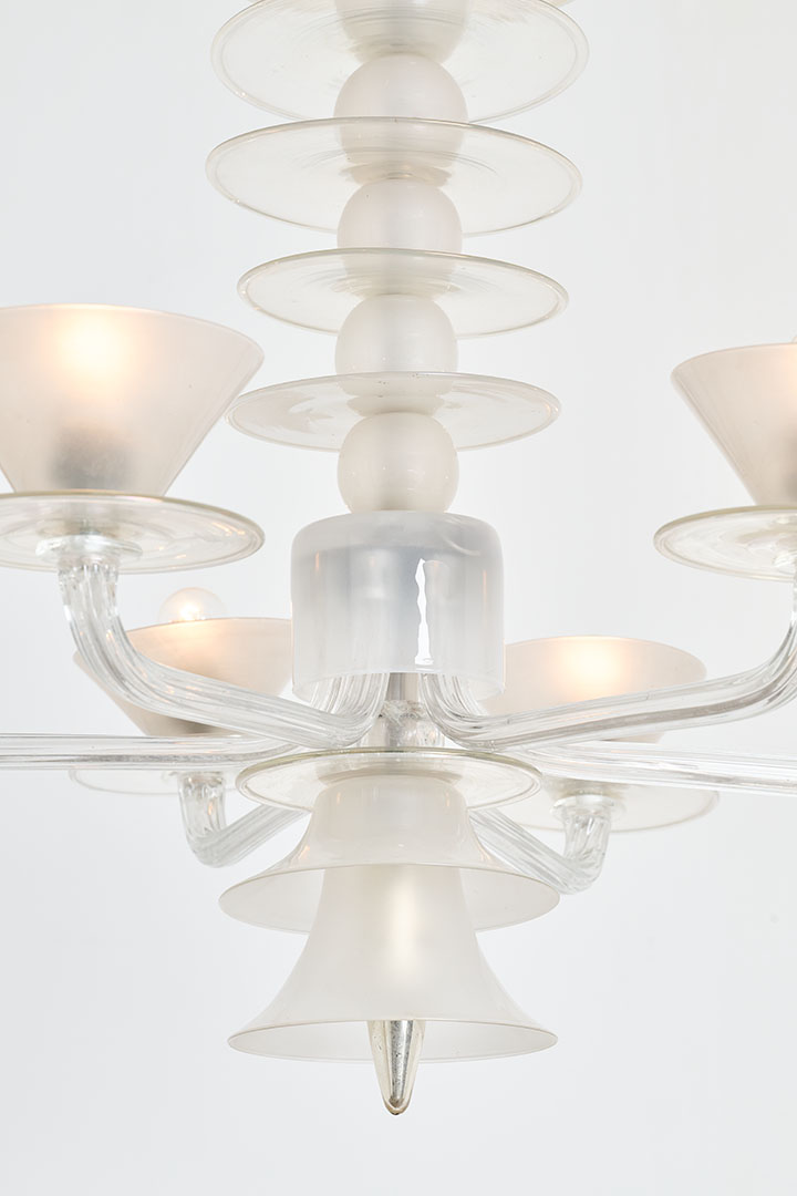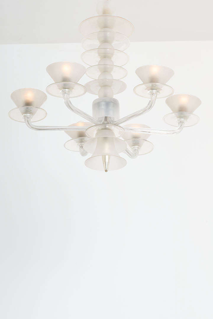 Manufactured by Industrie Vetraie Artistiche Murano (I.V.A.M.) in Italy during the early 1930s, this chandelier embodies the spirit of innovation that defined one of the island’s most forward-thinking furnaces, founded by Libero Vitali. Created in a period of close collaboration with pioneering designers such as Flavio Poli, the piece reflects the emergence of the “Novecento” aesthetic, where sculptural solidity and volumetric presence replaced traditional ornamentation. Crafted in hand-blown Murano glass, the chandelier departs from the classical Venetian multi-arm typology, embracing a striking, architectural composition. Its distinctive tiered disc form, composed of progressively diminishing circular elements, introduces a sense of rhythm and abstraction, resonating with both Art Deco elegance and subtle Futurist dynamism.