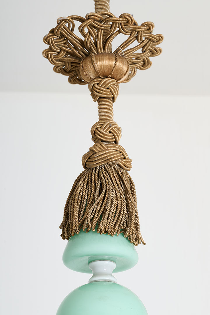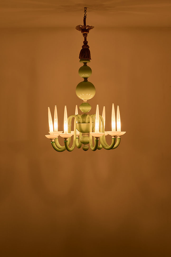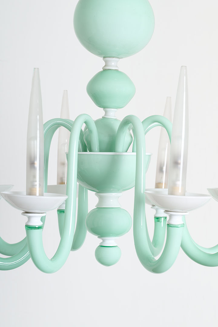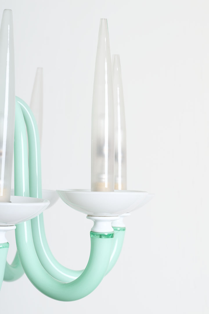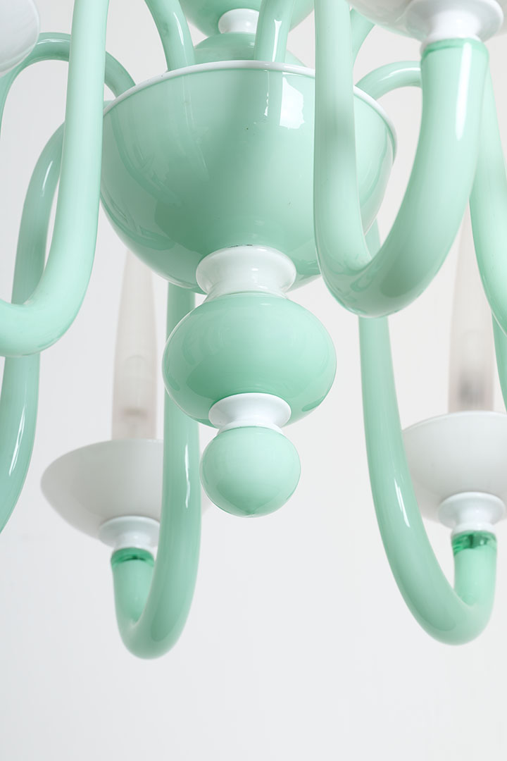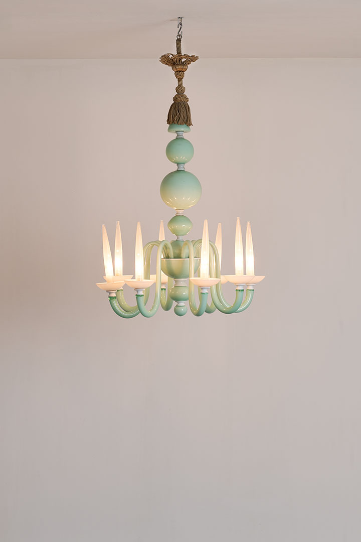 Designed in Italy in the 1950s, this rare vintage Mod. 5537 Venini ceiling lamp features eight hand-blown Murano glass arms. The balanced proportions and clean lines are enhanced by a controlled layering of opaque and translucent glass, a hallmark of Venini’s mid-century production.