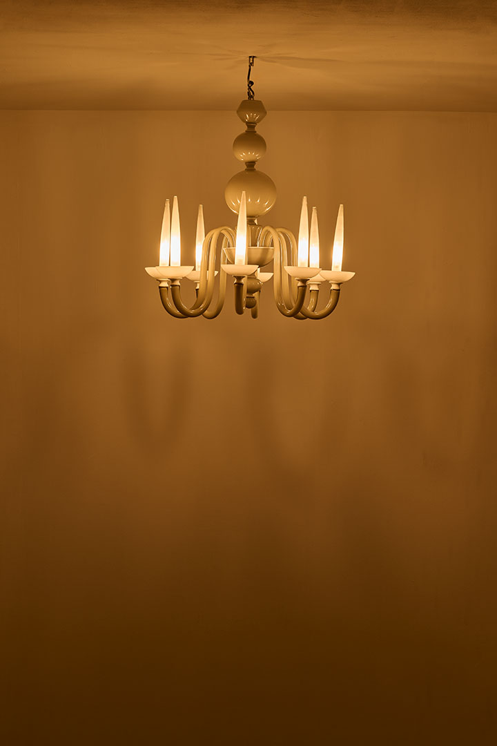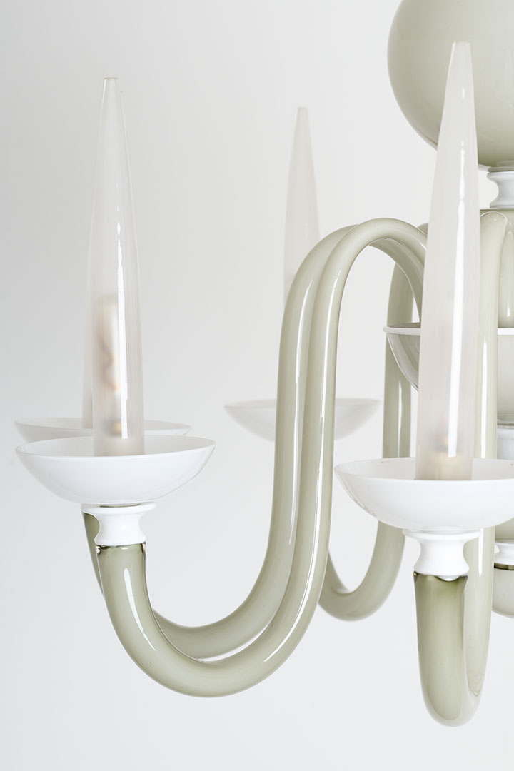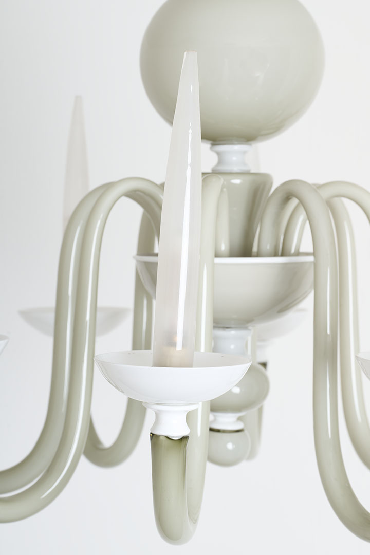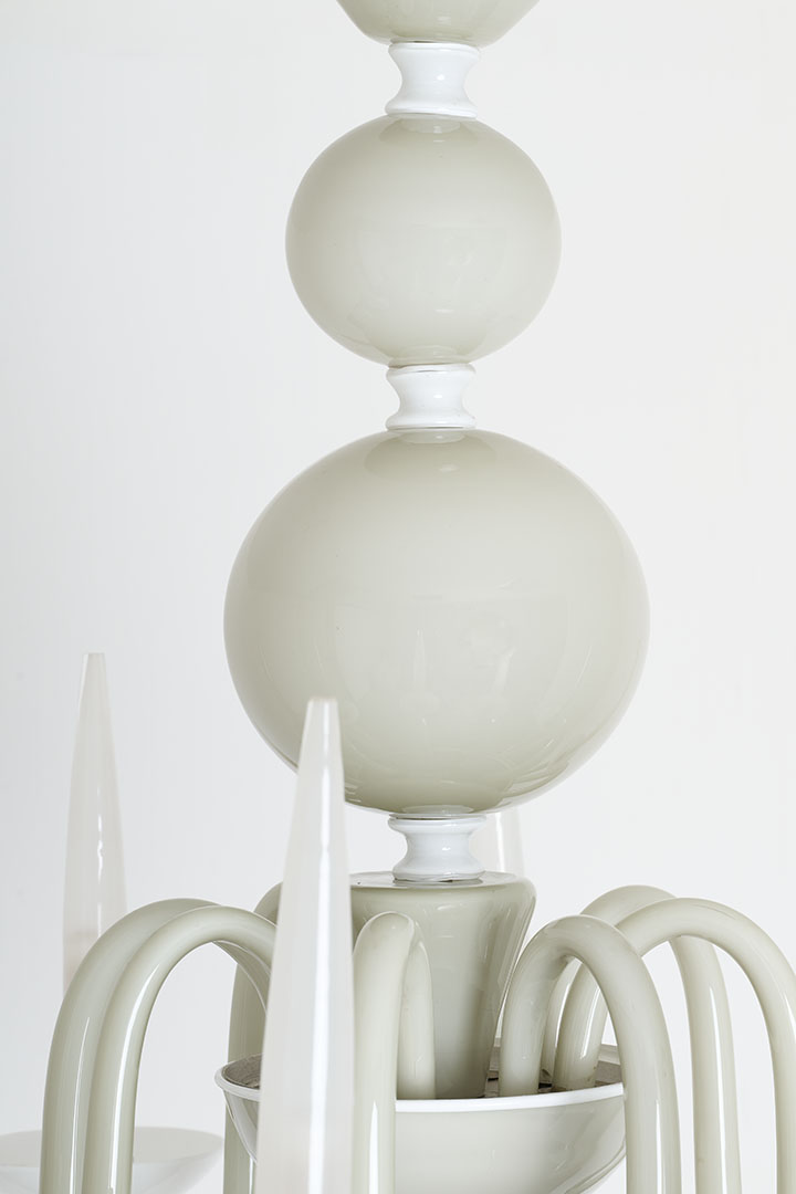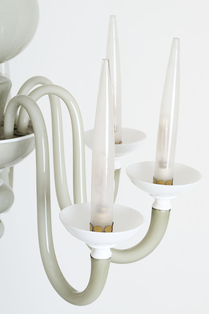 Metal frame, colored and lattimo blown glass, acid-etched glass