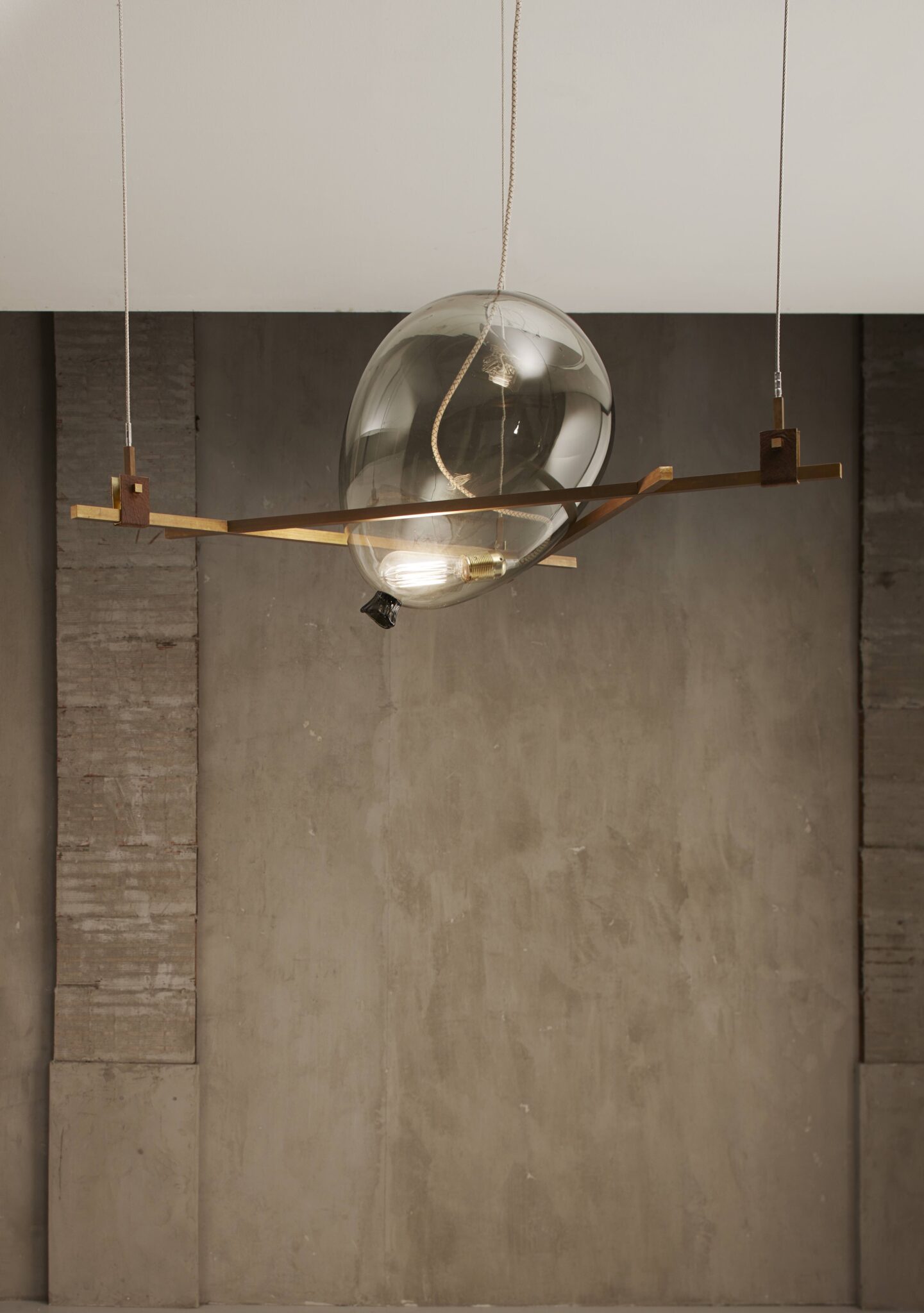 Burnished or brushed brass structure, brass connection element covered by leather, blown glass lamp