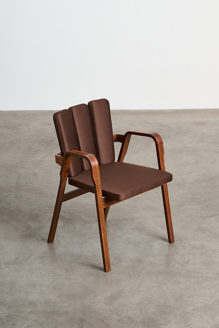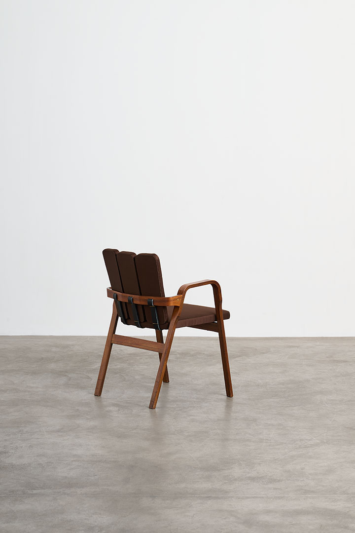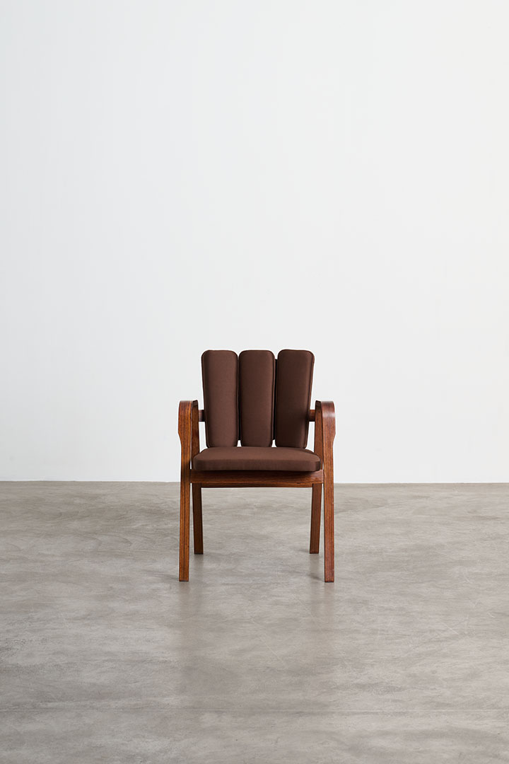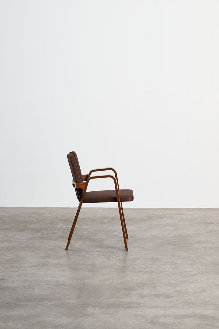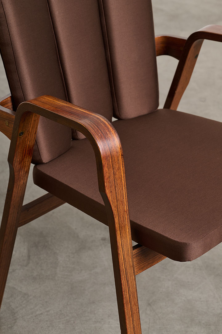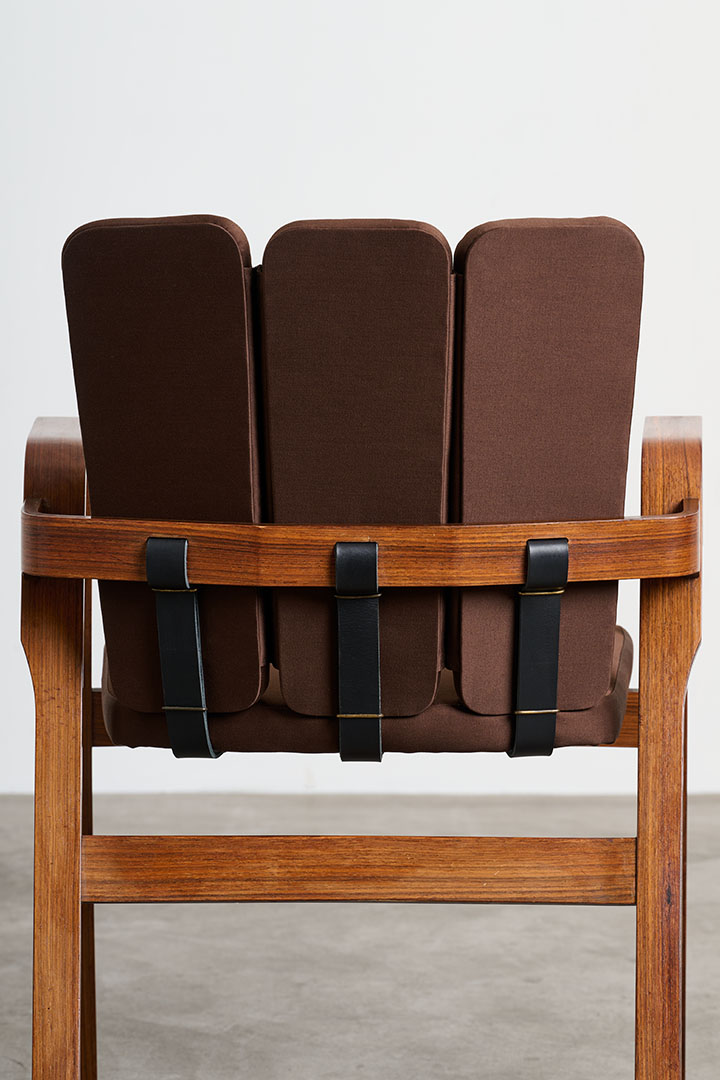 Manufactured by Poggi in Italy during the 1950s, these vintage chairs embody the refined craftsmanship and sculptural sensibility of mid-century design. The rosewood structure frames a fabric-upholstered seat, balancing warmth and elegance. Their most distinctive feature lies in the backrest: a series of vertical padded elements that, when viewed from behind, recall the delicate rhythm of flower petals. Secured to the wooden frame with visible leather straps, this refined construction detail reveals the thoughtful craftsmanship behind the design, where structure and ornament exist in perfect harmony.