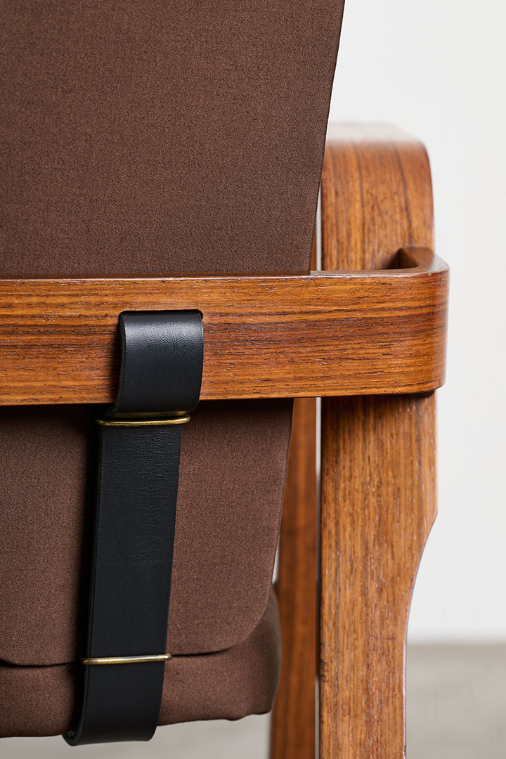 Rosewood structure, fabric upholstery, leather straps