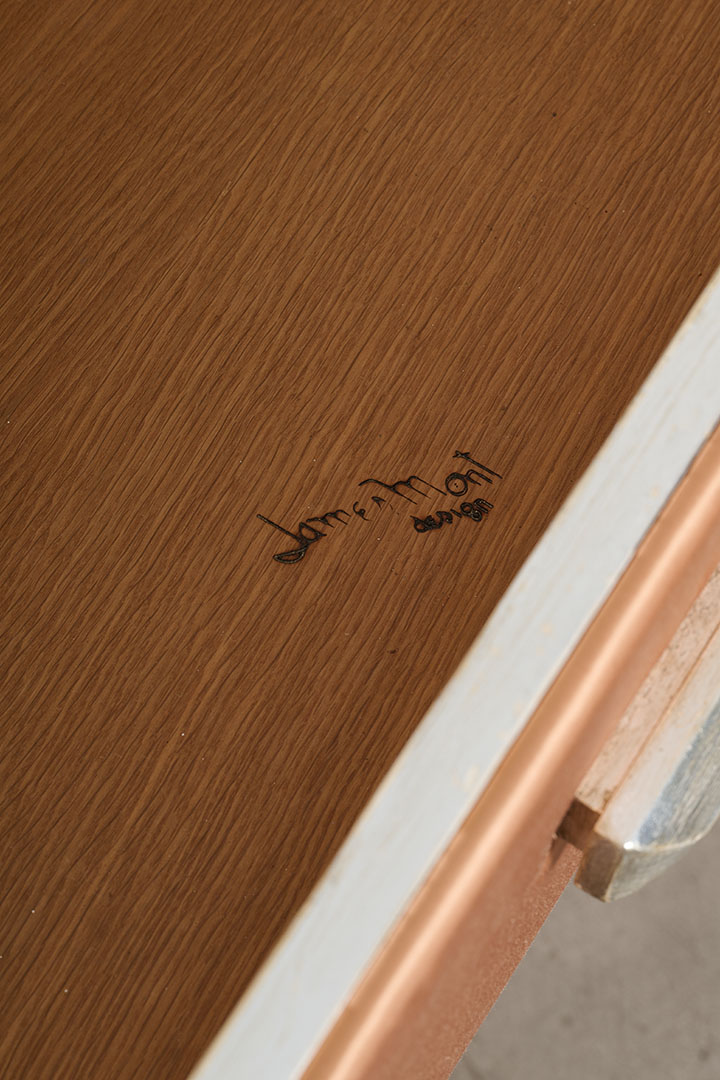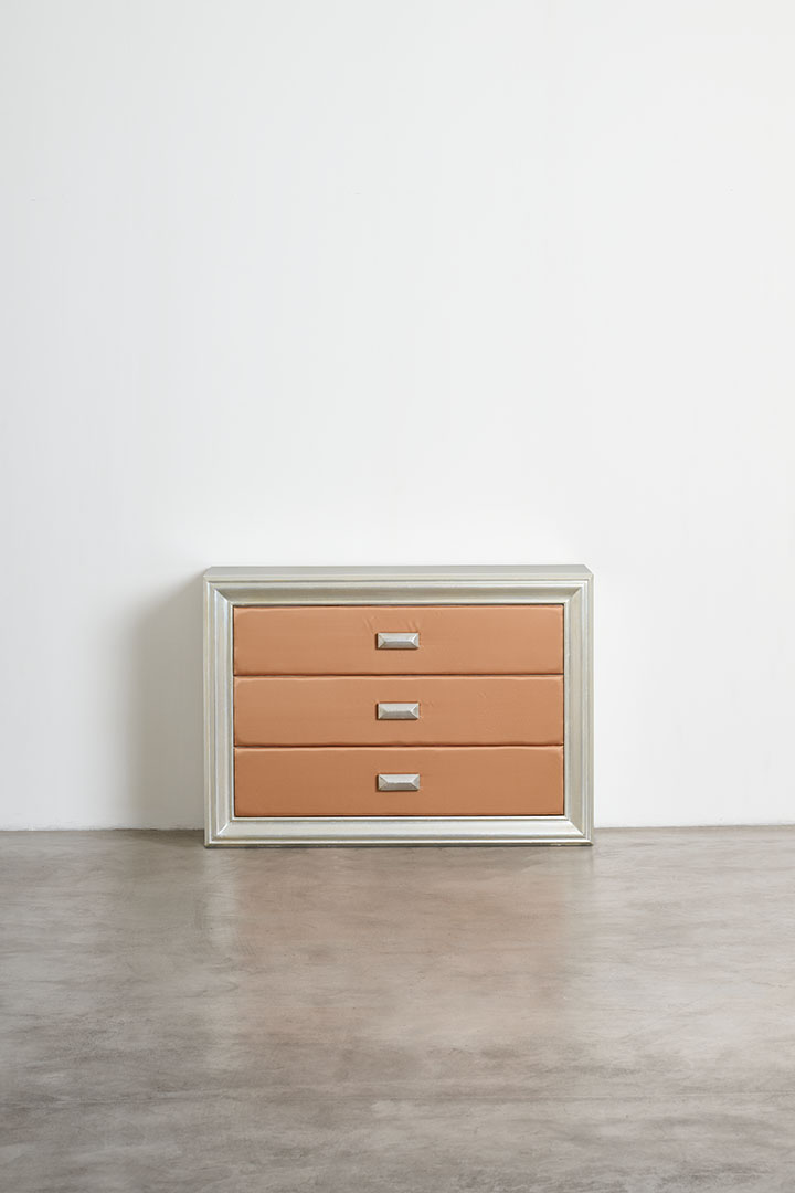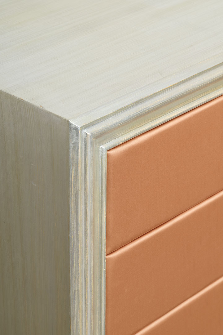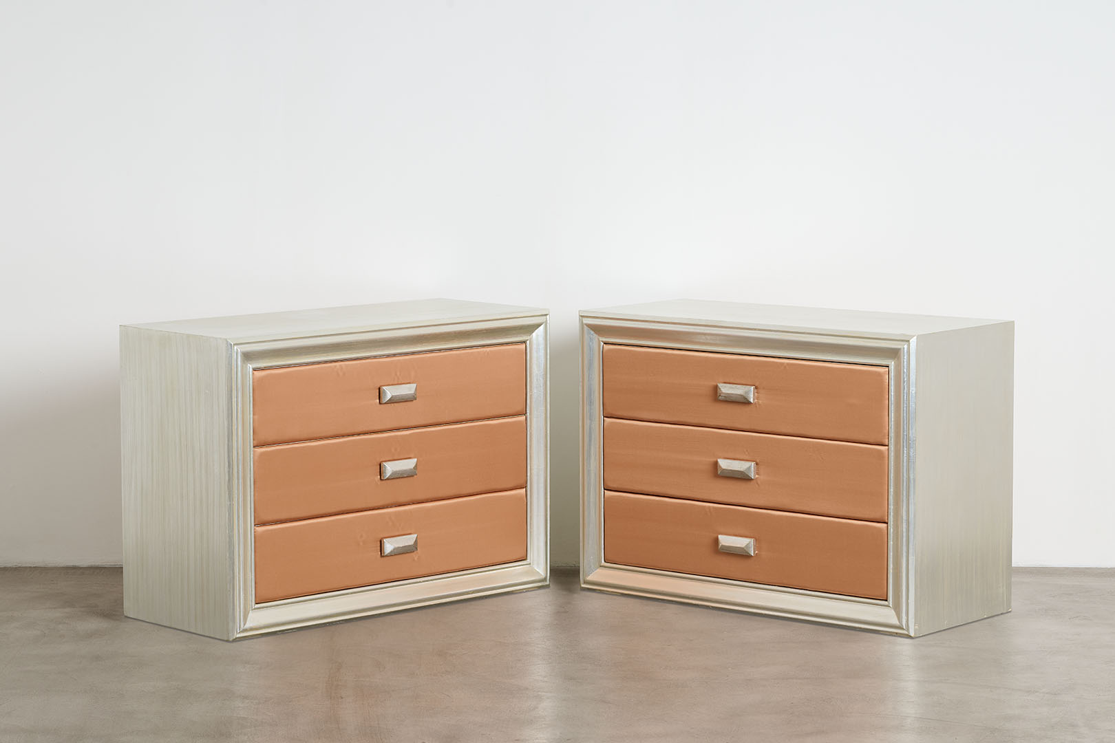 Crafted in the United States in the 1950s, this elegant pair of drawers exemplifies the sophistication of mid-century American design. Featuring a solid oak structure, the pieces have been sympathetically restored to preserve their original character. The frame is finished in silver leaf and enriched by upholstered drawer fronts, adding texture and tactile appeal to the composition.