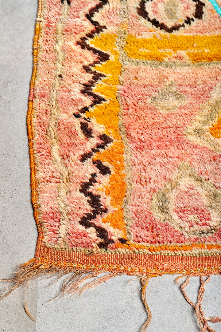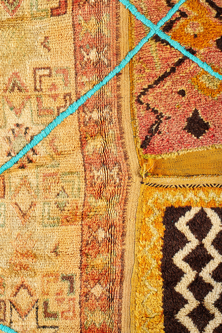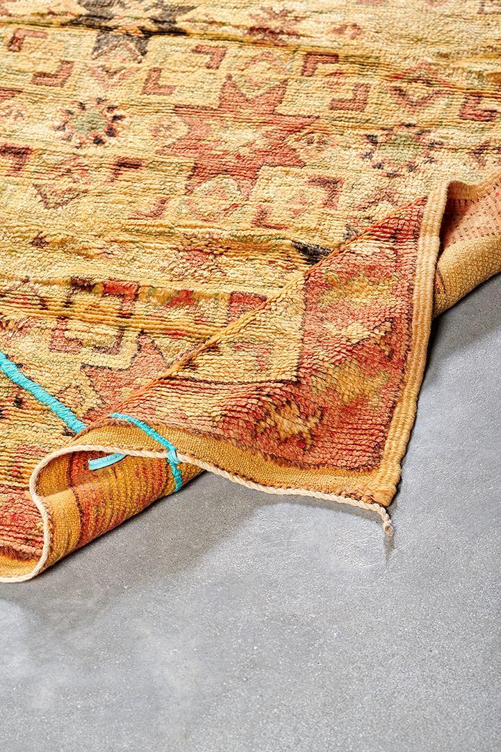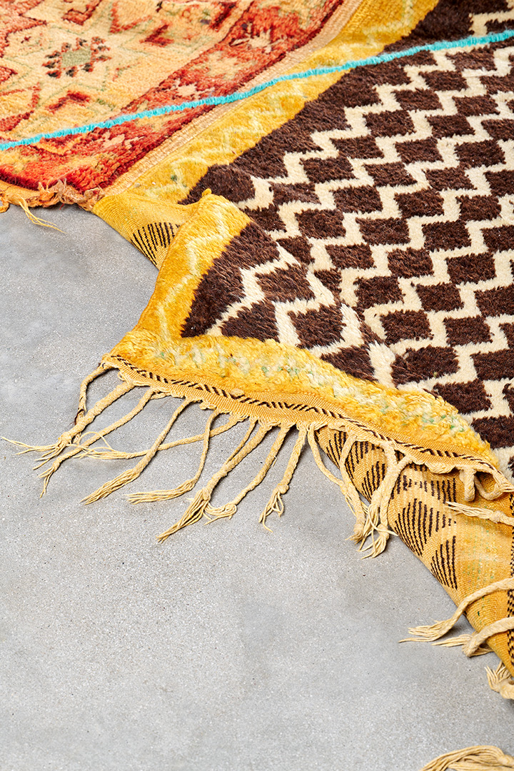 Martino Gamper’s Berber carpet crosses Moroccan rugs in a playful interplay of form and texture, reworking their original shapes through spontaneous interventions. By altering proportions and adding new woven details, the piece creates a lively dialogue between past and present, transforming preexisting elements into a fresh, contemporary composition.