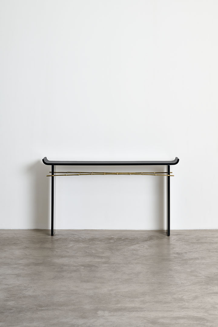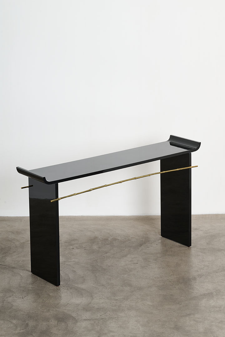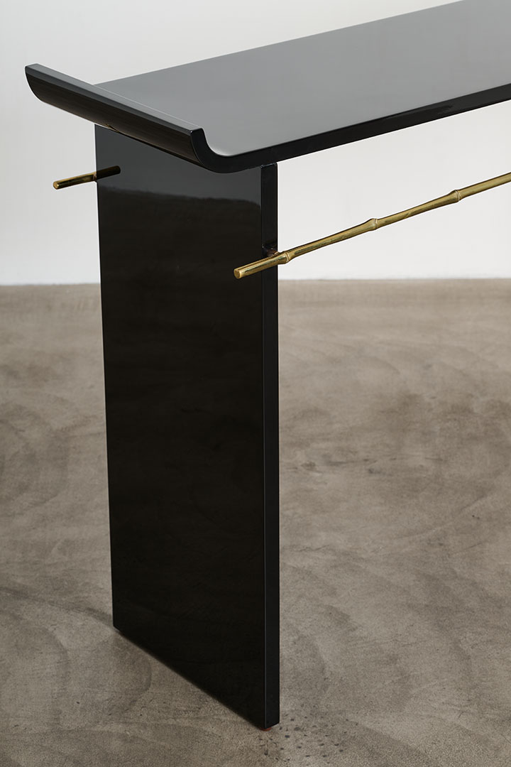 This rare vintage console by Maria Pergay perfectly captures her pioneering vision, where sculpture and function are deeply intertwined. Crafted in black lacquered wood and silvered bronze, it combines bold materials with refined craftsmanship. Its clean lines and elegant proportions echo the rhythm of two bamboo stems, joined in quiet harmony. This natural motif, often explored by Pergay, bridges her modern sensibility with Asian aesthetic.