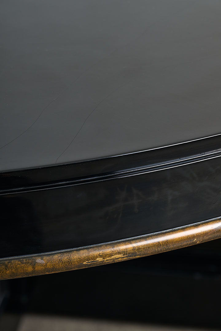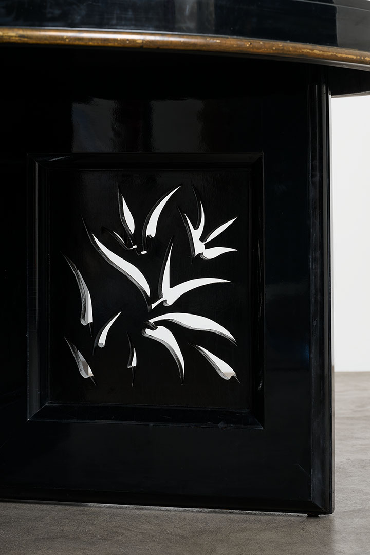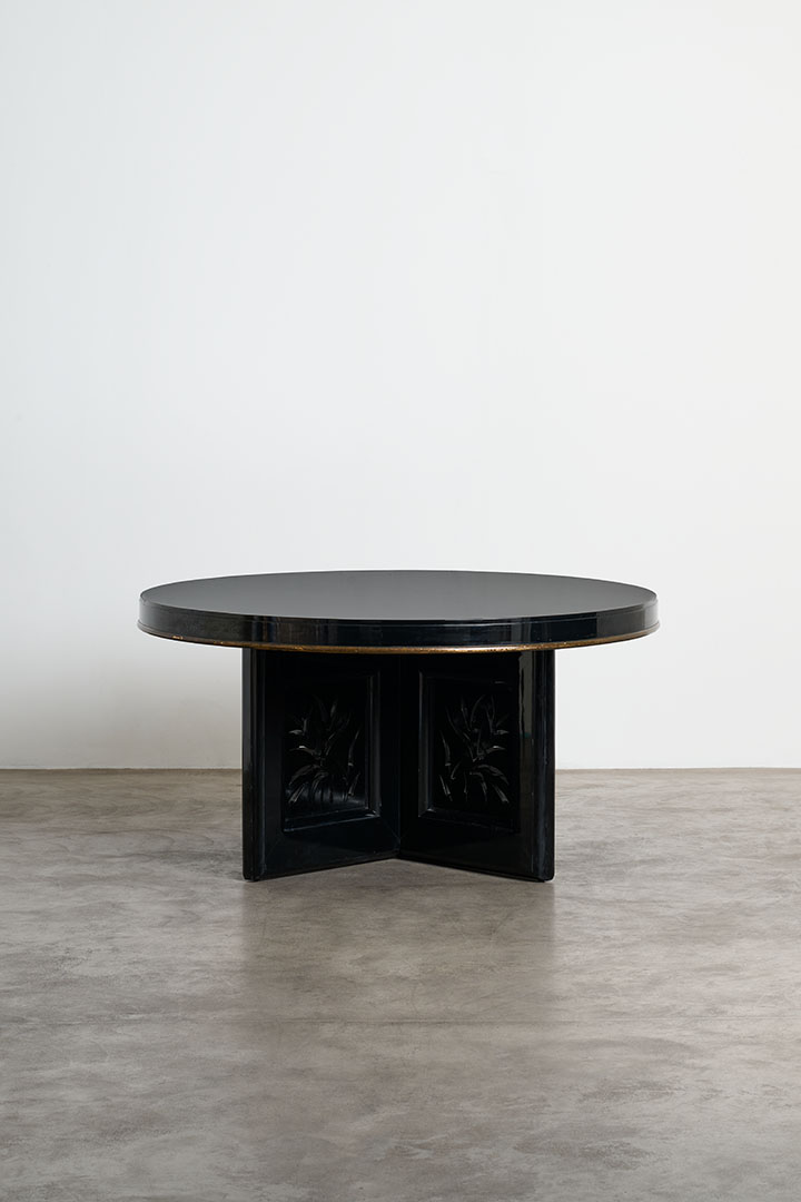 A refined example of James Mont’s distinctive style, this rare round dining table reflects his eclectic blend of influences, including Asian-inspired motifs. The base is formed by four panels arranged in a cross, giving the piece a balanced and decorative presence. Each panel is enriched with carved floral details, a hallmark of Mont’s ornamental vocabulary. Finished in a deep black lacquer, the surface enhances its elegant character, while a subtle gilt trim along the edge adds a subtle visual accent. With its measured proportions, the table maintains an intimate yet distinctive presence, embodying Mont’s flair for sophisticated, decorative design.