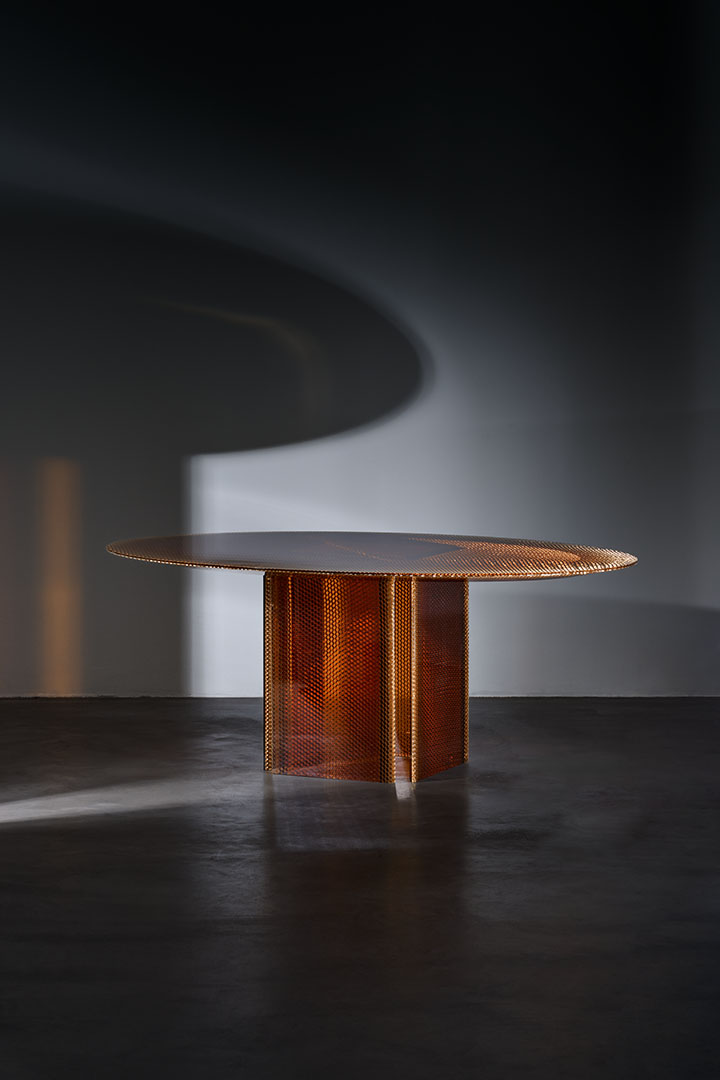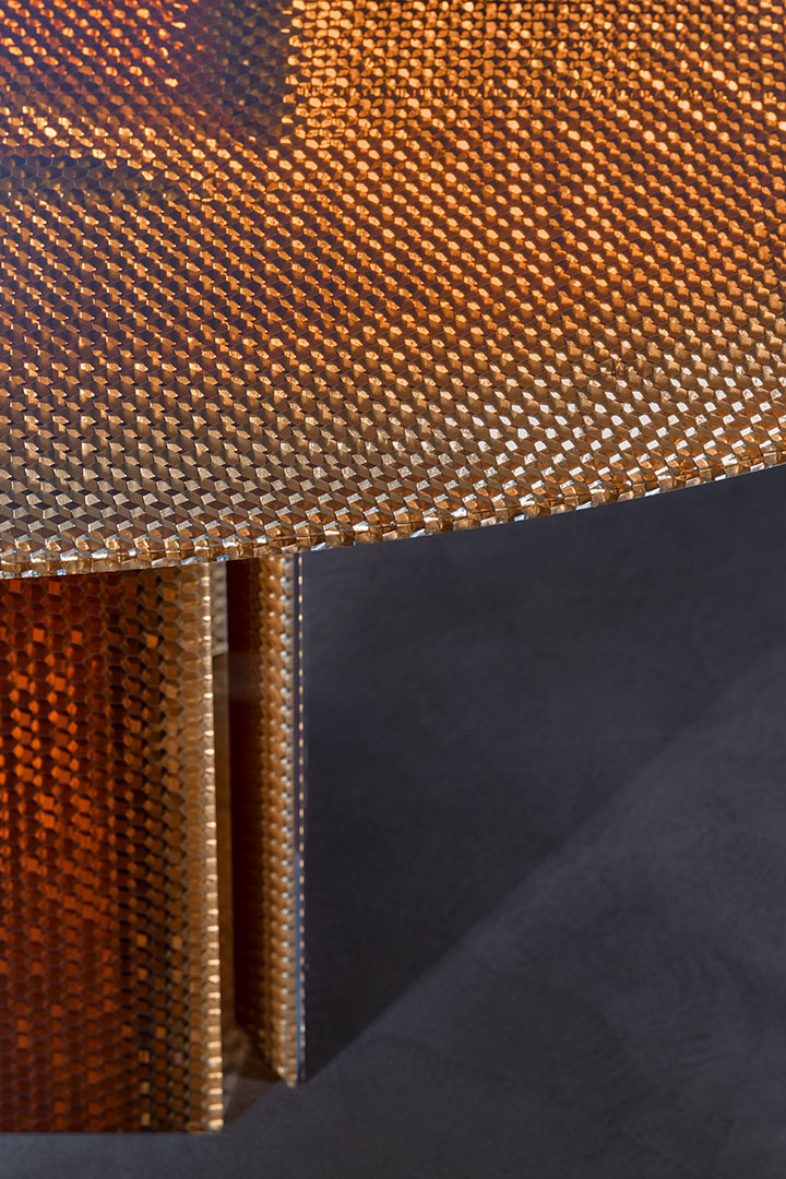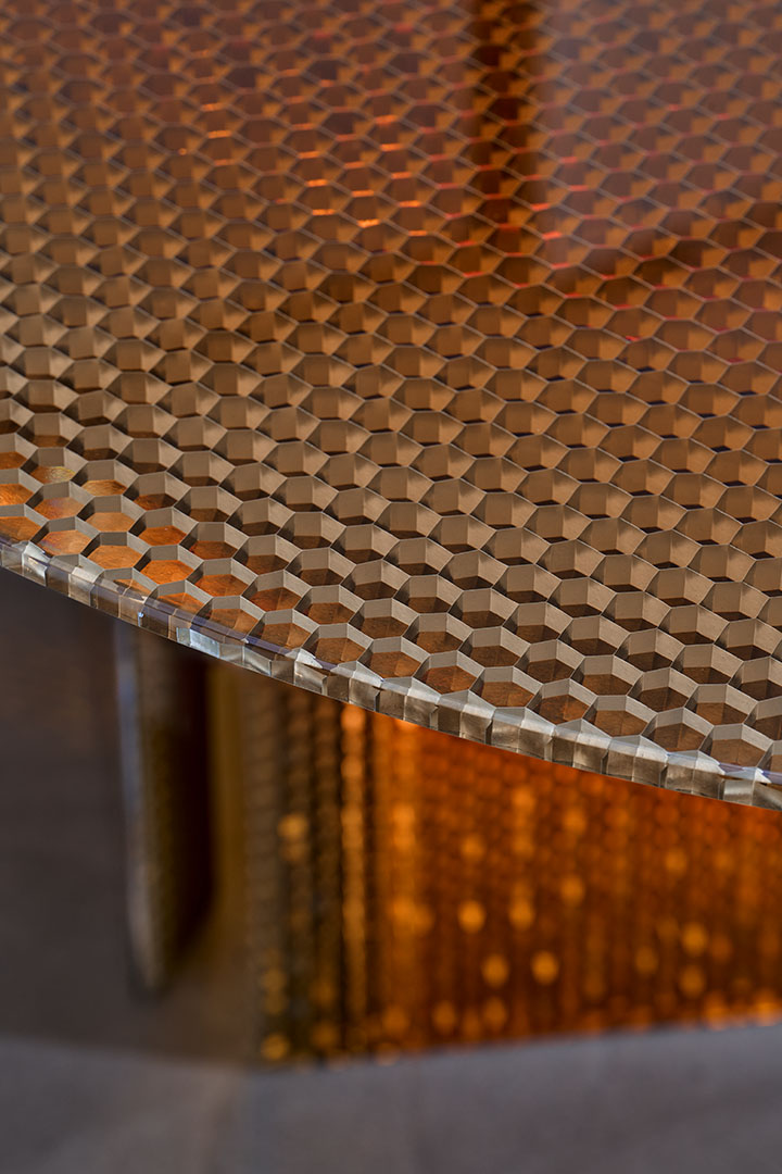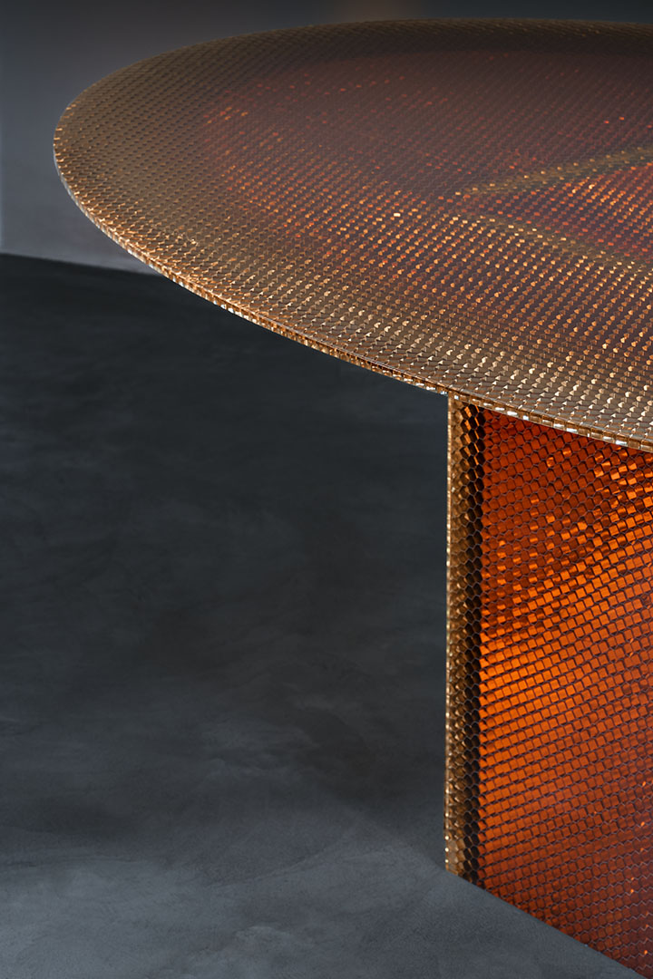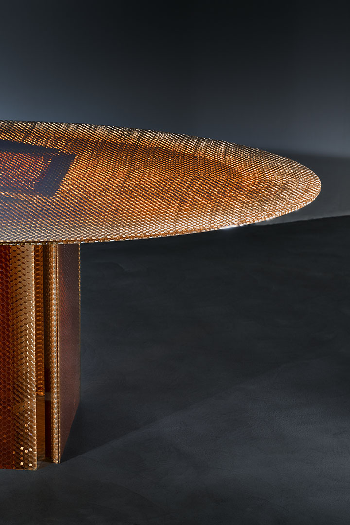 Designed by Marco Lavit in collaboration with Azimut Design, this dining table explores a new frontier in material innovation. Crafted in amber epoxy resin and aluminum honeycomb, the piece emerges from an advanced research process that structurally integrates the two elements into a single composite material. Known for its hexagonal cellular structure, honeycomb offers exceptional strength and lightness. Encased through a controlled epoxy casting process, the structure becomes stabilized and luminous, revealing metallic reflections and warm amber tones. The result is a surface that appears almost liquid, where technical precision and material depth merge into a refined architectural presence.