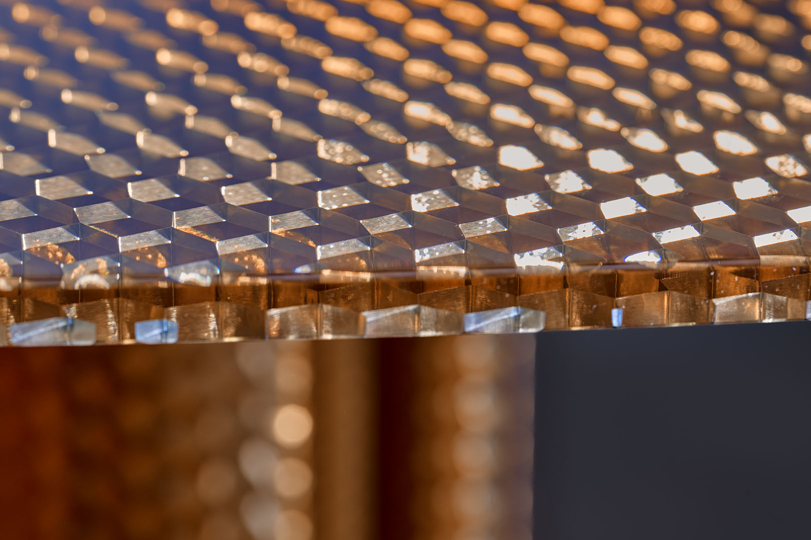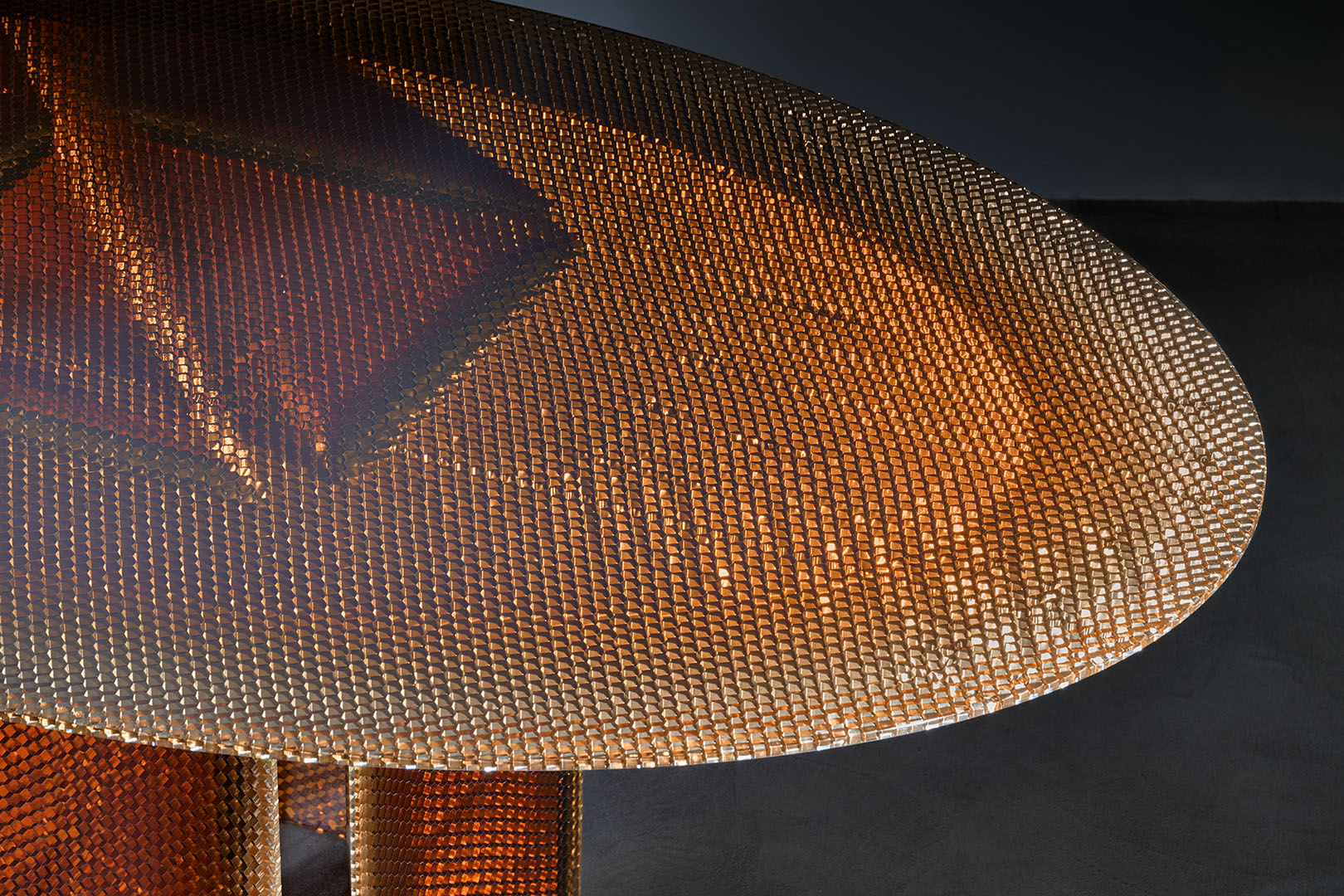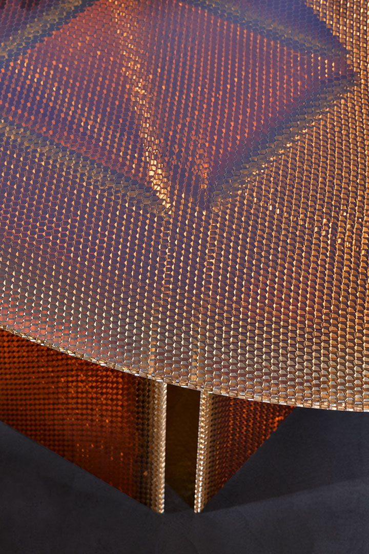 Designed by Marco Lavit in collaboration with Azimut Design, this dining table explores a new frontier in material innovation. Crafted in amber epoxy resin and aluminum honeycomb, the piece emerges from an advanced research process that structurally integrates the two elements into a single composite material. Known for its hexagonal cellular structure, honeycomb offers exceptional strength and lightness. Encased through a controlled epoxy casting process, the structure becomes stabilized and luminous, revealing metallic reflections and warm amber tones. The result is a surface that appears almost liquid, where technical precision and material depth merge into a refined architectural presence.