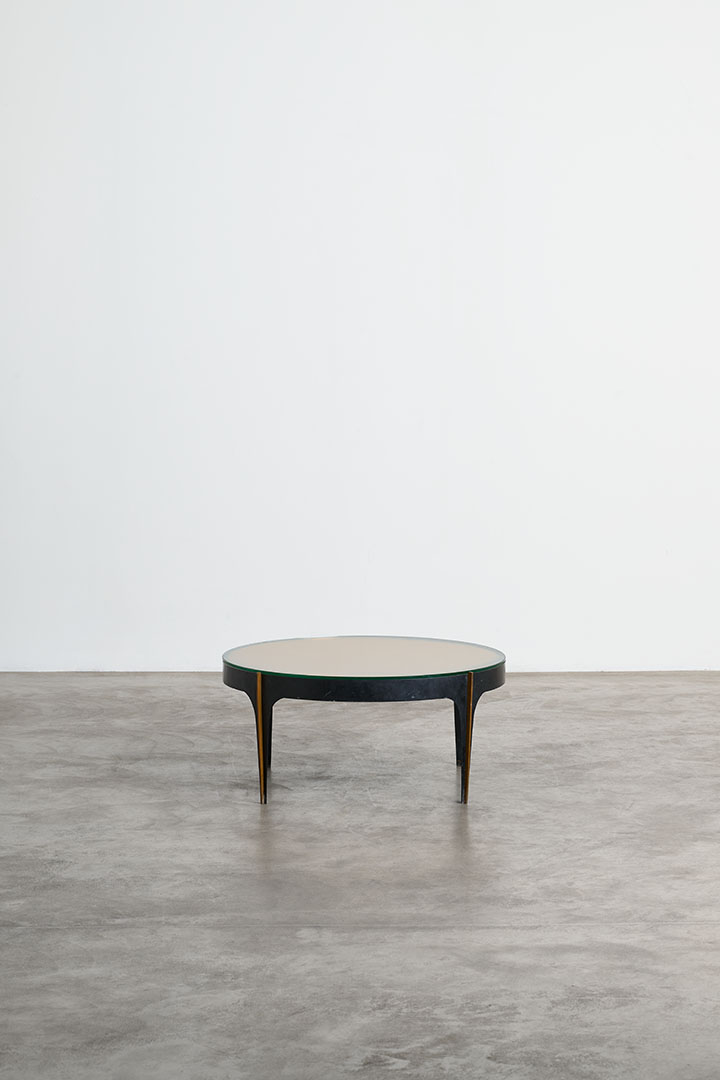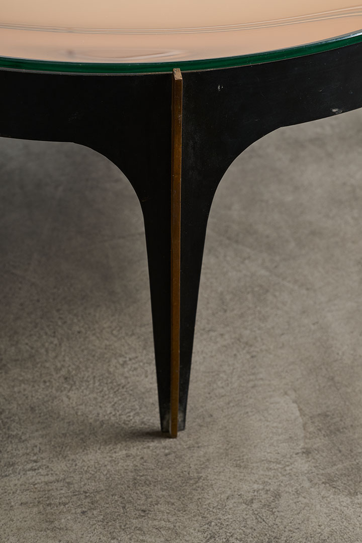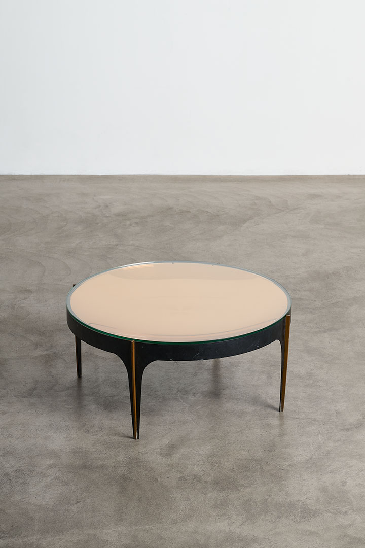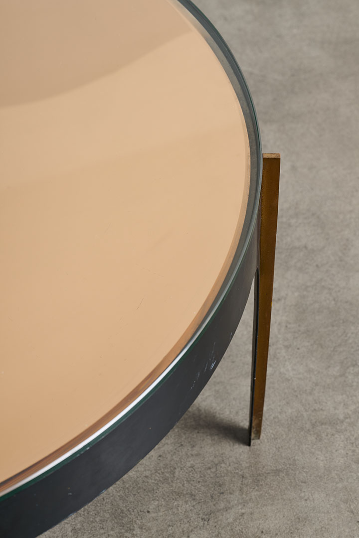 Designed in Italy in the 1950s and manufactured by Fontana Arte, this vintage low table mod. 1774 reflects a pioneering exploration of glass, light, and industrial refinement. The composition pairs a painted metal base with brass profiles and a clear glass top, beneath which a concave mirrored glass insert in amber tone creates a remarkable optical depth. The interplay between reflection, transparency, and color transforms the surface into a shifting visual field, where material precision and atmospheric perception converge.