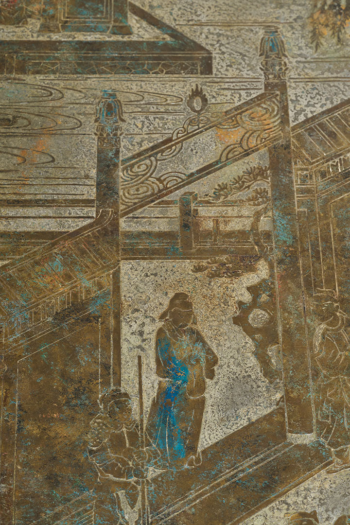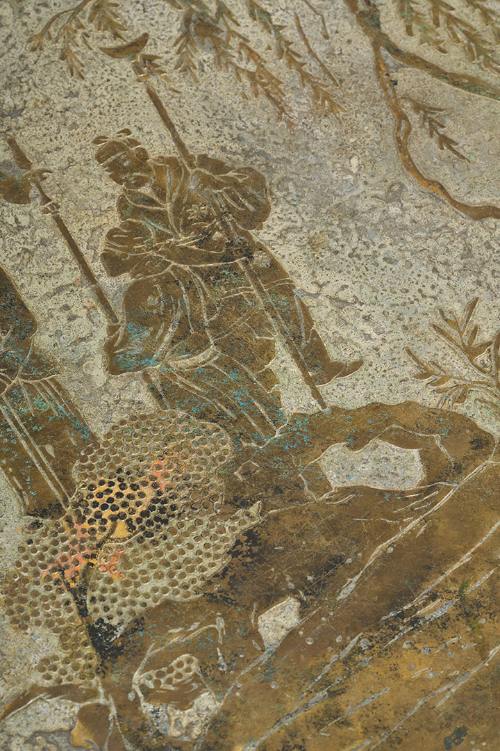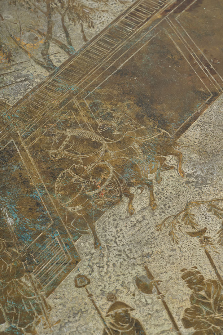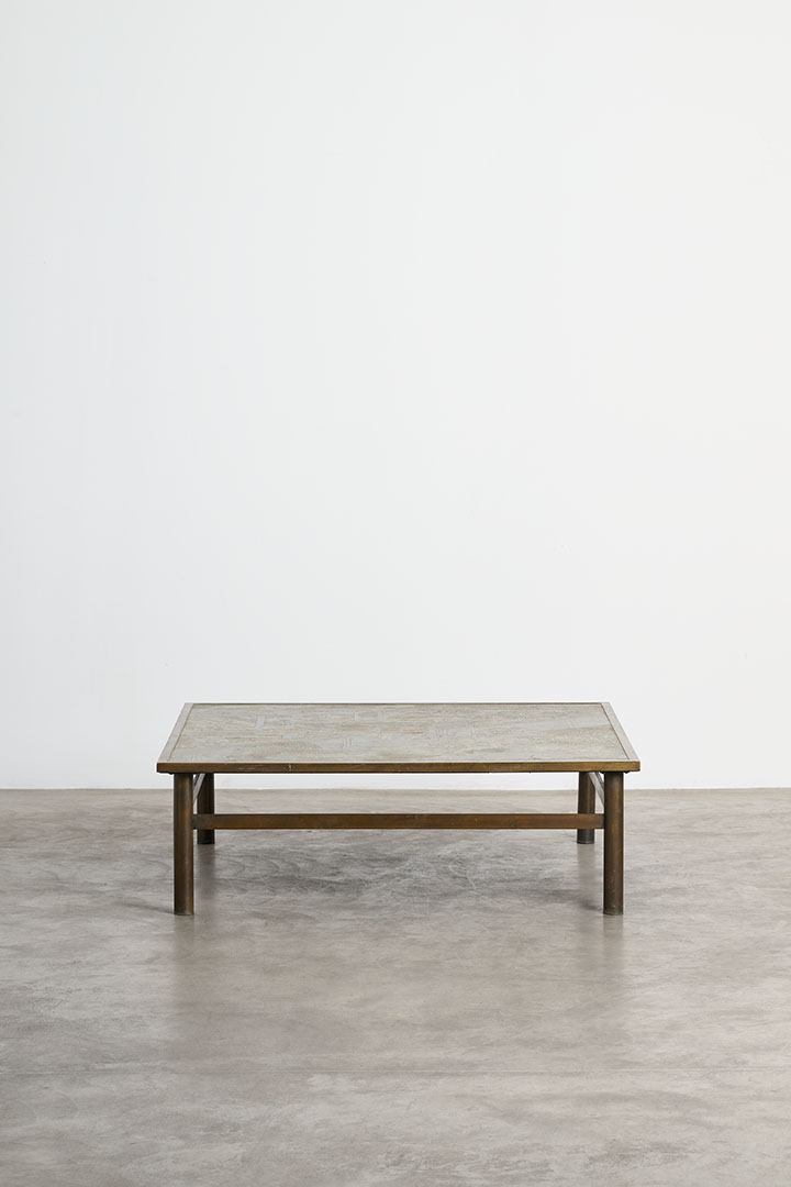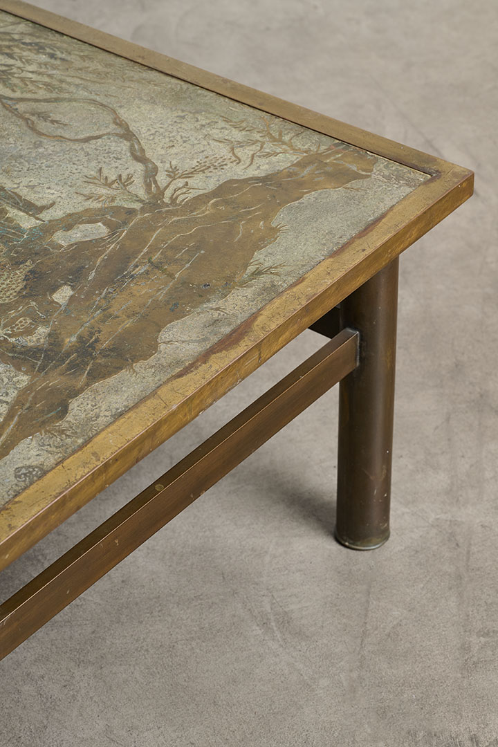 Crafted by Philip and Kelvin Laverne in the 1960s, this rare vintage low table is a masterpiece of artistry and craftsmanship. The intricate, multicolored engravings reflect the duo's mastery in blending ancient mythological motifs with modern design. Known for their sculptural approach to bronze, they experimented with chemical patinas, creating one-of-a-kind finishes. Their work remains highly sought after, rare on the market, and a testament to their innovative spirit.