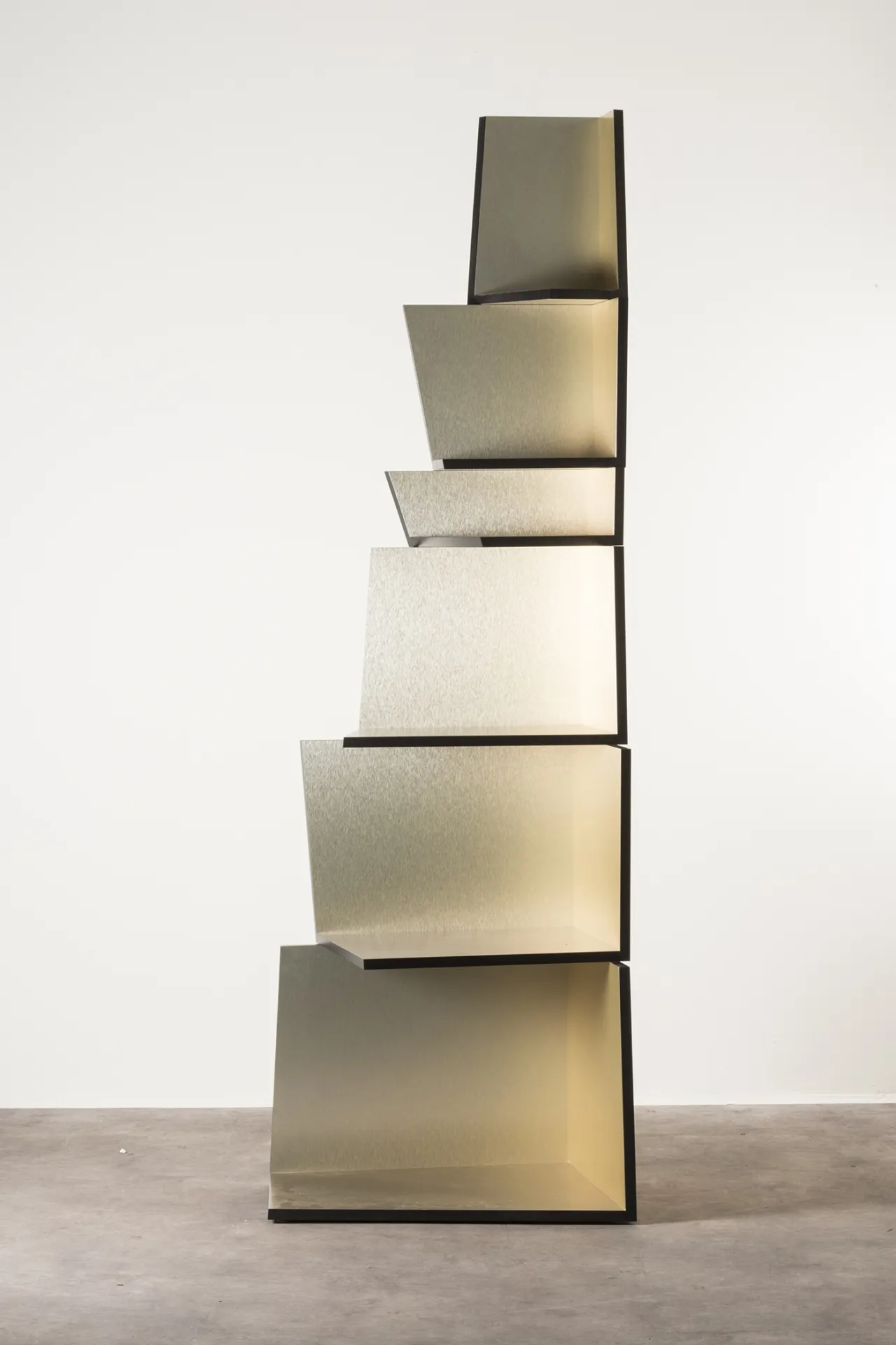 Glass components suspended in blue liquids evoke synthetic otherworldly gemmology, fragments of a landscape of wonder extracted from iridescent strata. The surface is shaped from a hybrid material in aluminum powder and polyurethane resin that creates fluctuations of texture. The patchwork of different surface qualities echoes a digital aesthetic, evoking artificial futuristic new forms of geology.