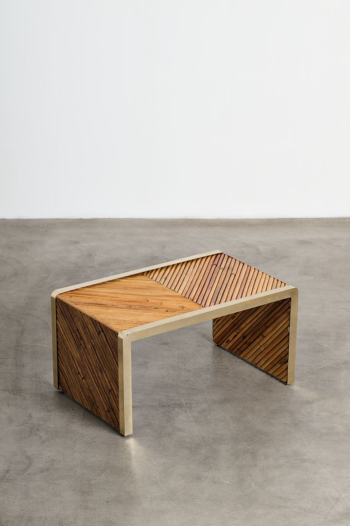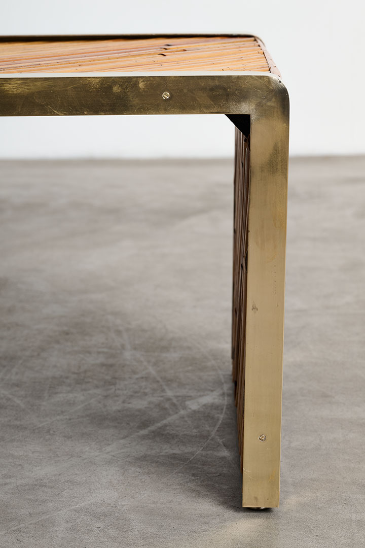 Bamboo arranged in a herringbone pattern with brass profiles.