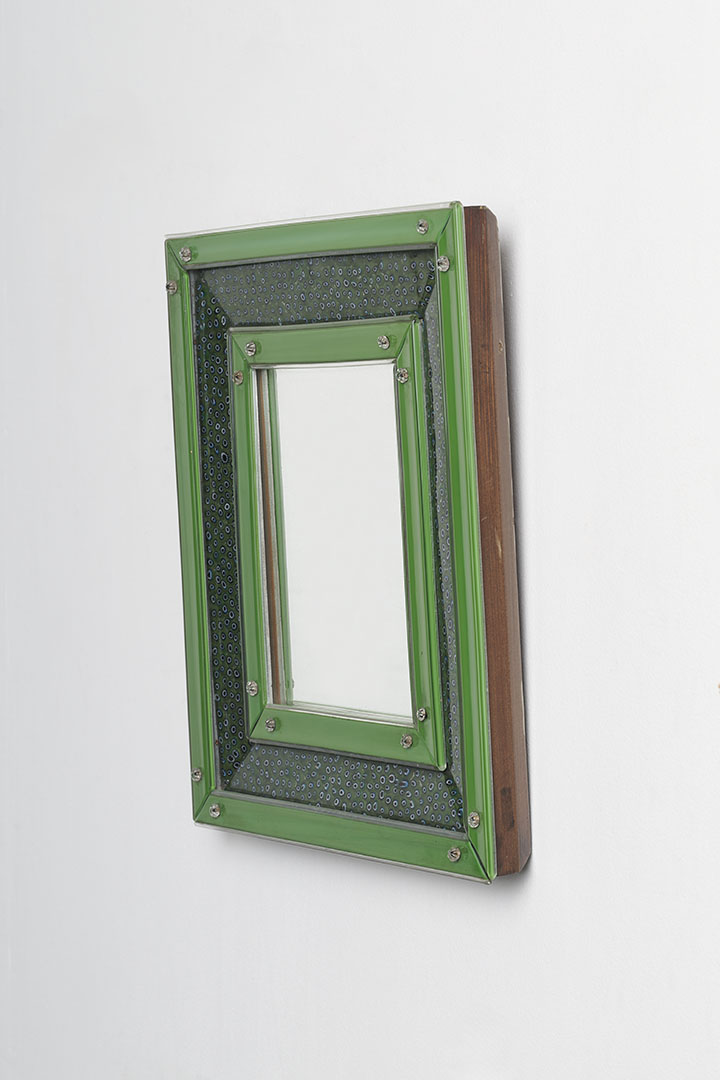 Colored Murano glass frame with antique green murrine decoration. Wooden structure. Original label.