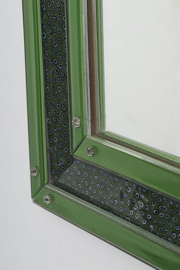 A Murano glass frame, featuring antique green murrine decoration, surrounds the reflective surface, enriching it with refined craftsmanship.The murrine technique, ancient and intricate, creates unique color patterns and a refined decorative balance. Original manufacturer’s label on the back.