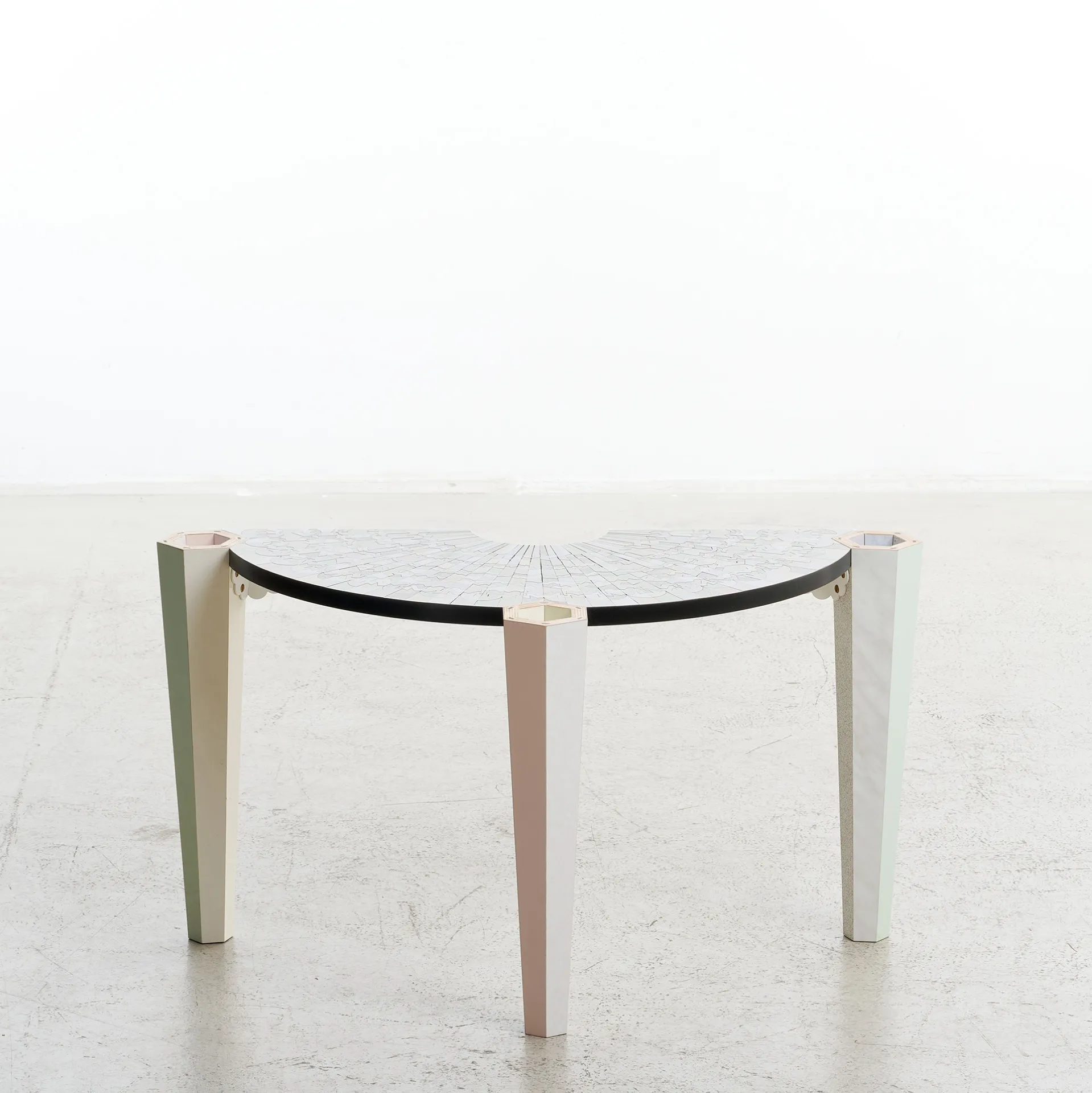 Play Time is a collection of inter-stacking tables that blends elegance with playfulness. Inspired by an antique Austrian bench, the design focuses on tapered hexagonal legs crafted with skillful techniques. The laminate tabletops crafted in collaboration with Abet Laminati feature dynamic, evolving patterns—ranging from Elizabethan collars to Deco architecture—creating a ‘Spaghetti Junction’ of inlays and texture.