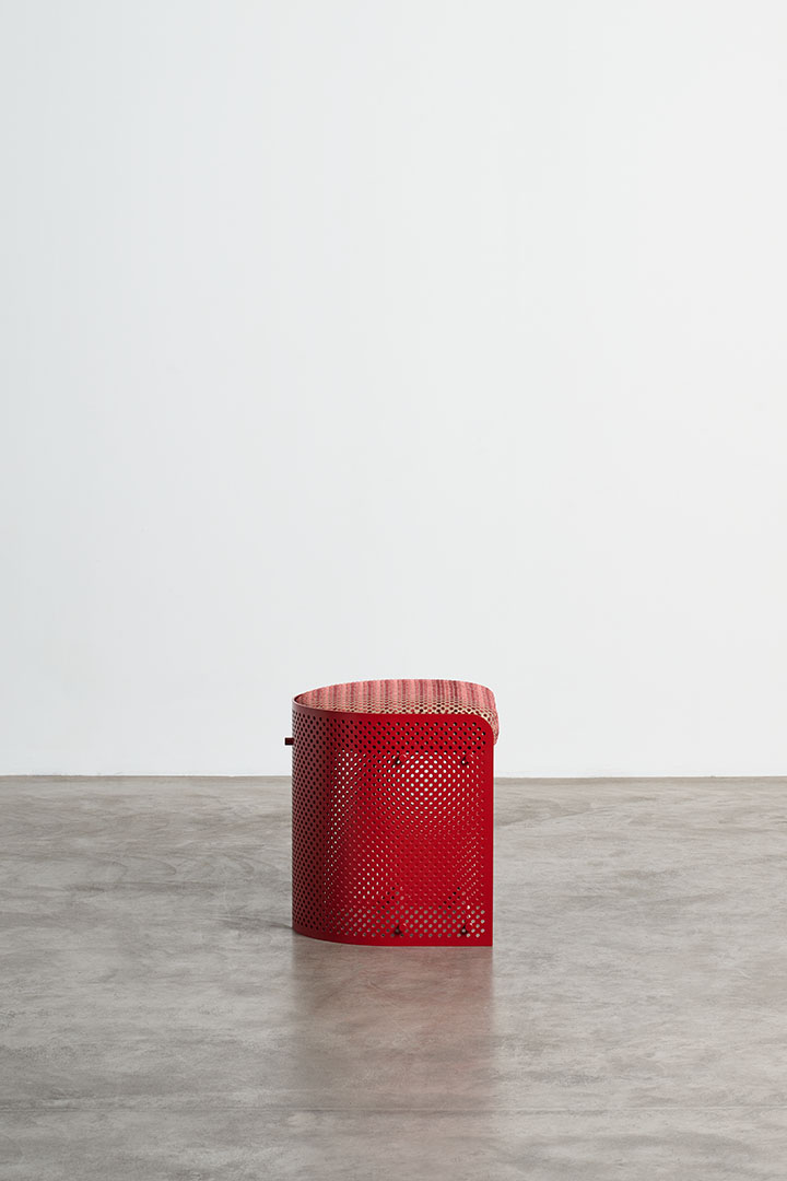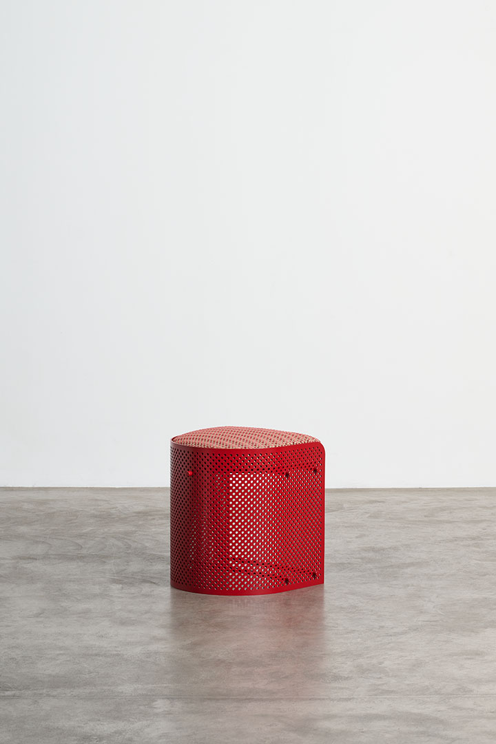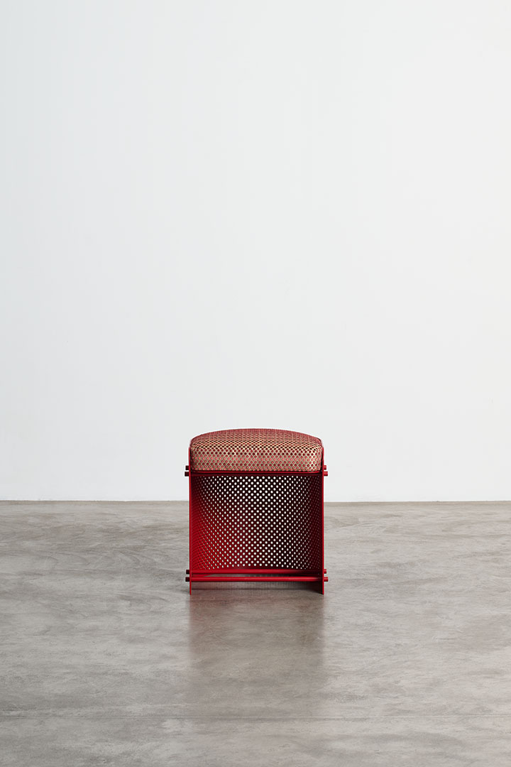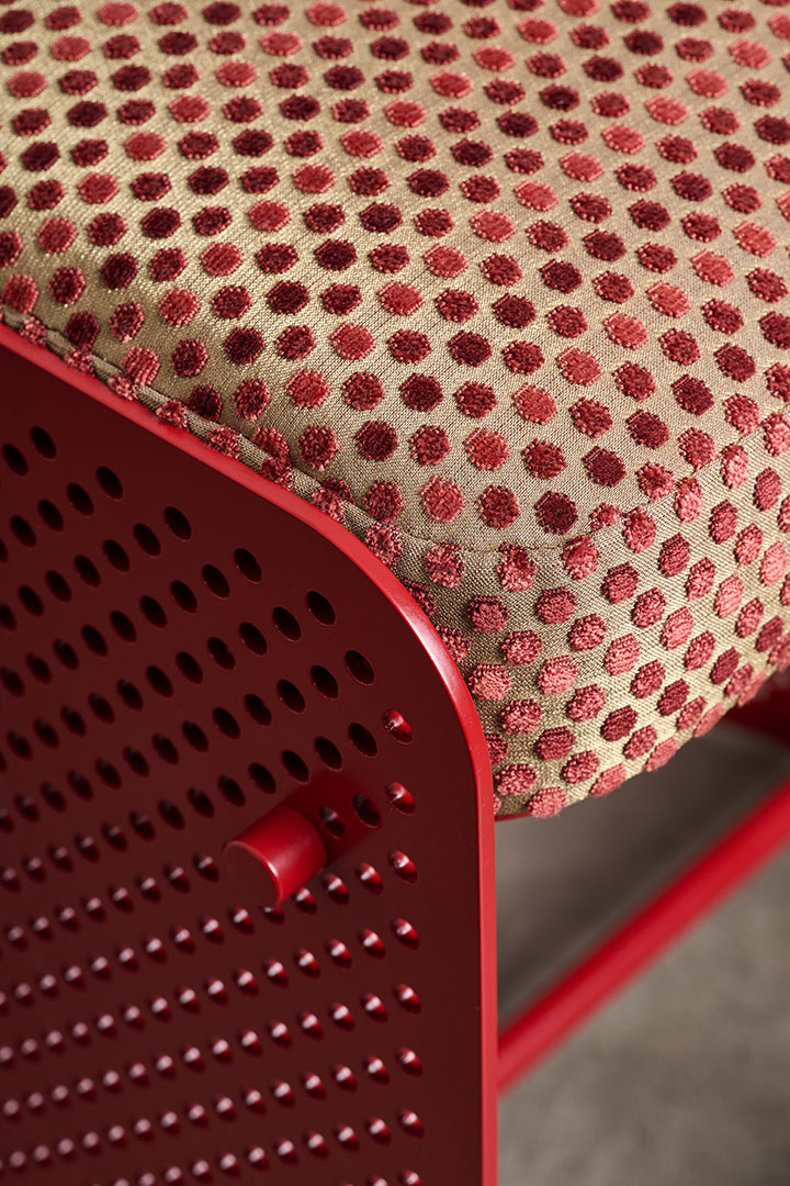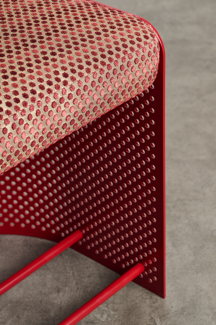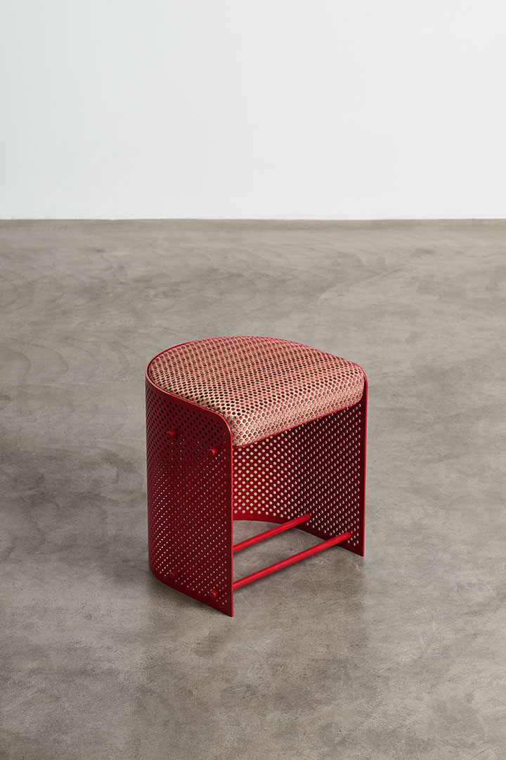 Designed by Andrea Mancuso, the Punteggiato stool explores the structural potential of perforated aluminum, where a single curved sheet becomes both surface and support. The perforations lighten the visual presence while enabling a precise construction system that ensures stability. Completed with cushions upholstered in Rubelli’s historic Punteggiato fabric, designed by Gio Ponti in the 1930s and first presented at the 1934 Venice Biennale, the seat establishes a dialogue between metal and textile, translating pattern into a shared visual rhythm.