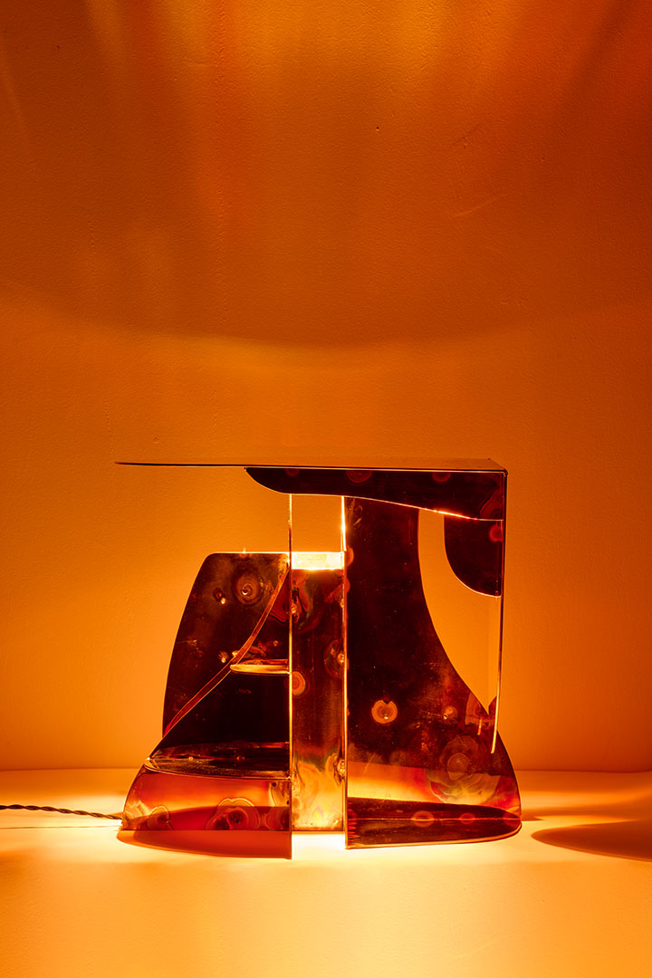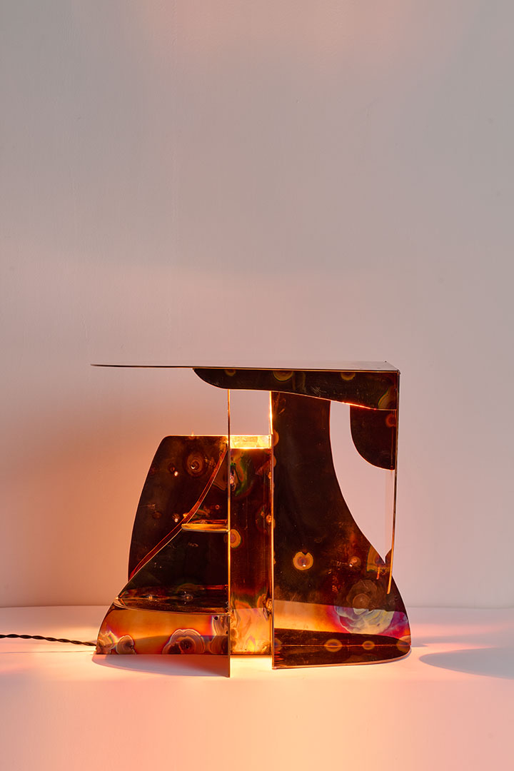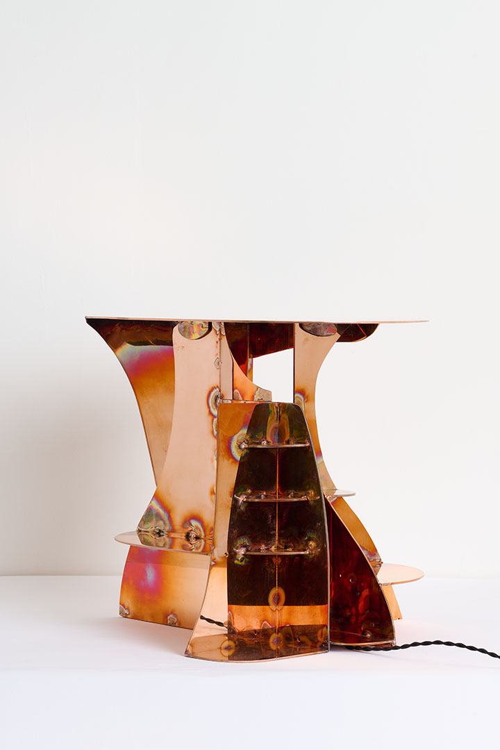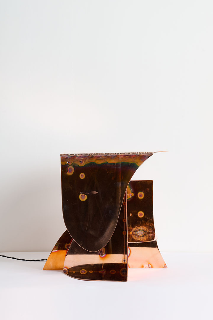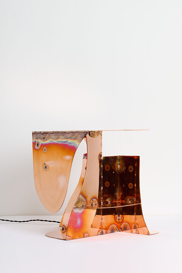 Designed by Carlo Lorenzetti, the Copper wall lamp transforms flat copper plates into sculptural volumes, bringing a sense of depth and material tension to a wall-mounted composition. Single drawn contours guide the cut, creating intersecting curves that merge geometry and organic movement. Each element is polished before assembly so the final structure retains vivid heat marks, traces of the intense energy, rare skill, and material commitment required to shape copper into a dynamic and harmonious form.