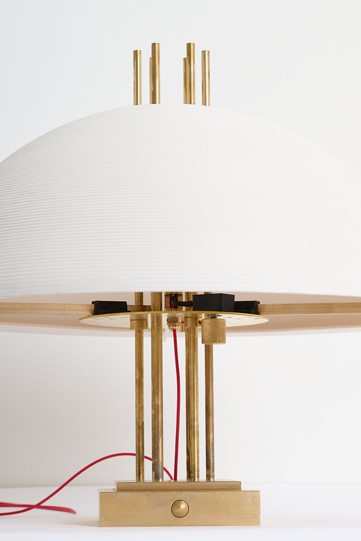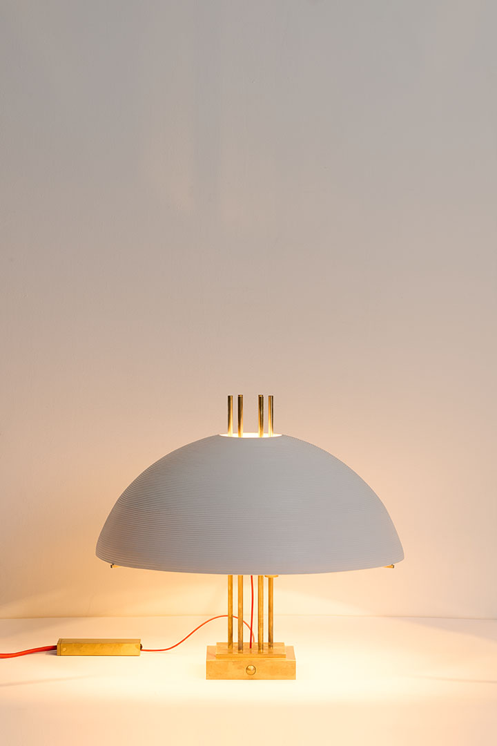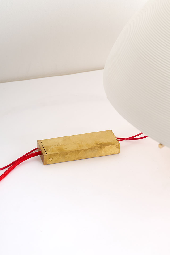 Designed by Robinson Ferreux Maeght, the Transatlantique Estate lamp expresses a refined vision of craftsmanship, evoking the golden age of ocean liners where design embodied both grandeur and precision. Its sculptural brass base supports a luminous porcelain diffuser, an object born from a rare convergence of artisanal expertise. Each curve carries the memory of hands, kilns, and time, transforming light into a soft, luminous presence.