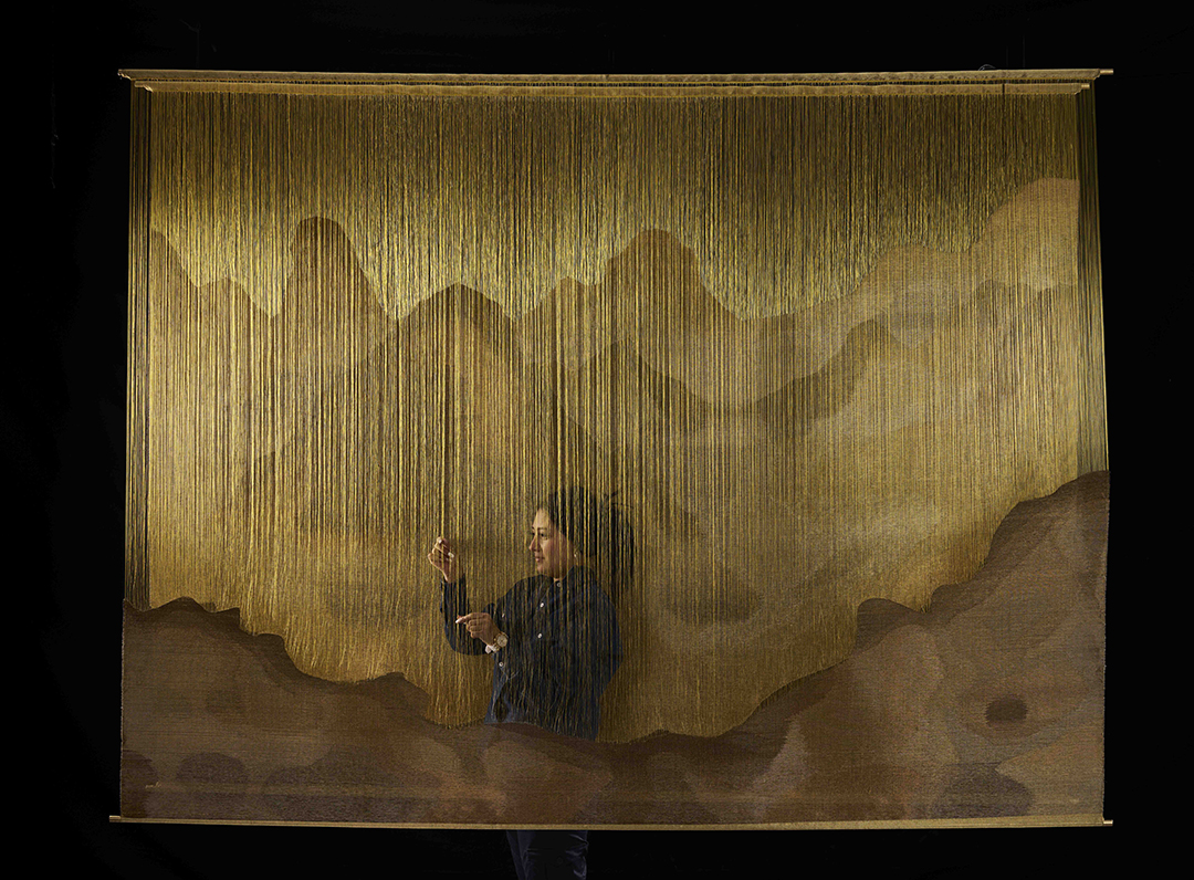 From the delicate tradition of Chinese watercolors comes this captivating tapestry. Inspired by the ethereal landscapes depicted therein, it celebrates the artistry and cultural richness of the Land of the Rising Sun. Woven by hand with meticulous craftsmanship, it displays a combination of exquisite materials and rich iridescent intertwine, where each thread is carefully selected. The natural fibers in warm and earthy tones meet the copper and silver metallic warp, creating an extraordinary visual narrative.