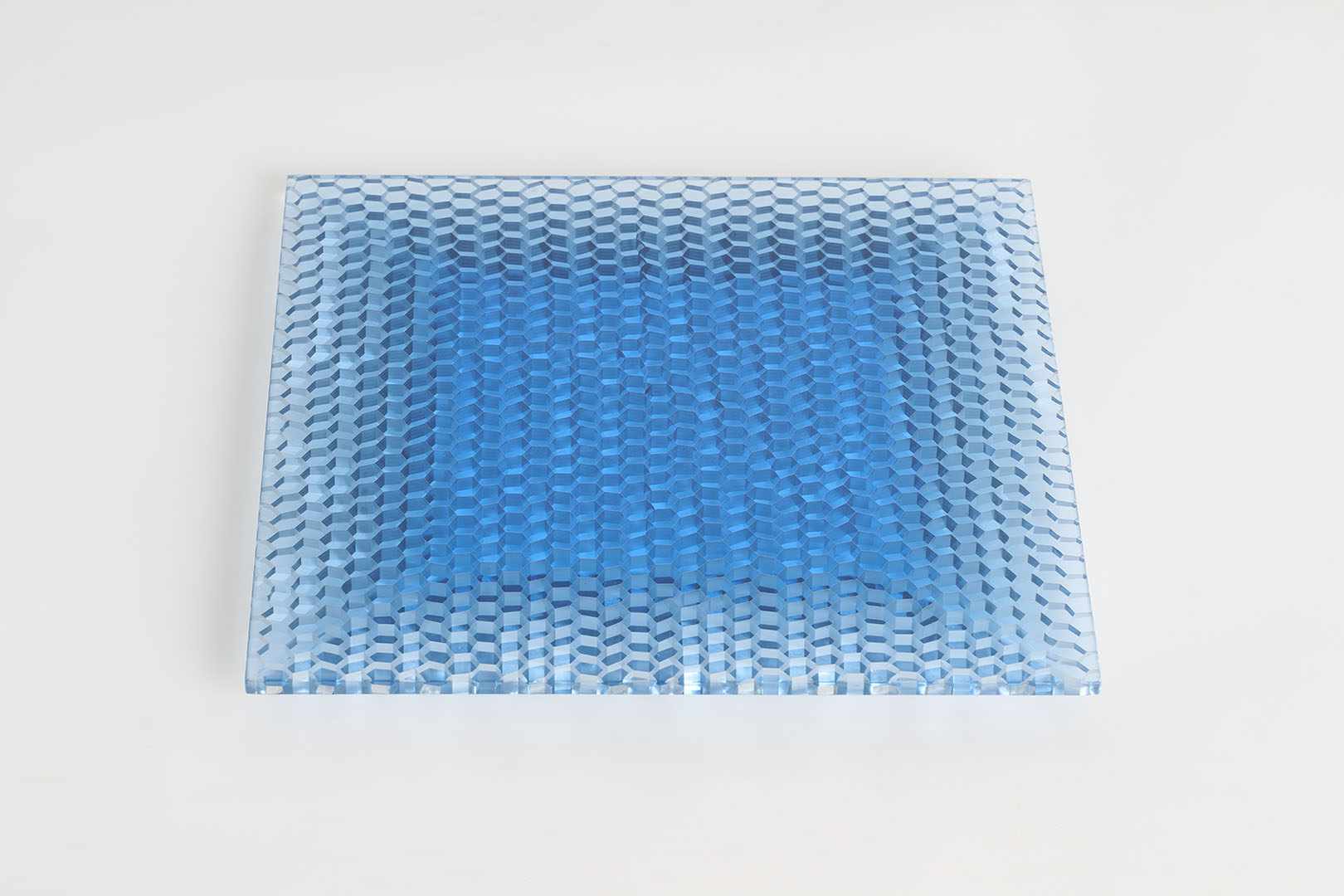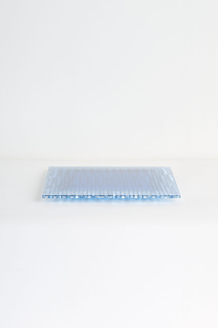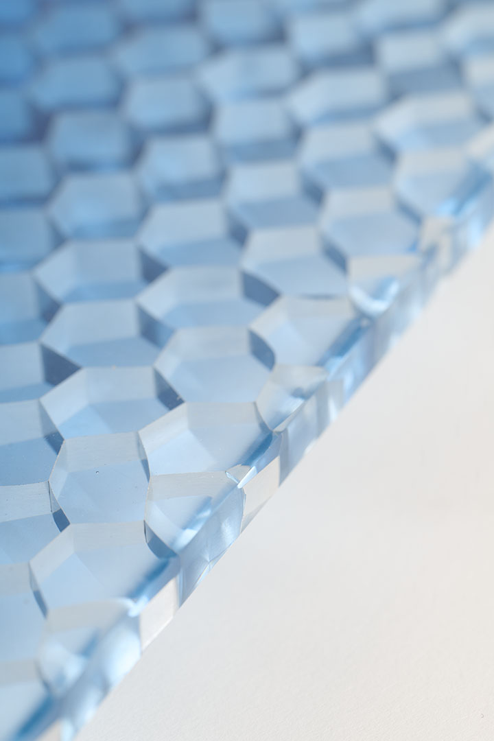 Designed by Marco Lavit in collaboration with Azimut Design, this tray explores a new frontier in material innovation. Crafted in amber epoxy resin and aluminum honeycomb, the piece emerges from an advanced research process that structurally integrates the two elements into a single composite material. Known for its hexagonal cellular structure, honeycomb offers exceptional strength and lightness. Encased through a controlled epoxy casting process, the structure becomes stabilized and luminous, revealing metallic reflections and warm amber tones. The result is a surface that appears almost liquid, where technical precision and material depth merge into a refined architectural presence.