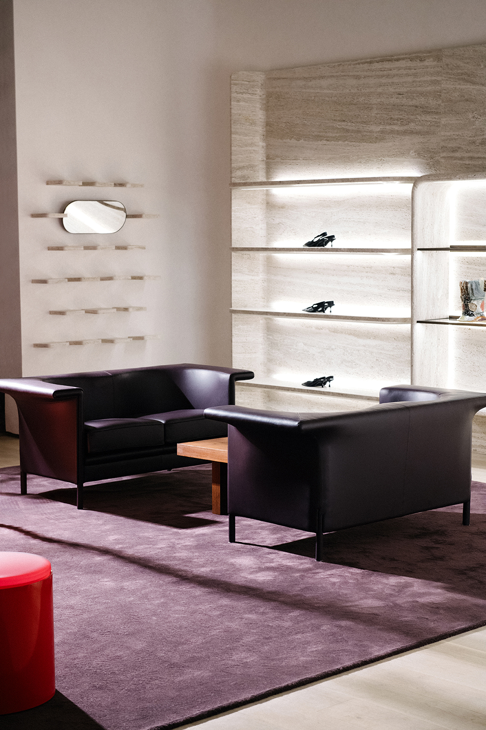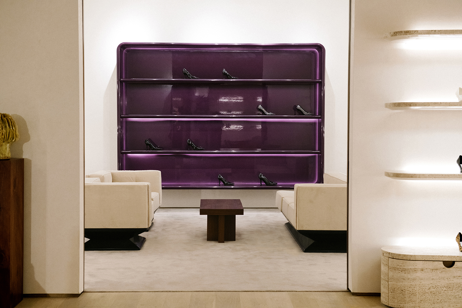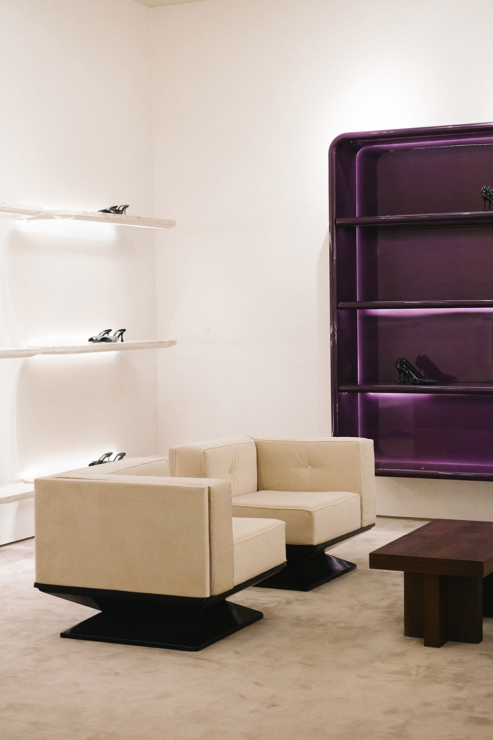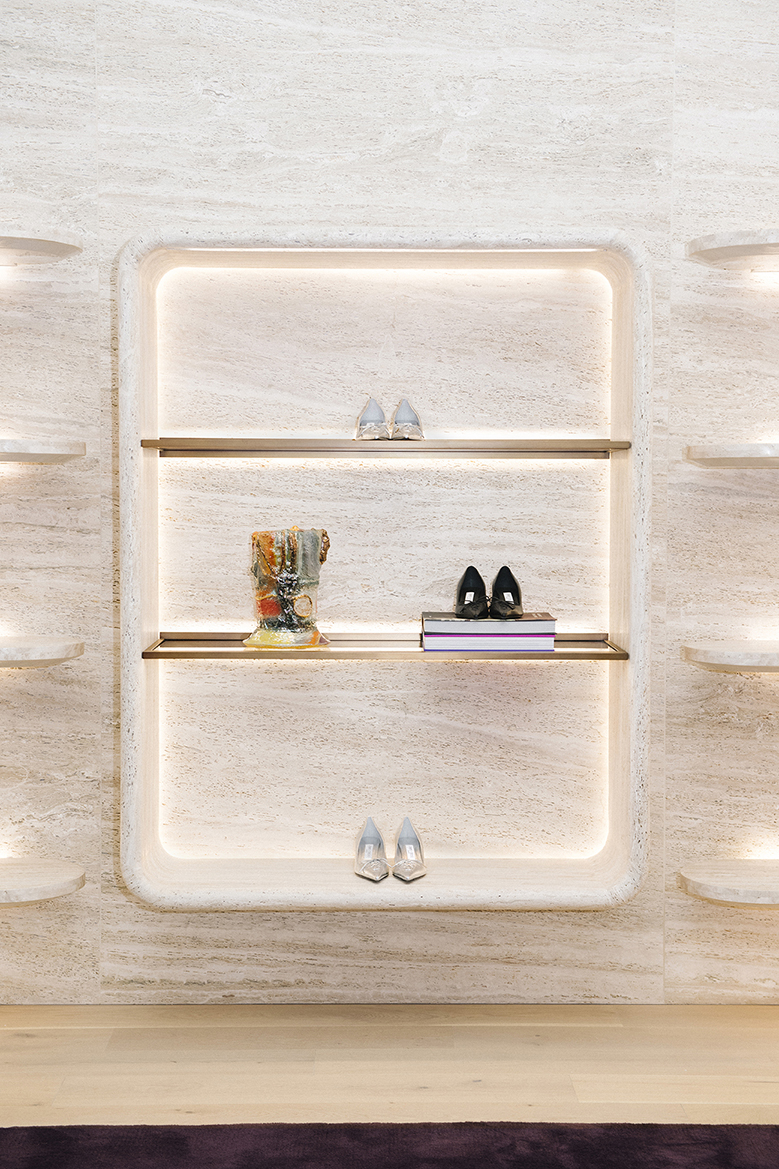 For Jimmy Choo’s Madison Avenue flagship, Nilufar contributed to shaping the boutique’s refined interior, integrating mid-century furniture, curated lighting, and luxurious materials such as walnut, travertine, and velvet. The design creates intimate, jewel-box–like spaces where the brand’s iconic shoes and accessories are showcased, blending contemporary elegance with a sense of timeless sophistication.